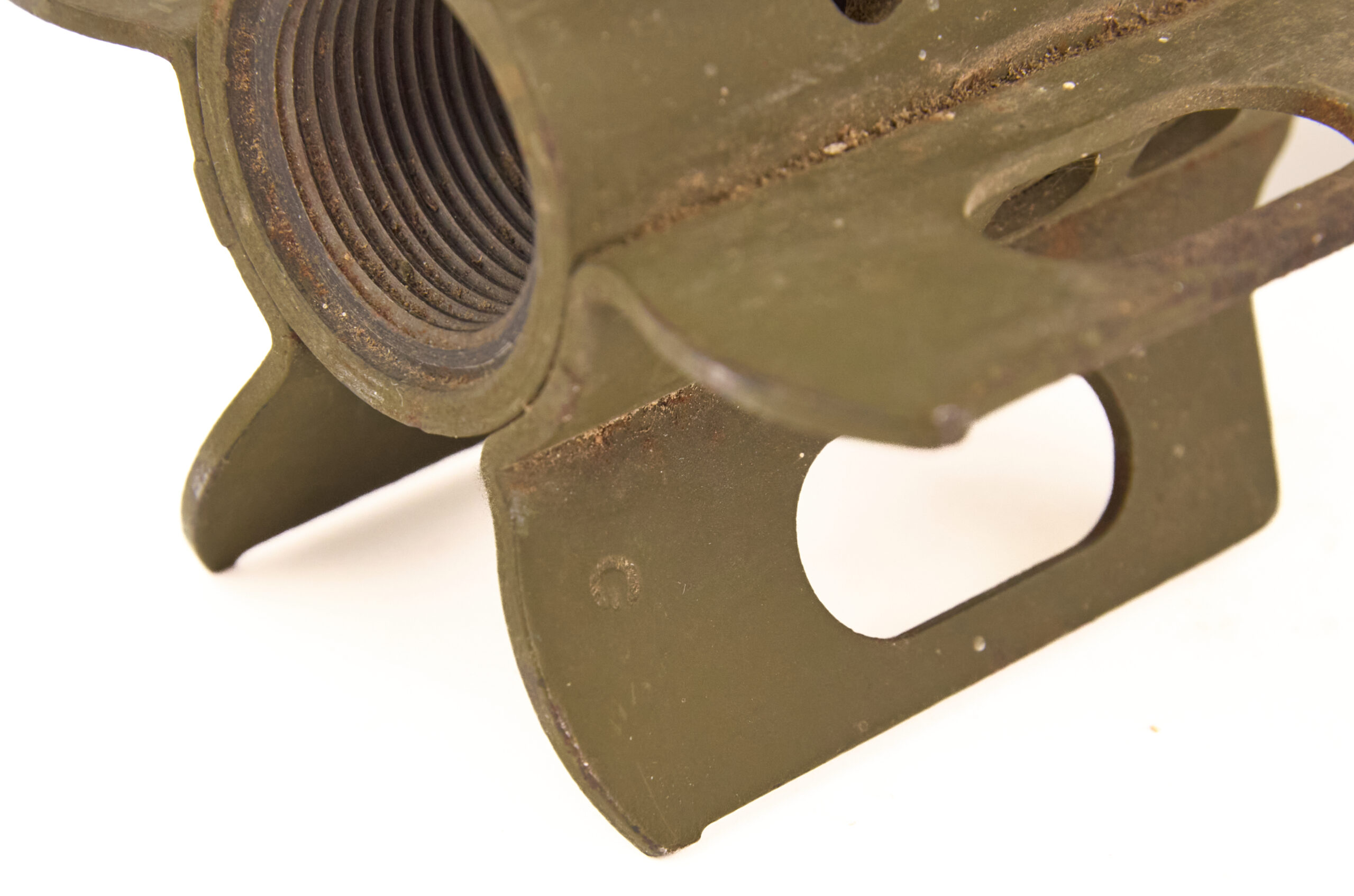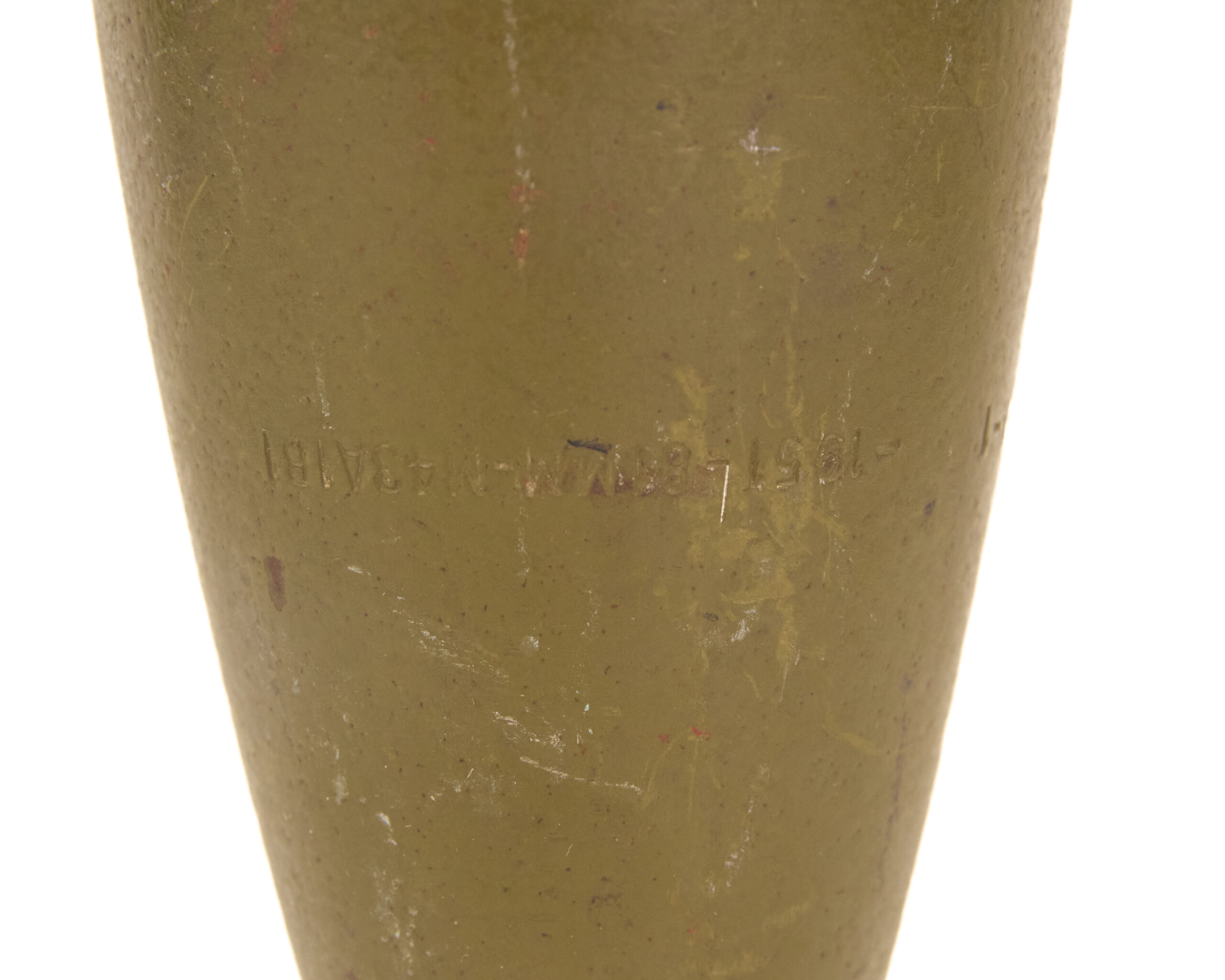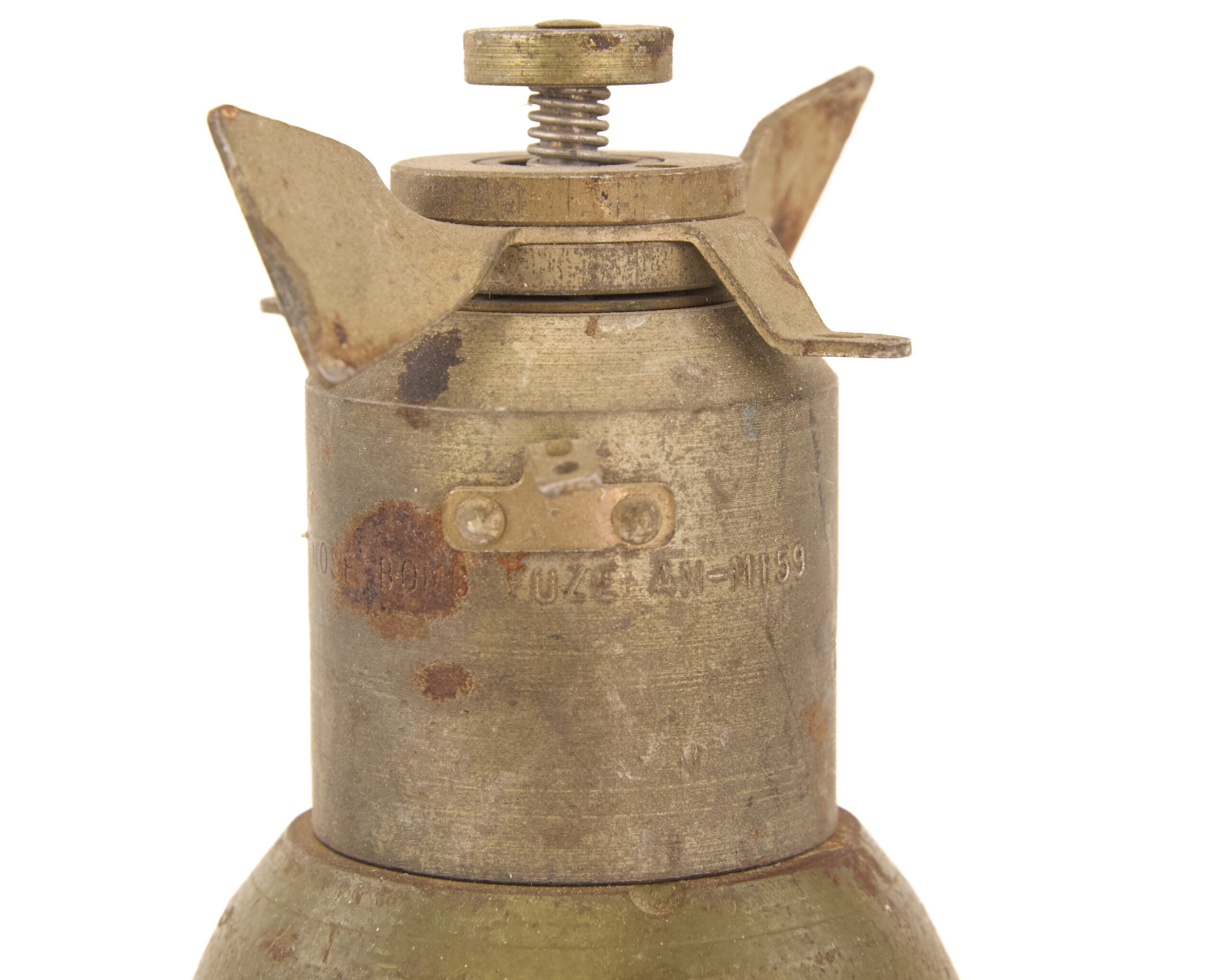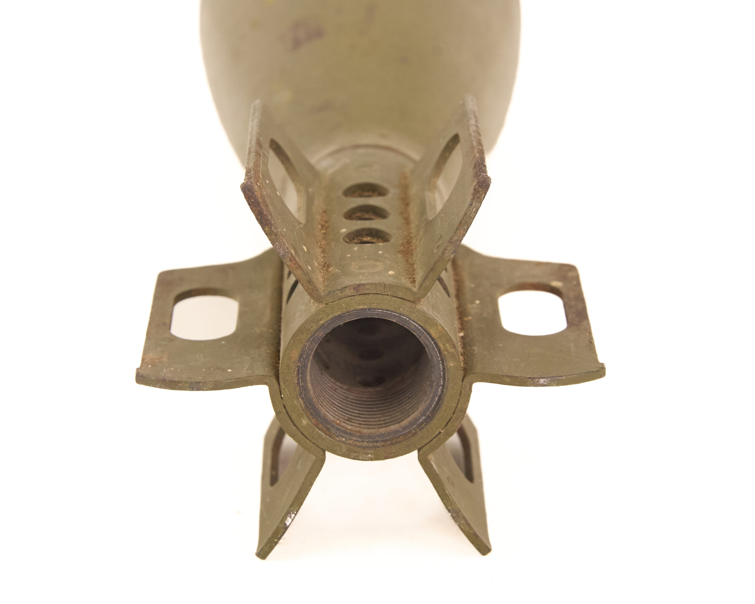 This example presents well overall as an inert ordnance display piece. The body retains its correct olive drab military finish and clear service profile. The fuze remains in place, and the fin assembly is intact, which is important for overall presentation. Light age, handling wear, and finish loss are present in places, but the round remains a clean and highly recognizable example.