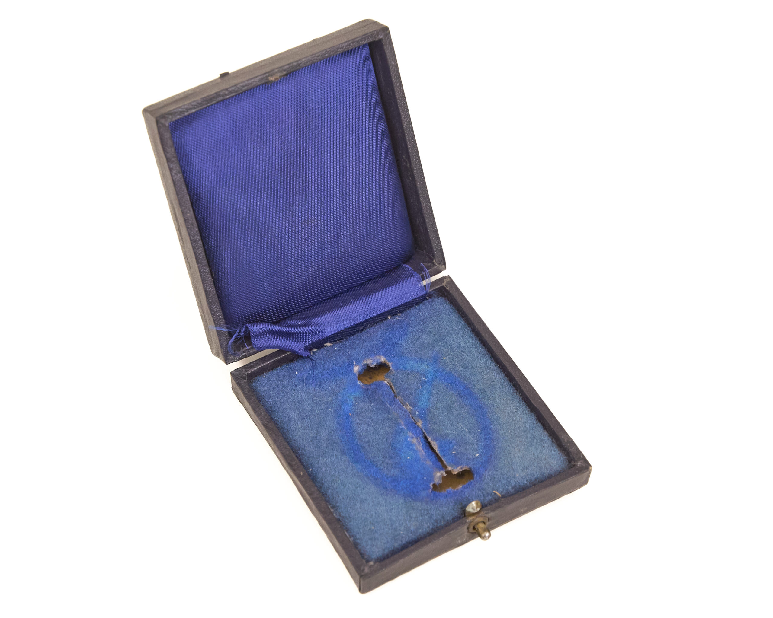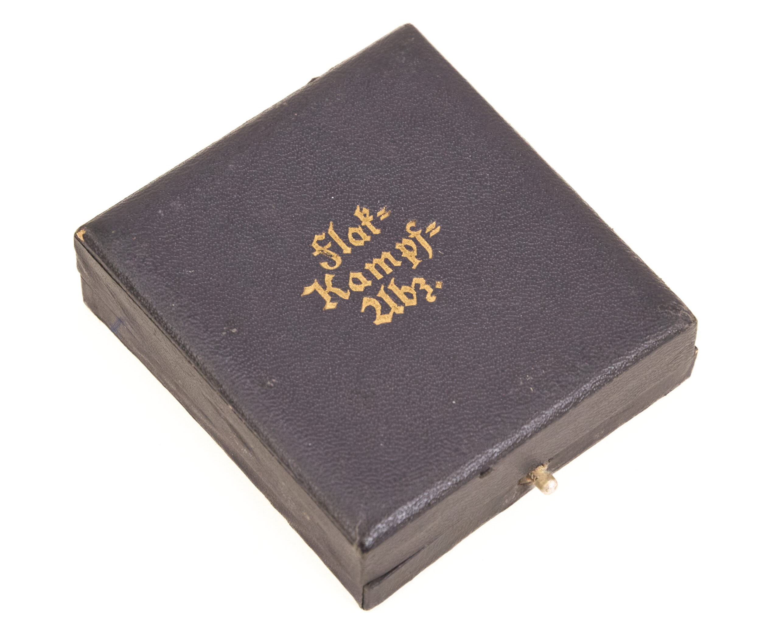 Accompanying the badge is a square presentation case finished in black faux leather with a push-button opening. The interior is lined in blue rayon, with a matching hinge cover and a blue felt badge insert. The exterior lid is embossed in gold lettering reading “Flak Kampf Abz.”.