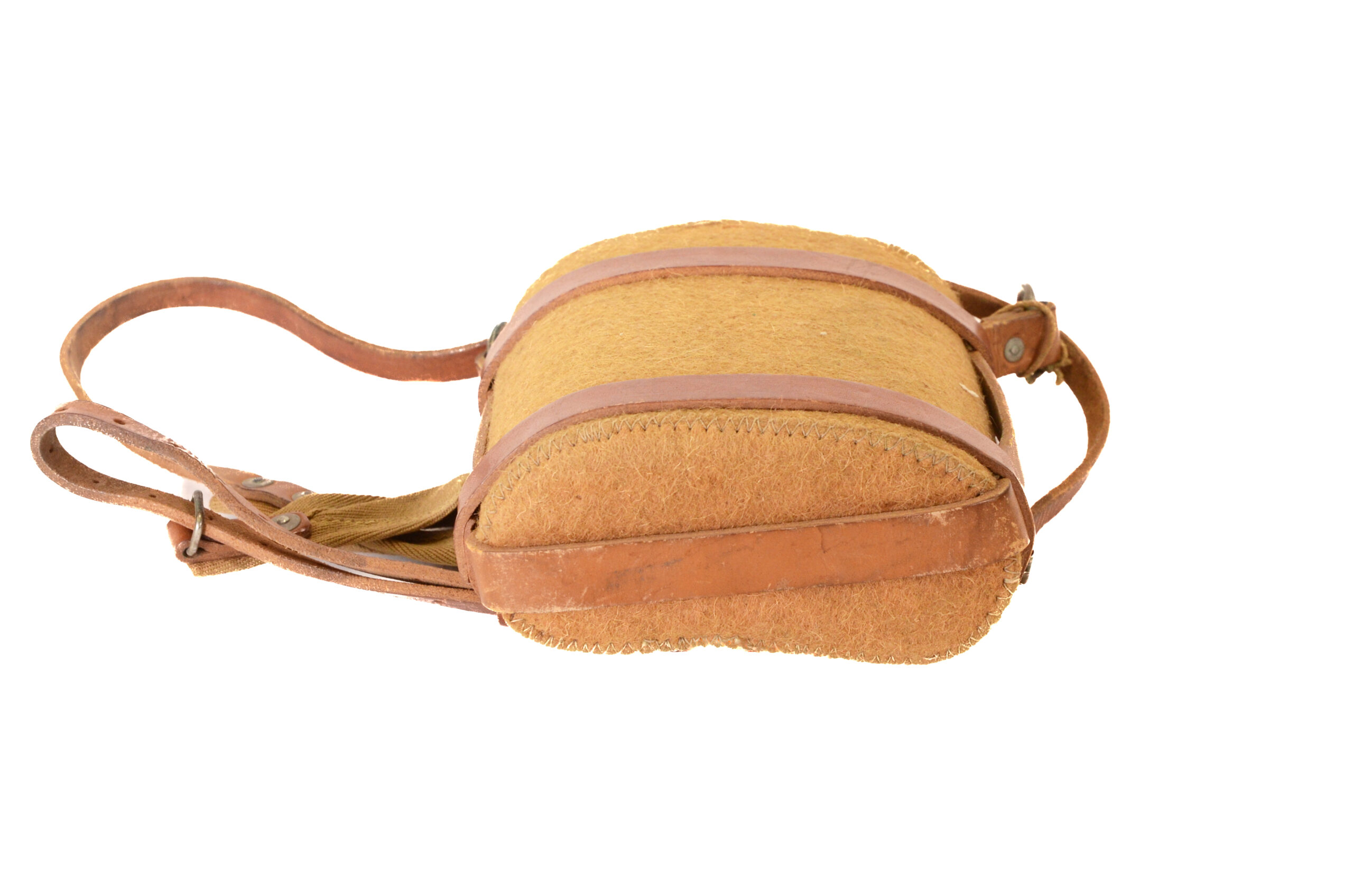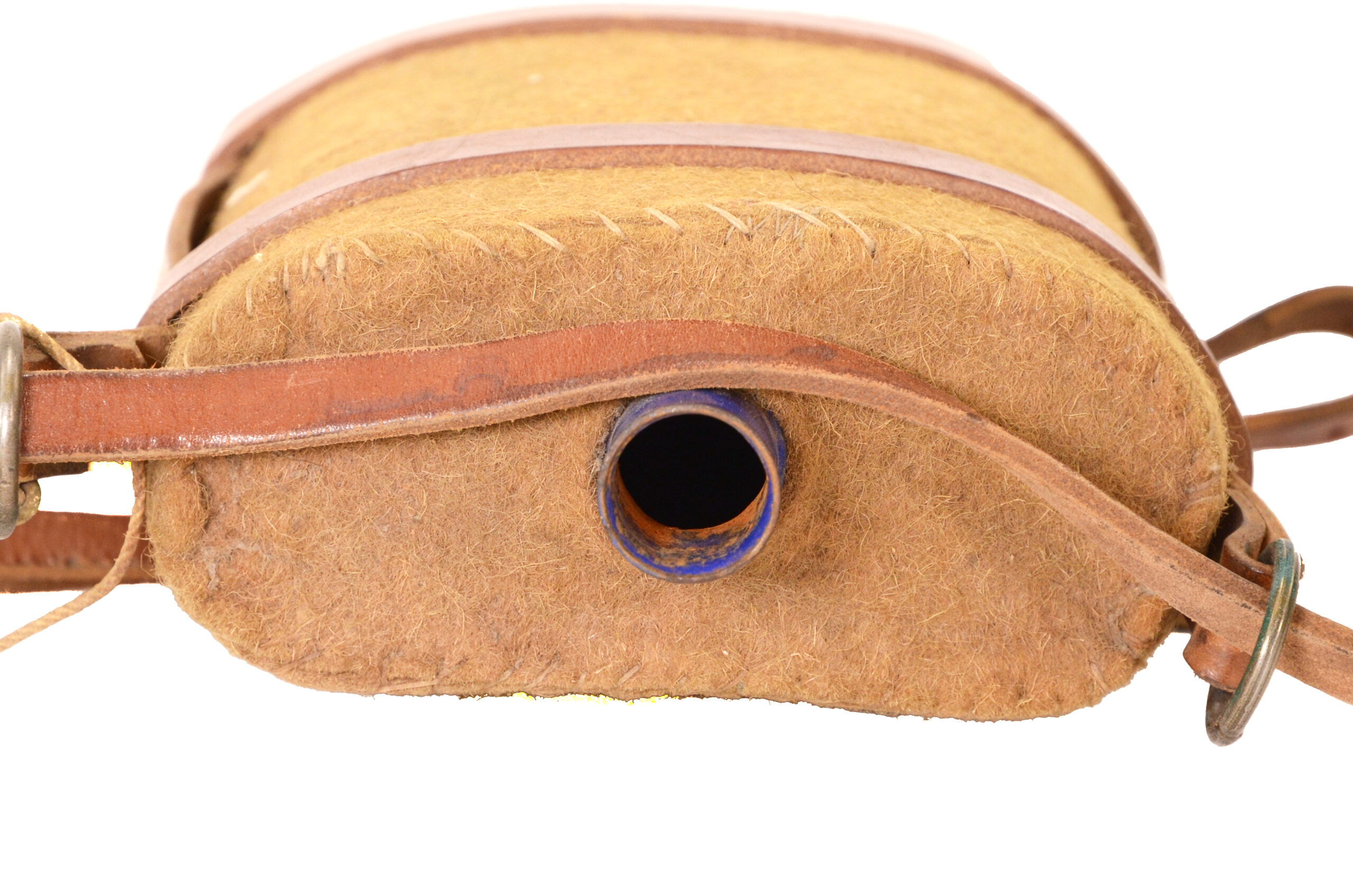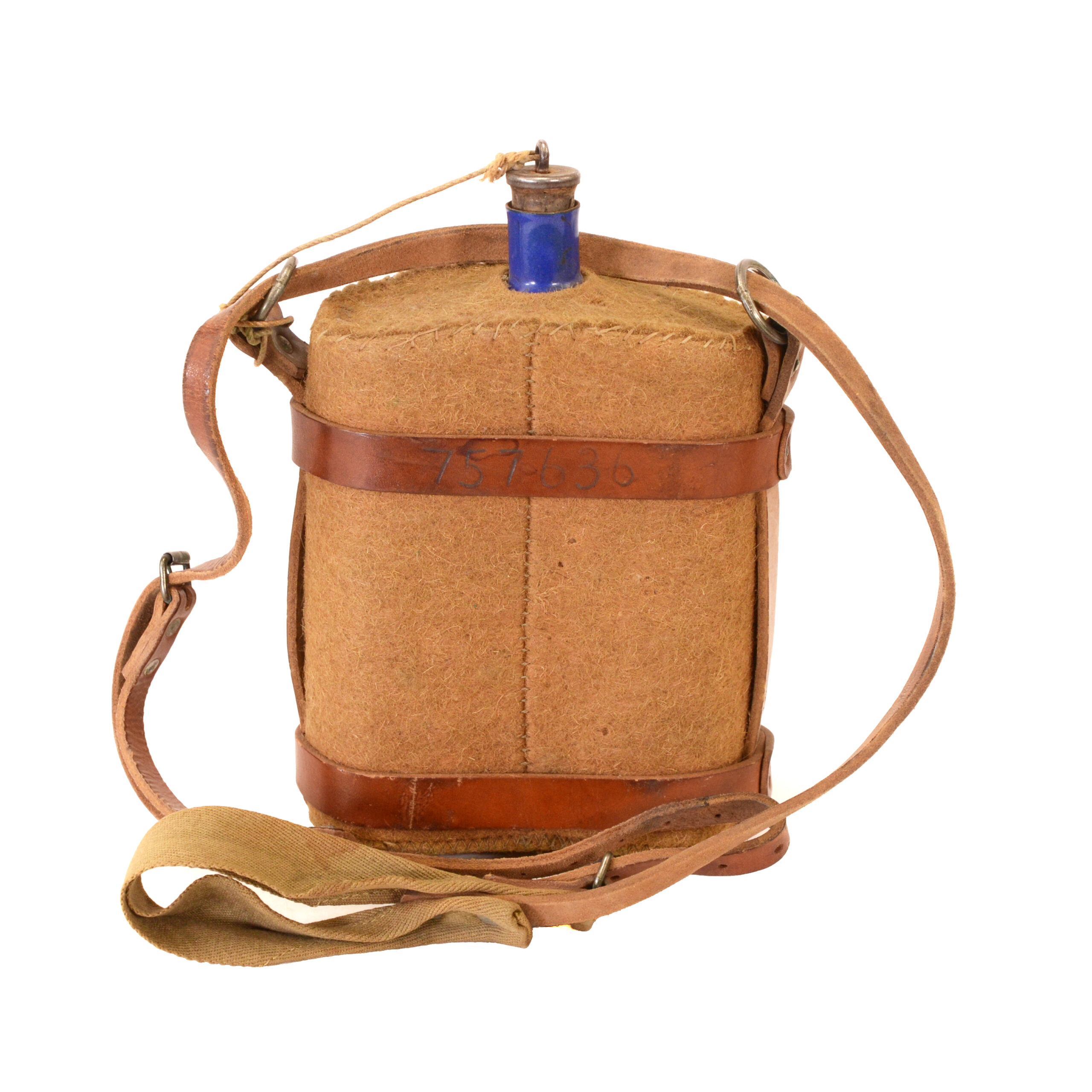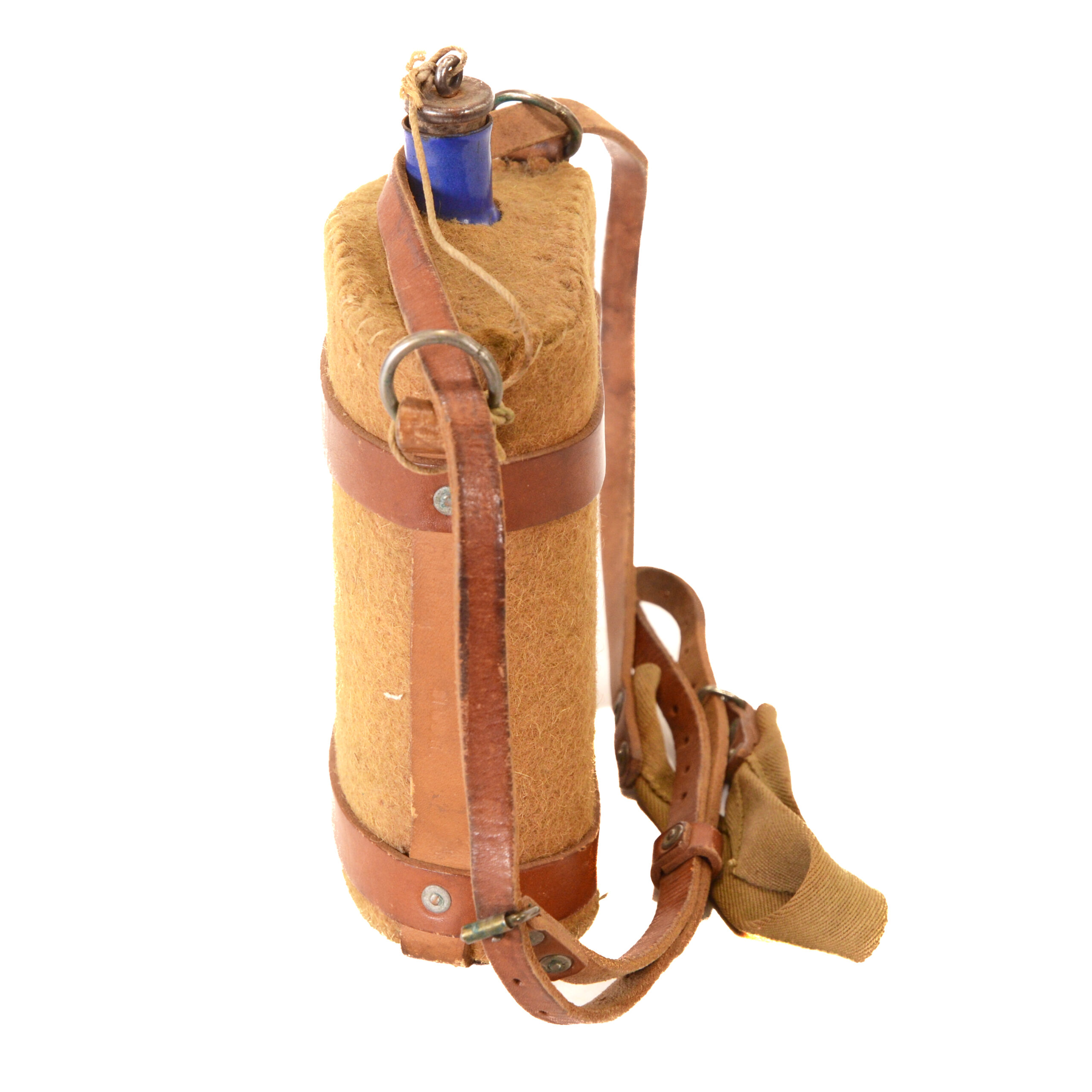 This is a well-documented example suitable for display with British WWI uniforms, trench equipment groupings, or militaria reference collections. The combination of enamel canteen, felt cover, cork stopper, leather harness, and canvas strap presents a wholly original ensemble that illustrates daily soldier life and equipment pragmatics on the Western Front.