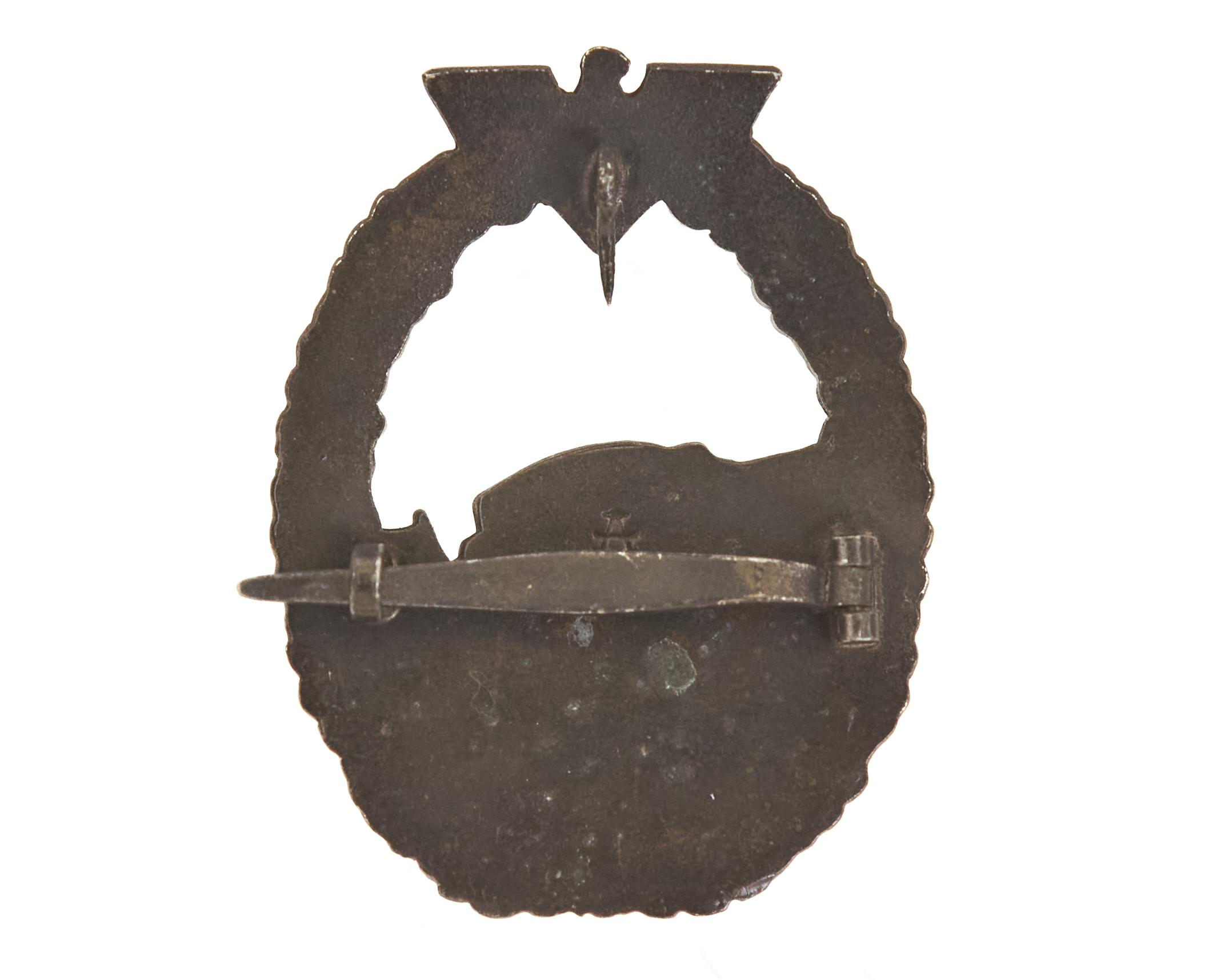 Designed by Ernst Peekhaus of Berlin, the badge features a side-view of an S-Boat cutting through stylized waves, surrounded by an oval oak leaf wreath tied at the base, and surmounted by a national eagle clutching a mobile swastika. Early first-pattern examples, such as this one, were typically struck in gilded and silvered tombak.