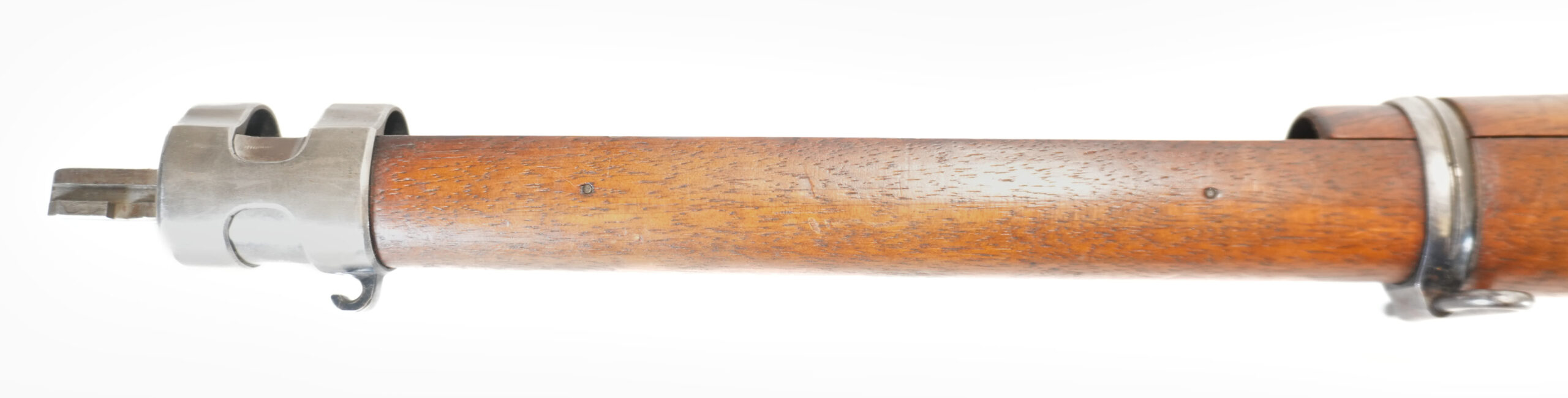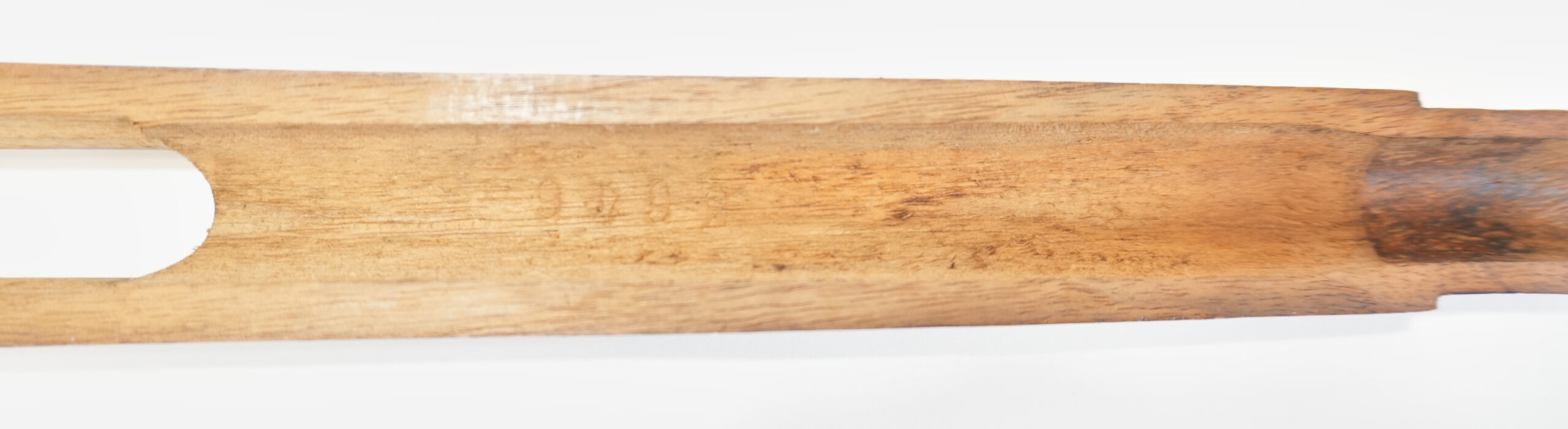 This is an original Brazilian M1908 Mauser full-length stock set, complete with upper handguard, front and rear barrel bands, and its military rack number “120” still visible on the right side of the butt. Carved from South American hardwood and shaped in classic Gewehr 98 pattern, this stock fits the Model 1908 long rifle chambered in 7x57mm Mauser.