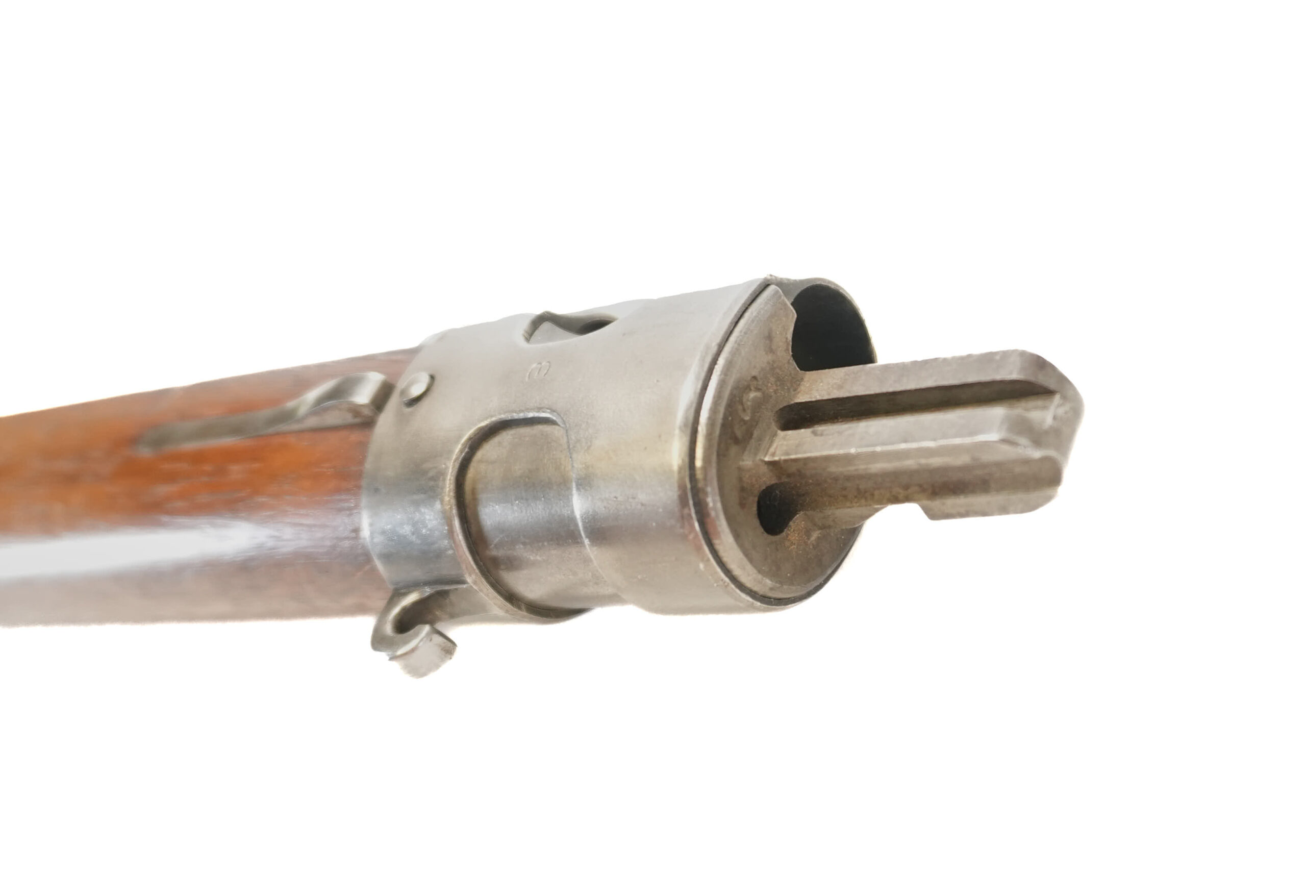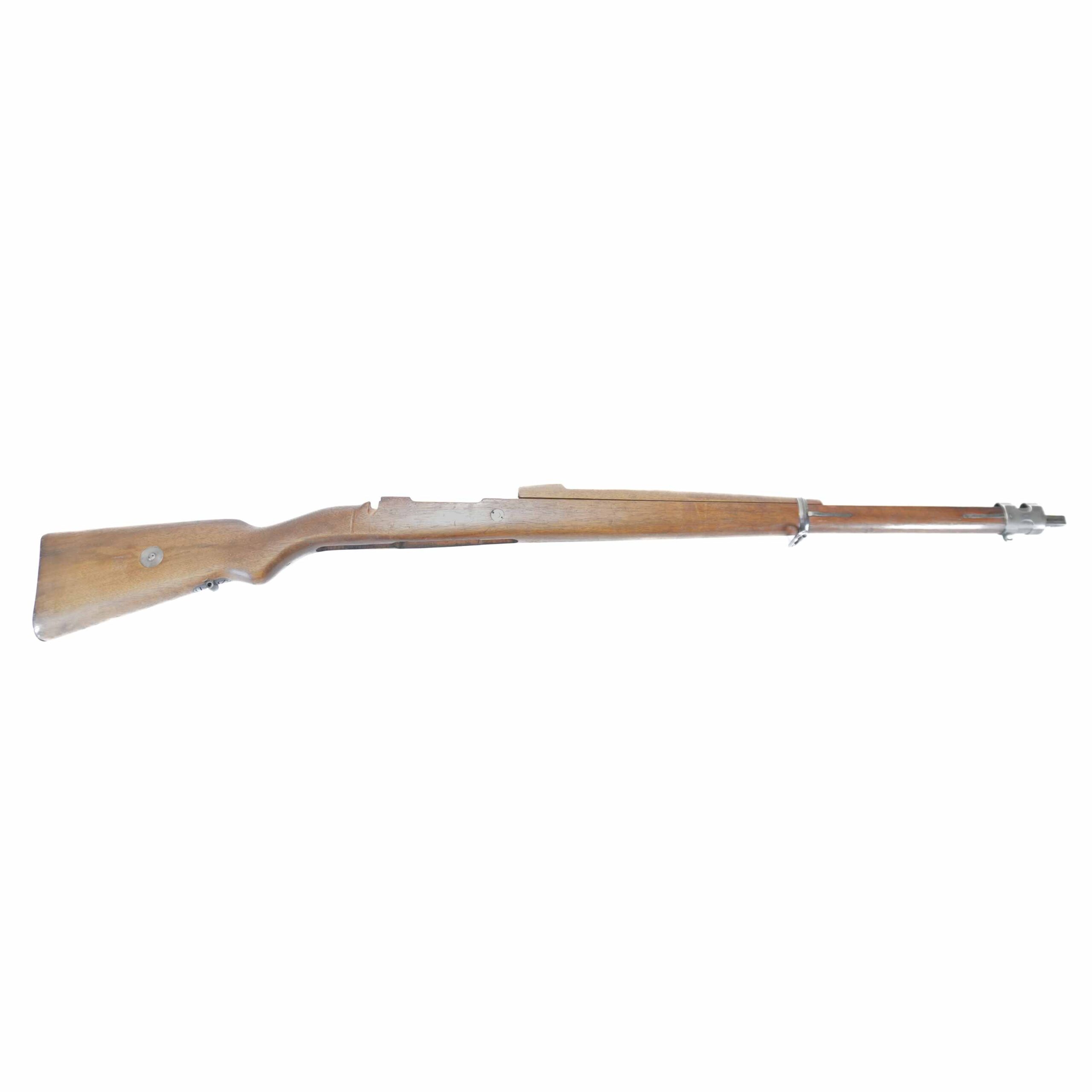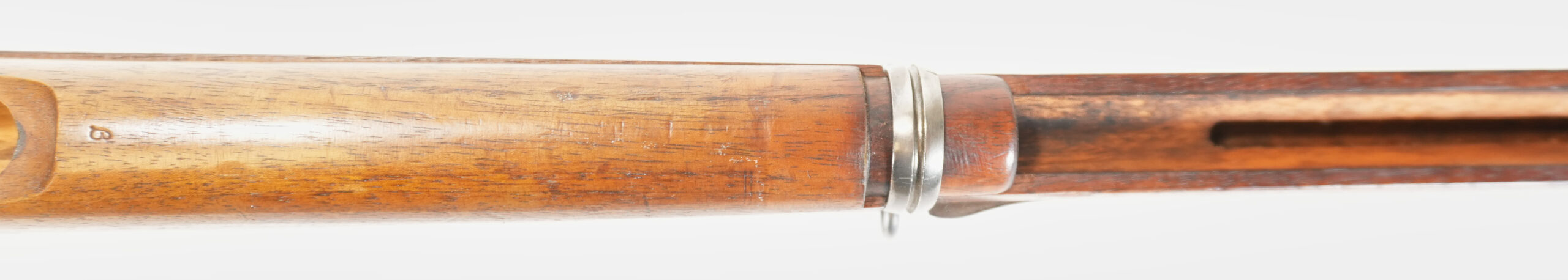 The right side of the buttstock bears the iconic “flag B” cartouche, used to mark arms accepted by the Brazilian military during the height of the country’s Mauser adoption program. The wood shows expected service wear—light handling dings and patina—but no cracks, major gouges, or structural damage. The handguard and both original barrel bands are included and correctly fitted, offering a matched look ideal for restoration.