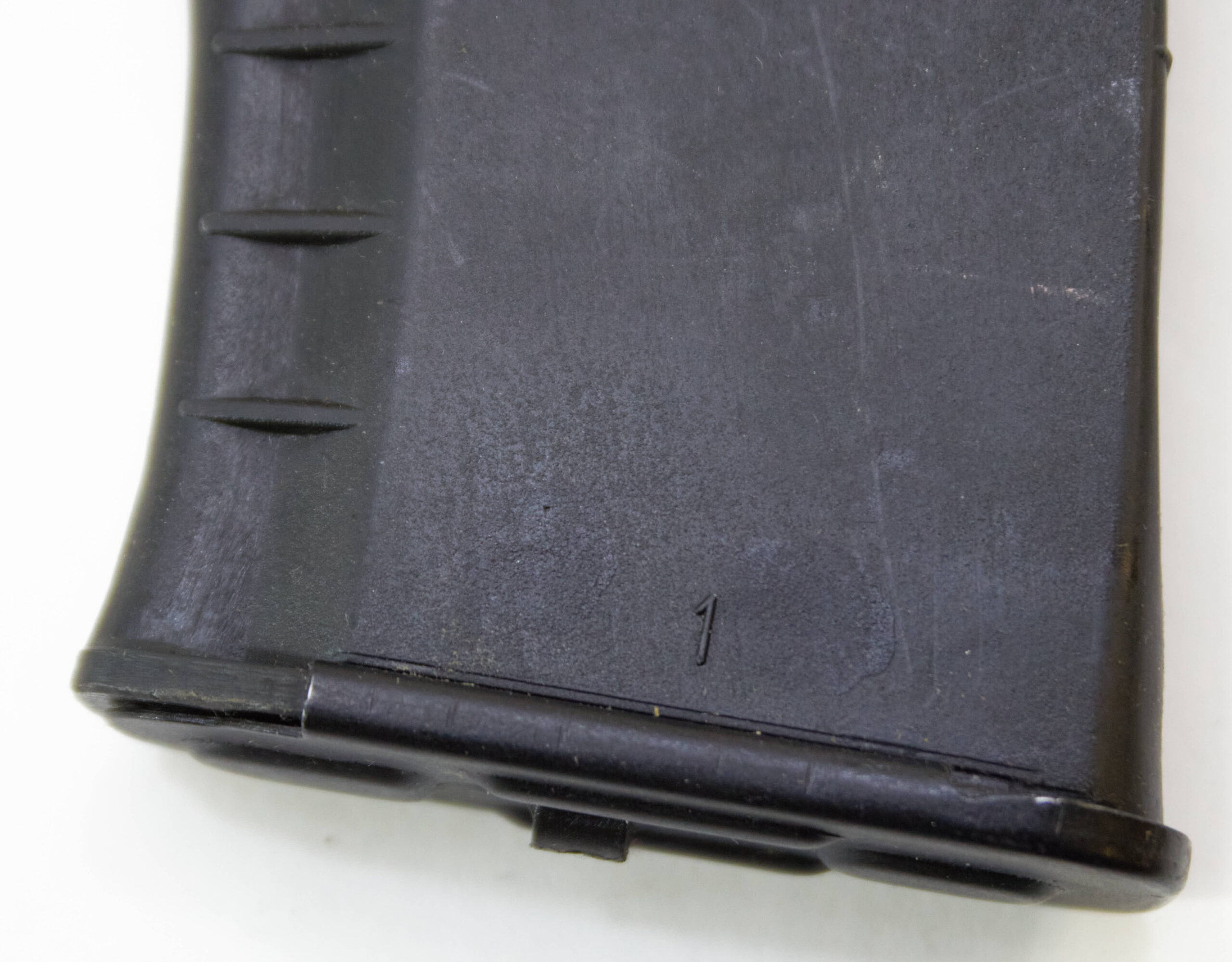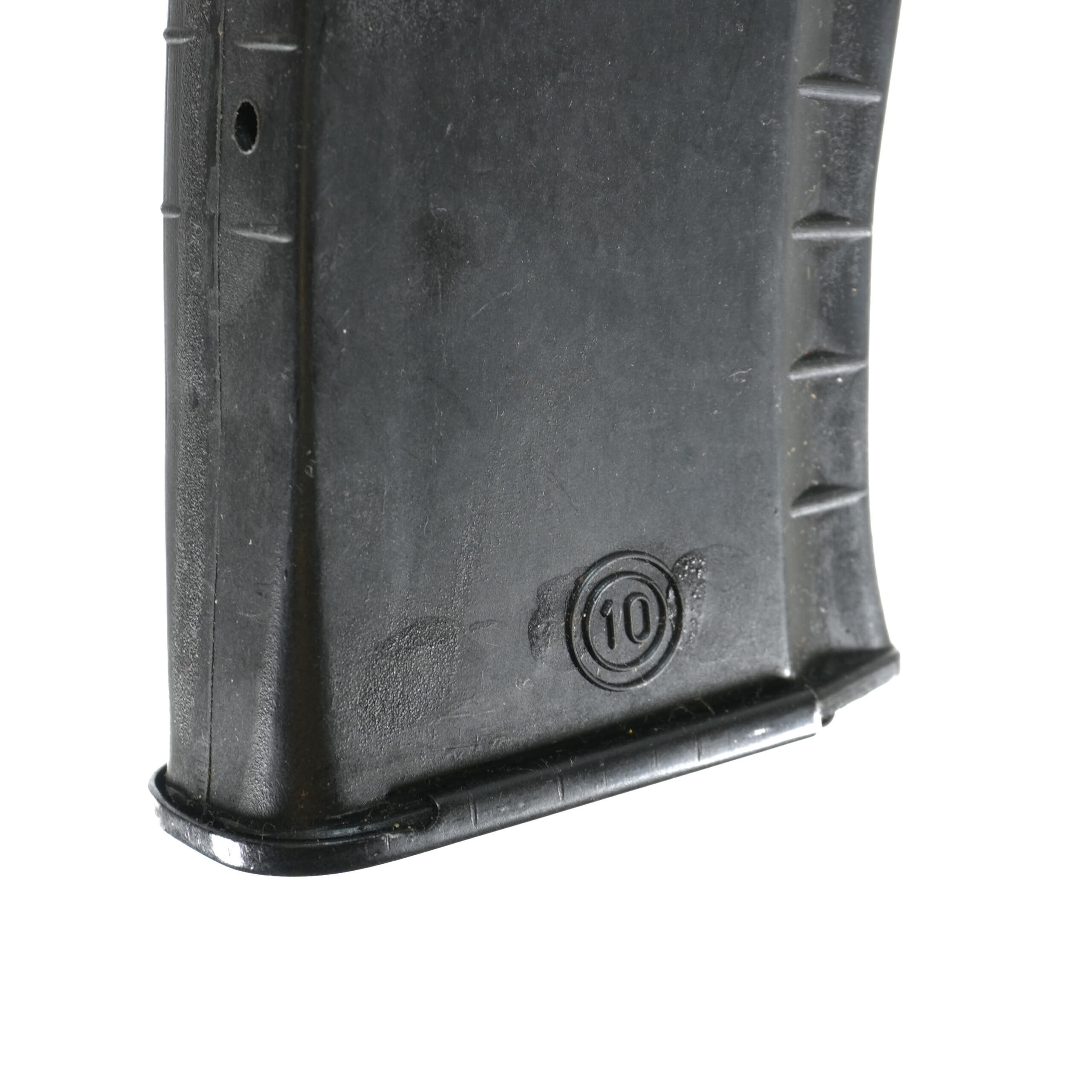 This mag is constructed from high-strength polymer reinforced with steel, featuring a steel front and rear locking lug, steel feed lips, and a ribbed exterior for enhanced grip. It is marked with the distinctive “Circle 10” factory stamp, the code for the Bulgarian State Arsenal in Kazanlak—a major supplier of Eastern Bloc arms and equipment during the Warsaw Pact years.