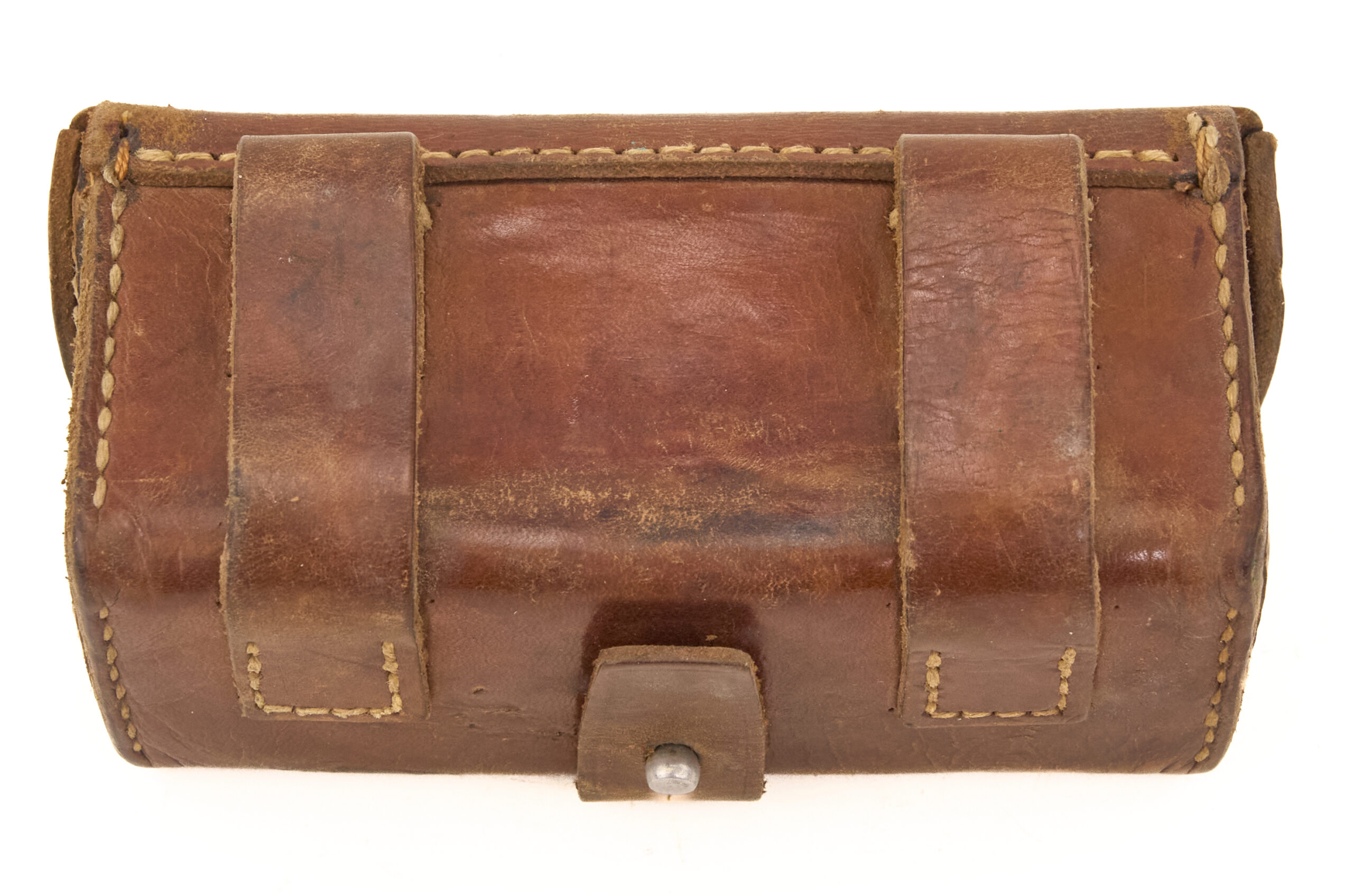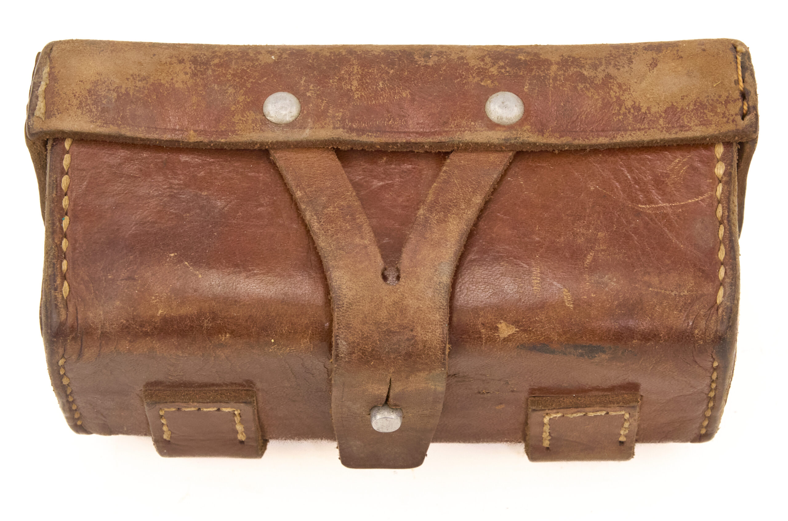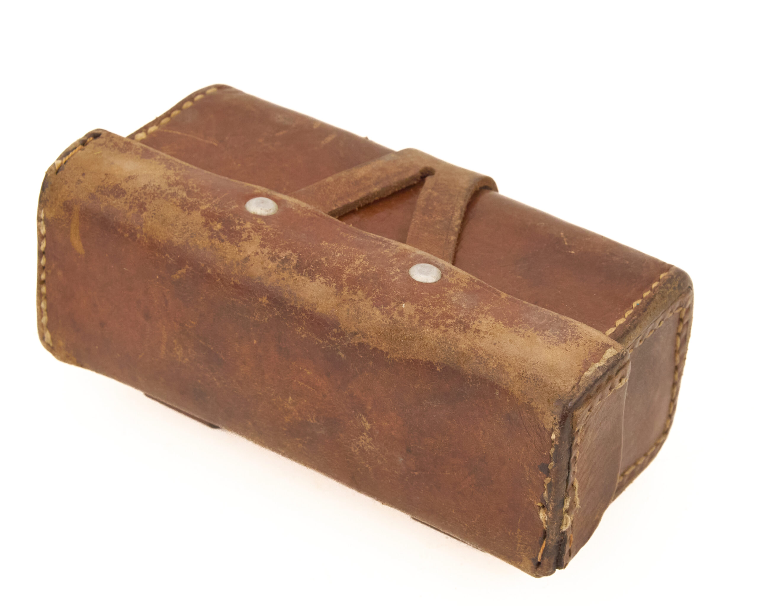 This example shows honest age and use. The leather has a dry surface look in places, but the body remains well formed and the stitching stays tight. The closure tab is present, and the aluminum stud still remains in place. The aluminum rivets and belt loop tabs are also intact. The inside lid stamp is visible but somewhat worn from age and handling. Overall, it presents as a sound and complete display piece with good structure and clear period character.