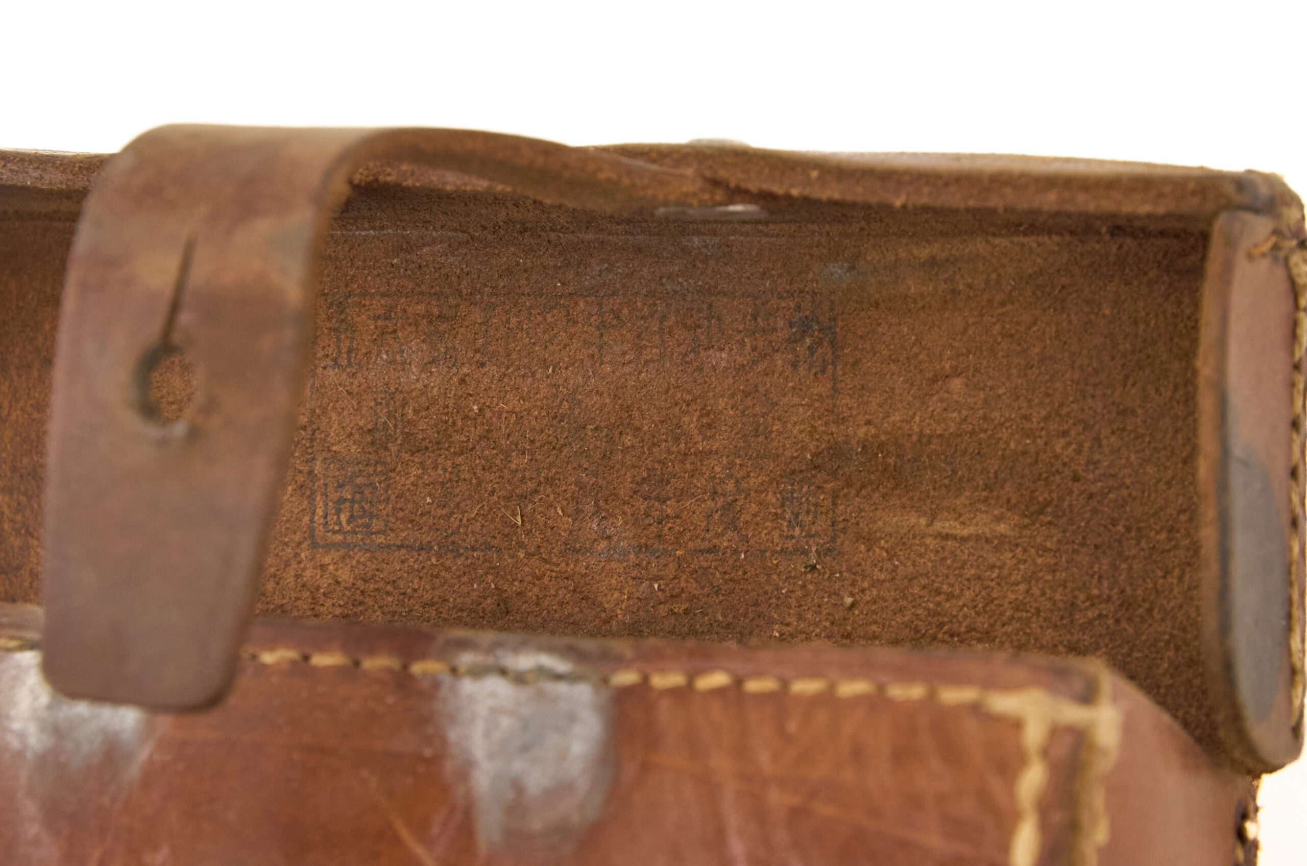 This cartridge case is made in light brown leather with a rigid box form suited to carrying loaded stripper clips. The body uses stitched leather construction with aluminum rivets at key stress points. It also retains the correct leather closure tab and aluminum stud fastener on the front. On the reverse, the pouch has belt loop tabs for field wear. The interior of the lid shows Chinese stamped markings, which are now somewhat faint but still visible. Overall, the pattern is simple, durable, and typical of Chinese Communist military leather equipment made for practical infantry use.