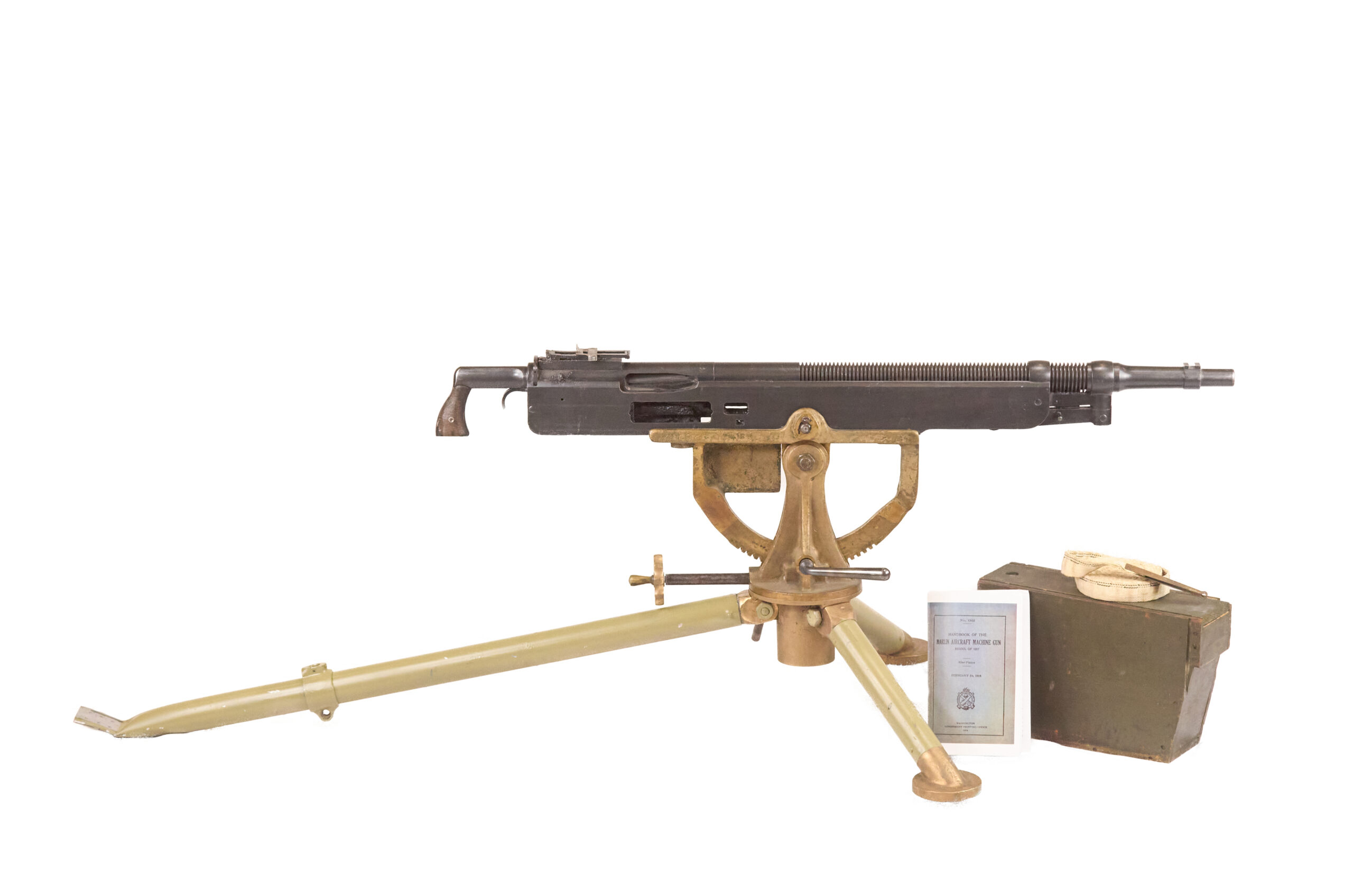 This Colt Marlin M1895 display machine gun is a substantial non-firing display set built around an original demilled Marlin-made “potato digger” with tripod, ammo box, 250-round Browning cloth belt, and manual. The gun remains in excellent demilled condition overall. It shows expected wear from use, with only mild pitting in sparse areas. The barrel is original to the receiver, and the serial numbers match. Together, the gun and its accessory group present as an excellent early American machine gun display with strong mechanical and historical character.