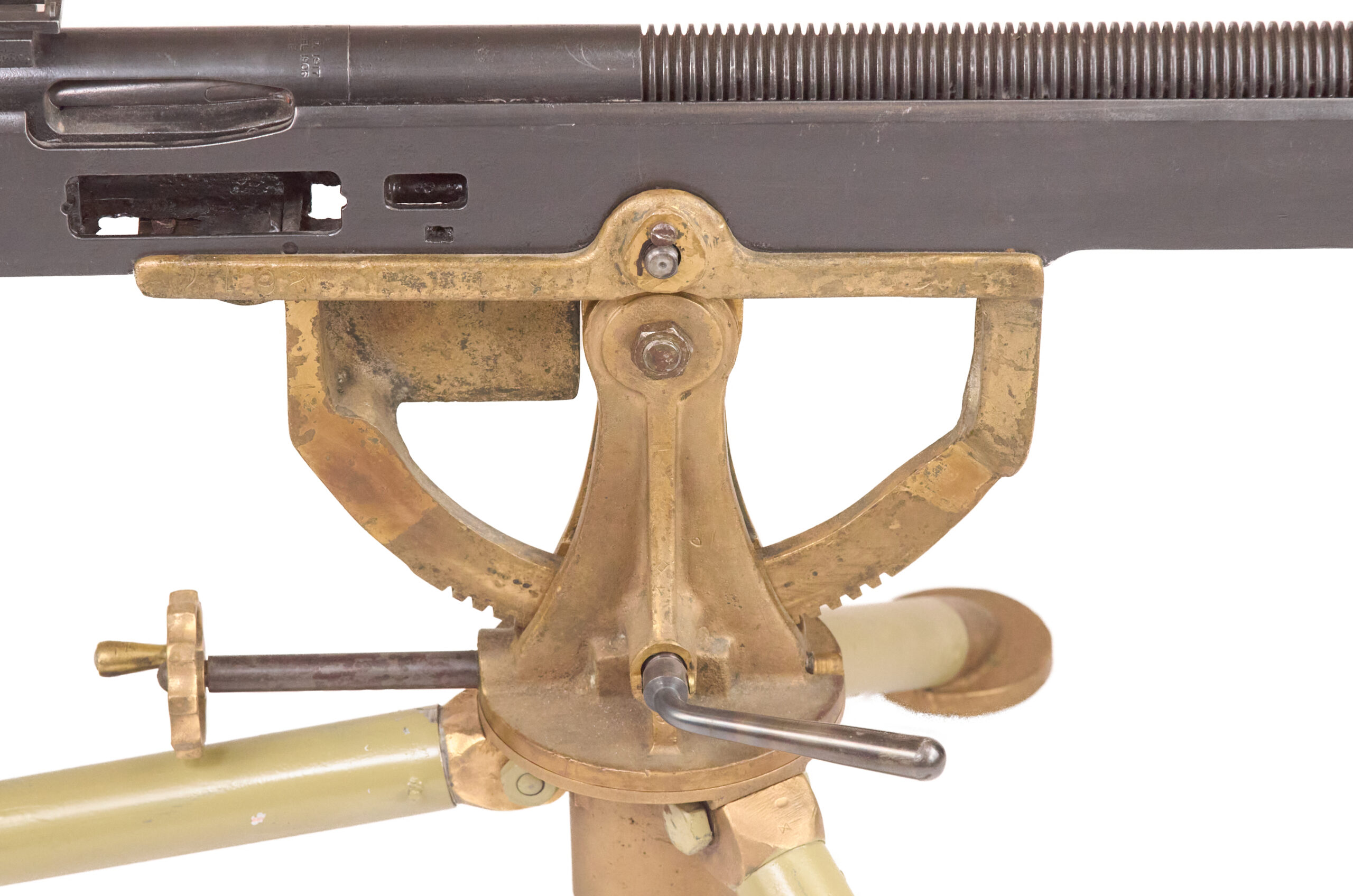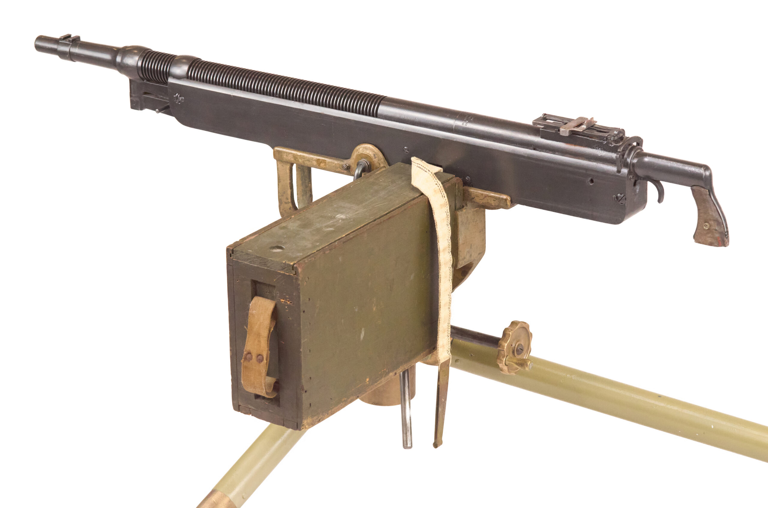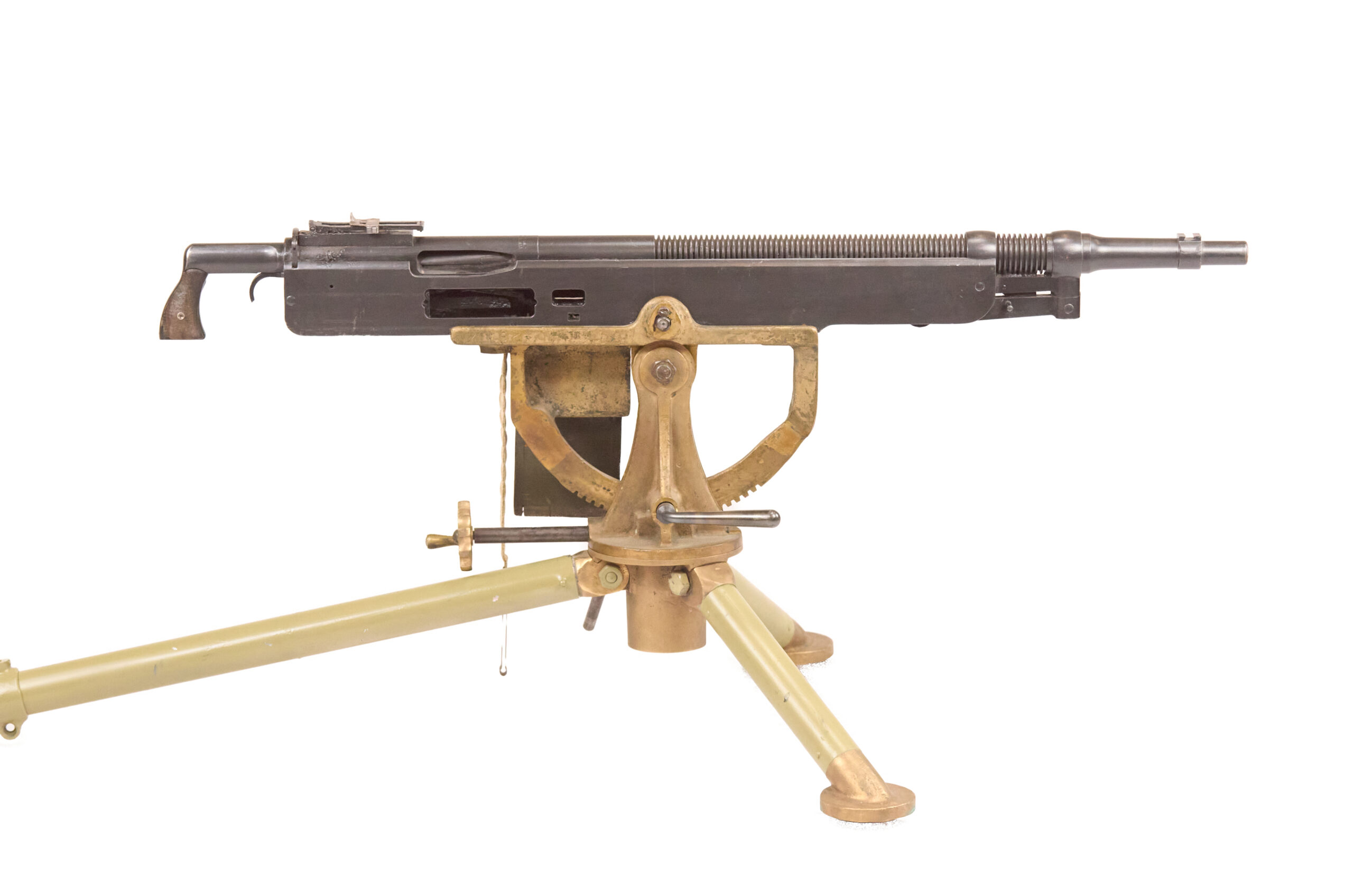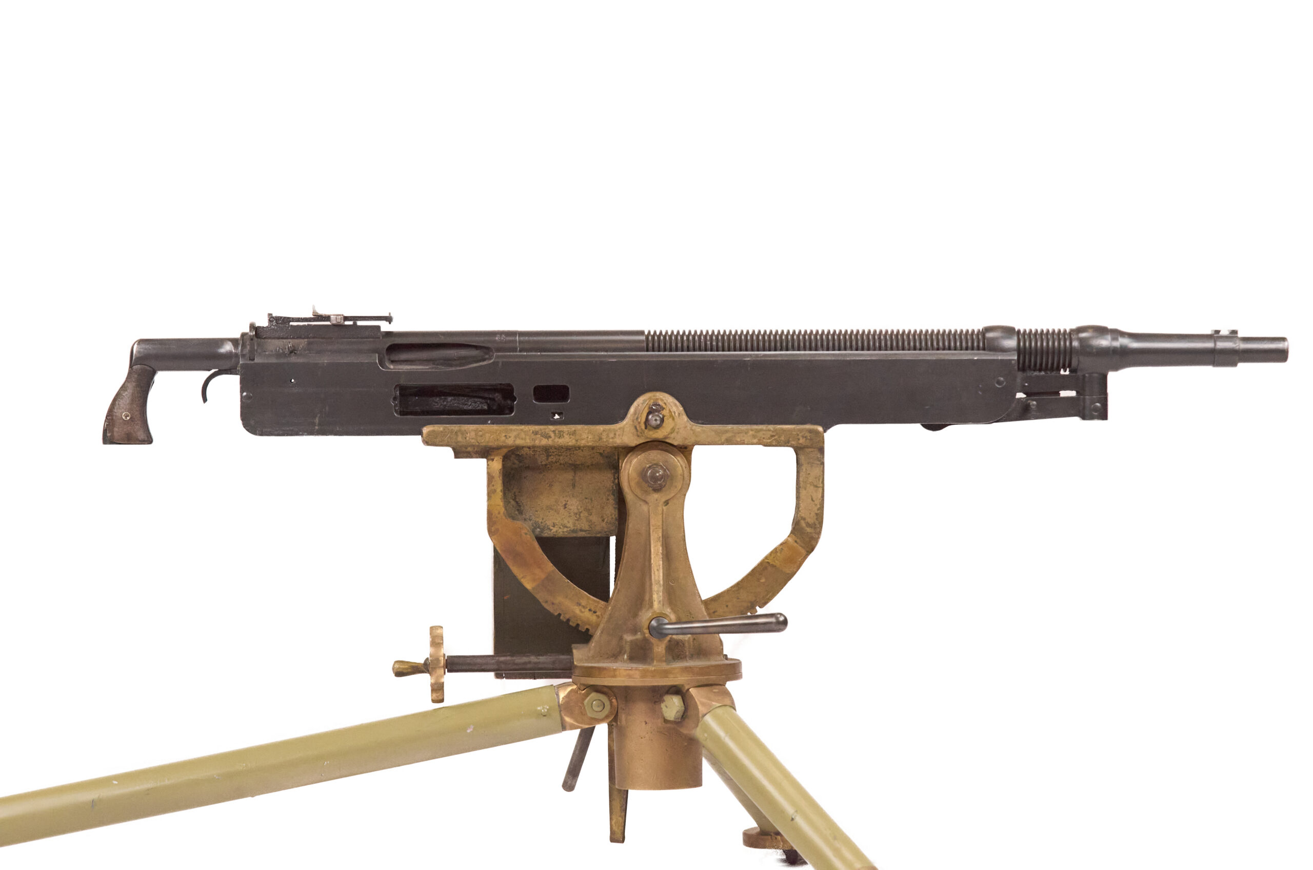 Mechanically, the M1895 used one of the most distinctive systems of any early machine gun. Gas from a port under the barrel drove a lever down and to the rear, which unlocked the action, cycled the bolt, and fed the next round. The gun used a tilting bolt and operated at roughly 450 rounds per minute. That combination gave the design a unique place in the development of automatic weapons and explains why the “potato digger” remains so instantly recognizable today.