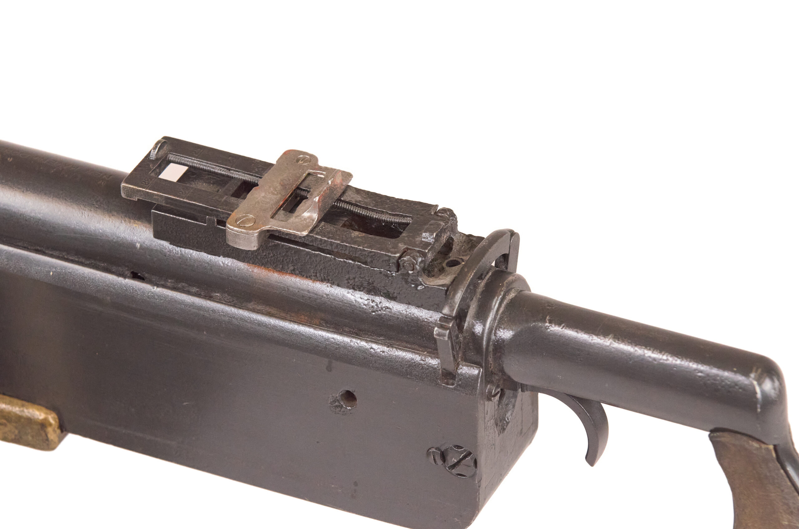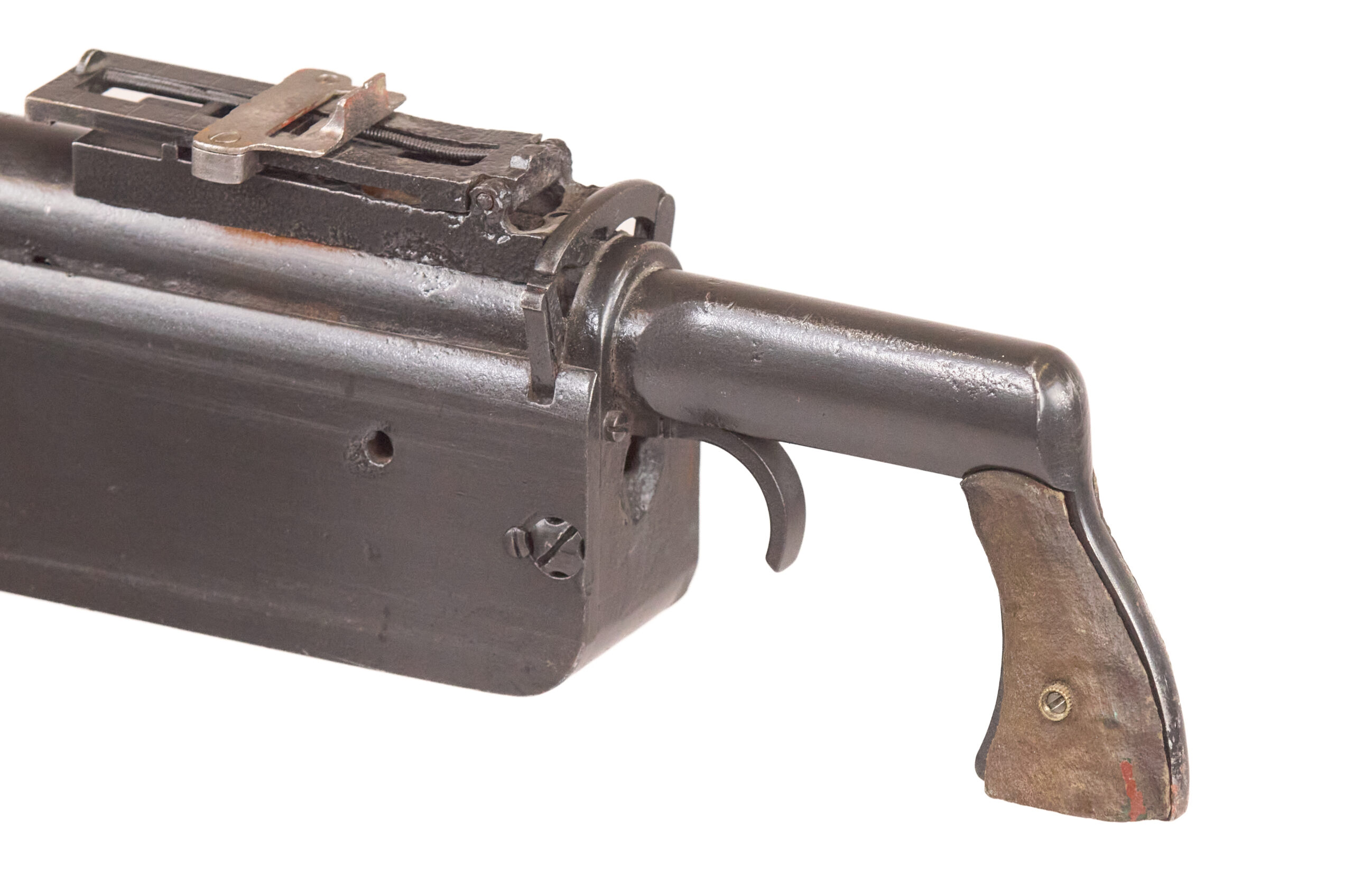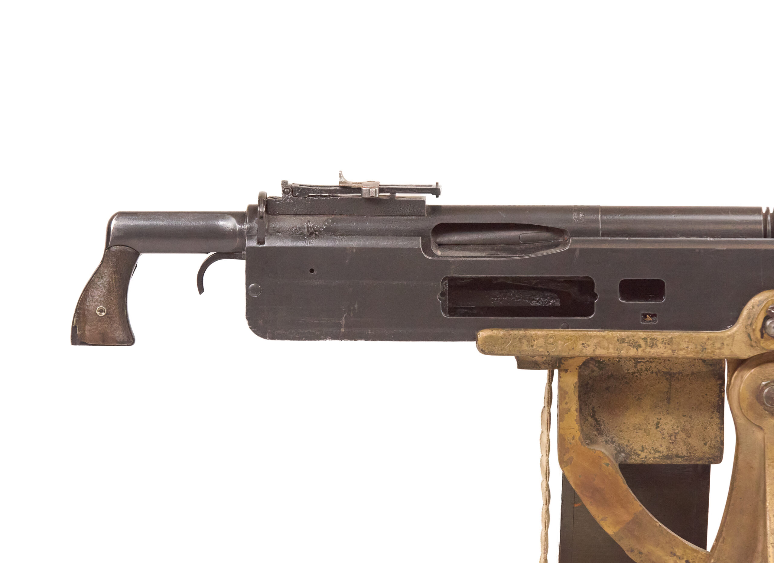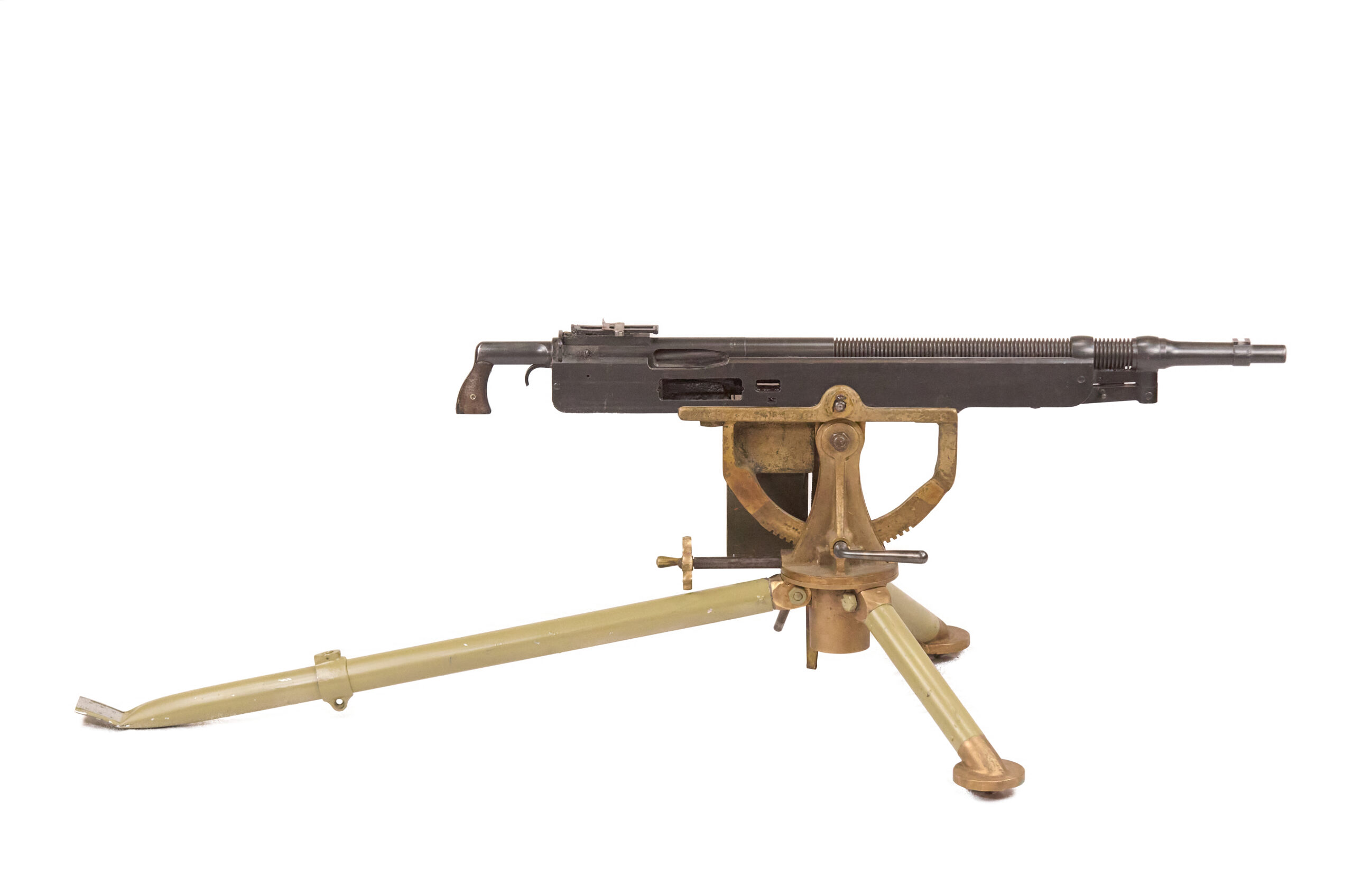 Mechanically, the M1895 used one of the most distinctive systems of any early machine gun. Gas from a port under the barrel drove a lever down and to the rear, which unlocked the action, cycled the bolt, and fed the next round. The gun used a tilting bolt and operated at roughly 450 rounds per minute. That combination gave the design a unique place in the development of automatic weapons and explains why the “potato digger” remains so instantly recognizable today.