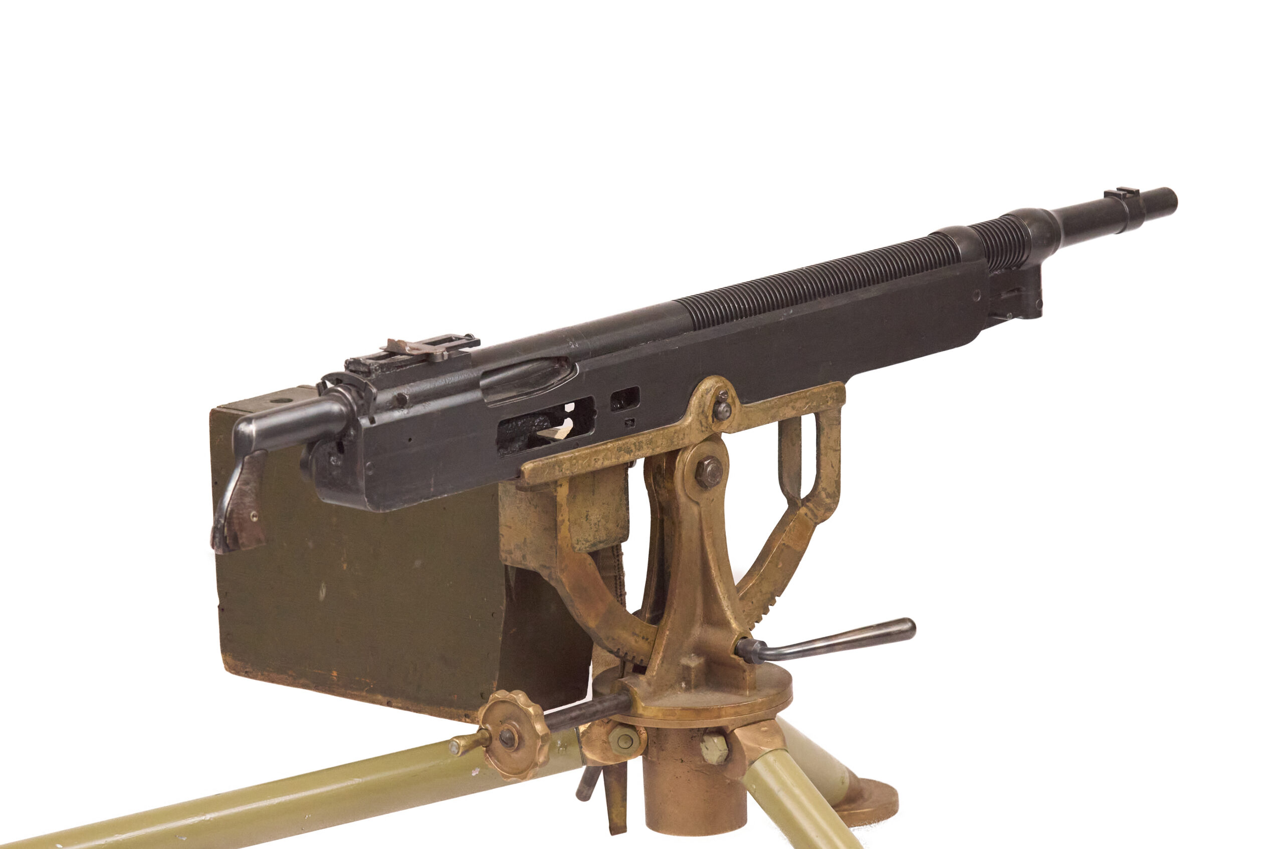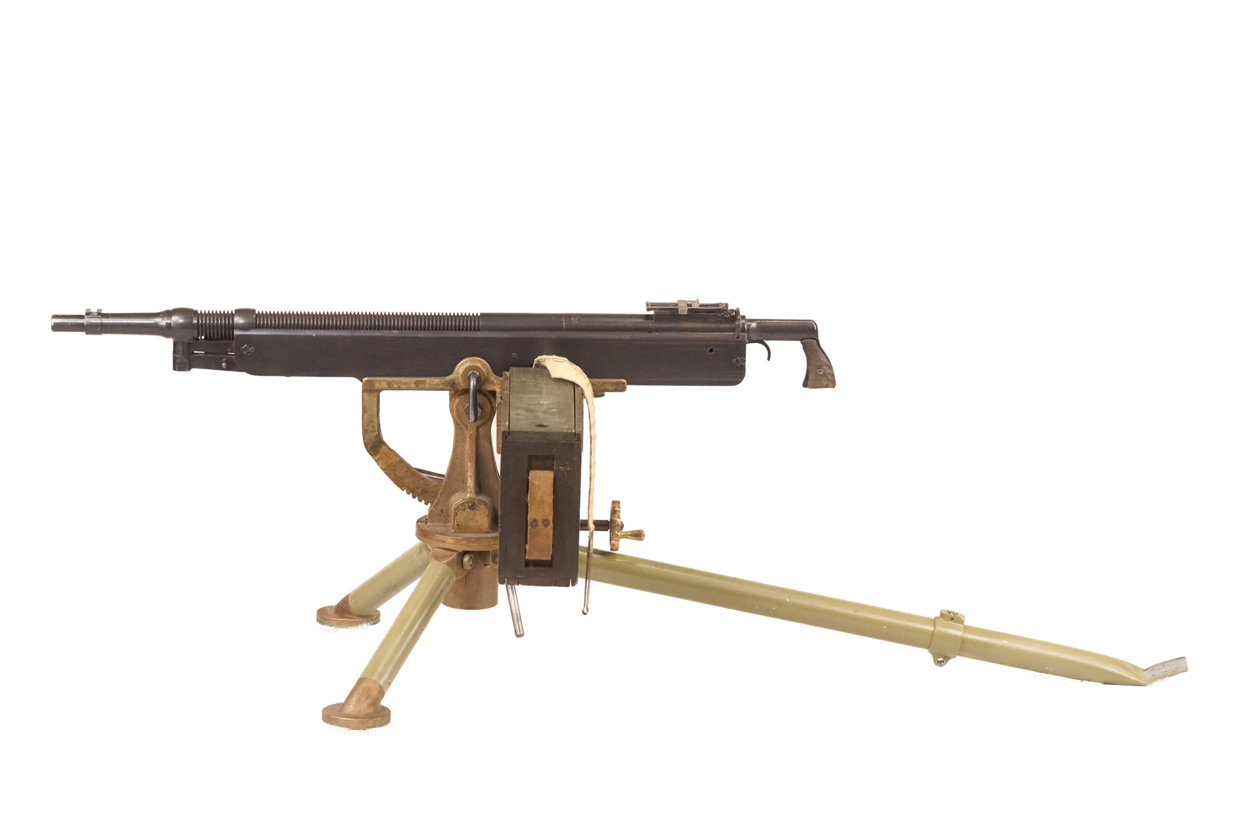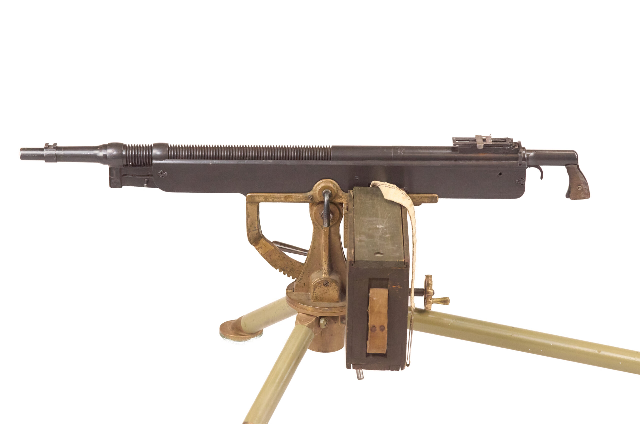 The gun retains its grips, and the rear ladder sight remains present, though the front blade is missing. The barrel has been plugged with weld as part of the display deactivation. The display also includes an original brass tripod with steel legs, an ammo box, a 250-round Browning cloth belt, and a manual. The tripod remains in very good condition overall, though the rear foot is missing, which is a commonly encountered issue on these mounts.