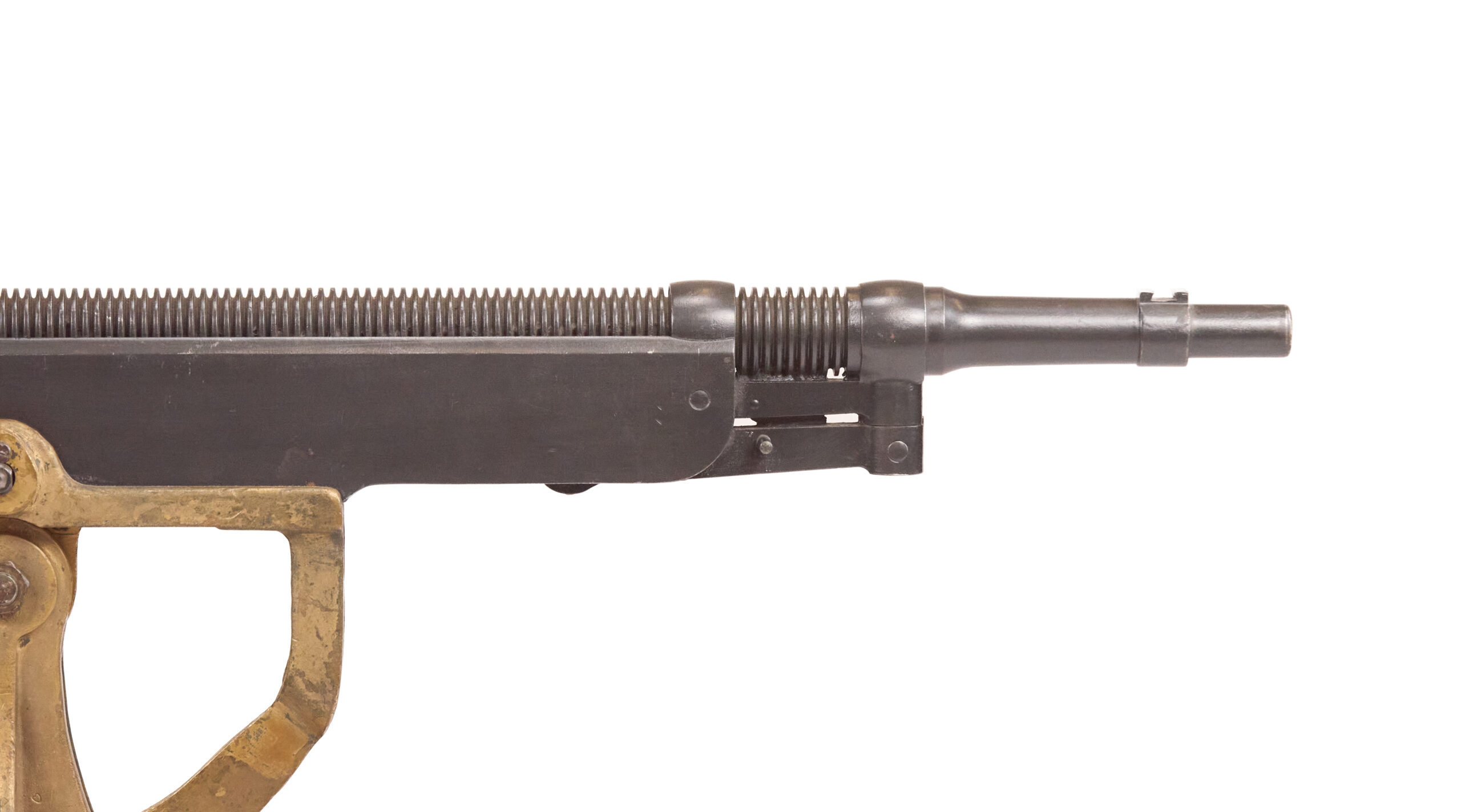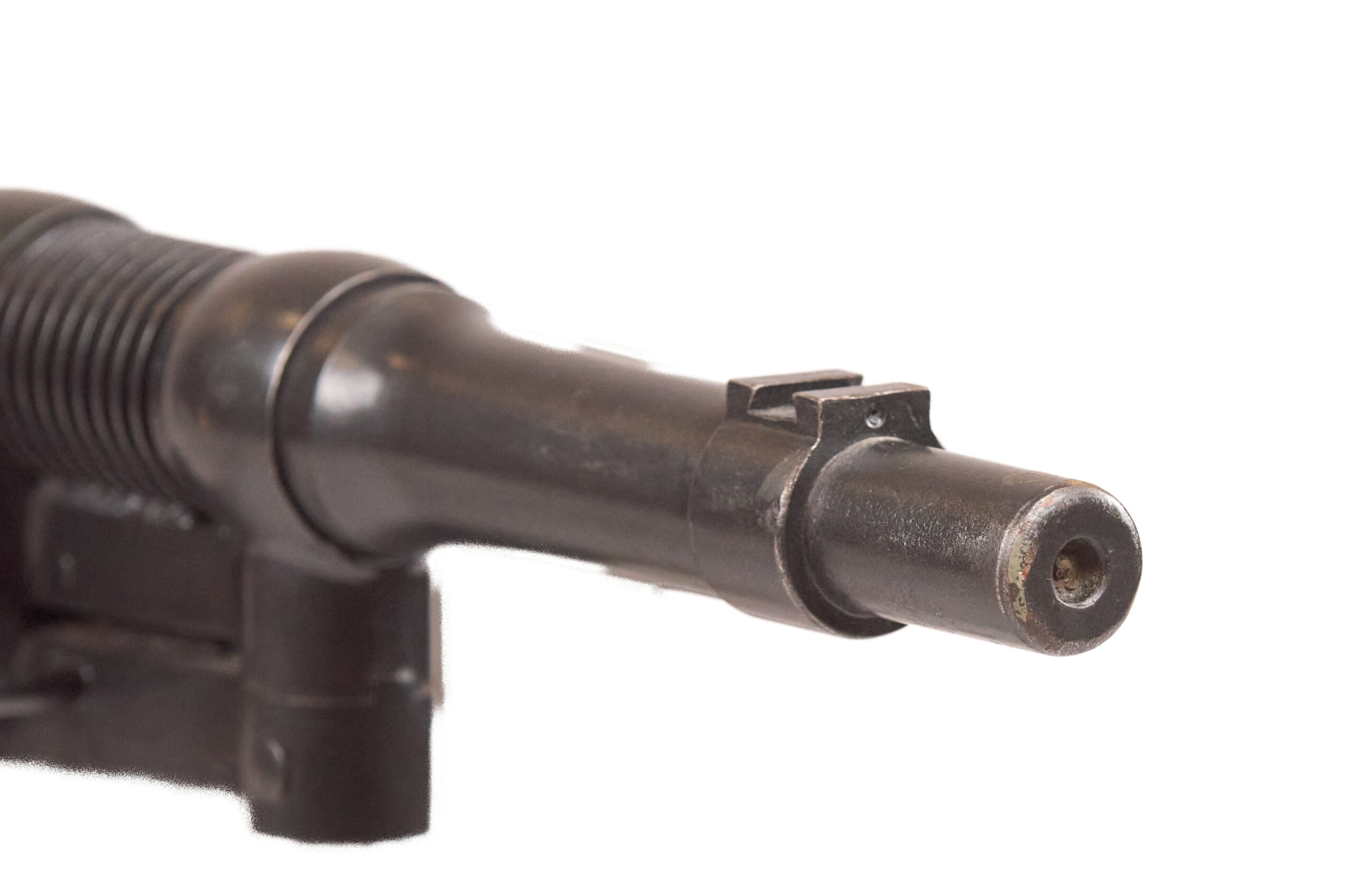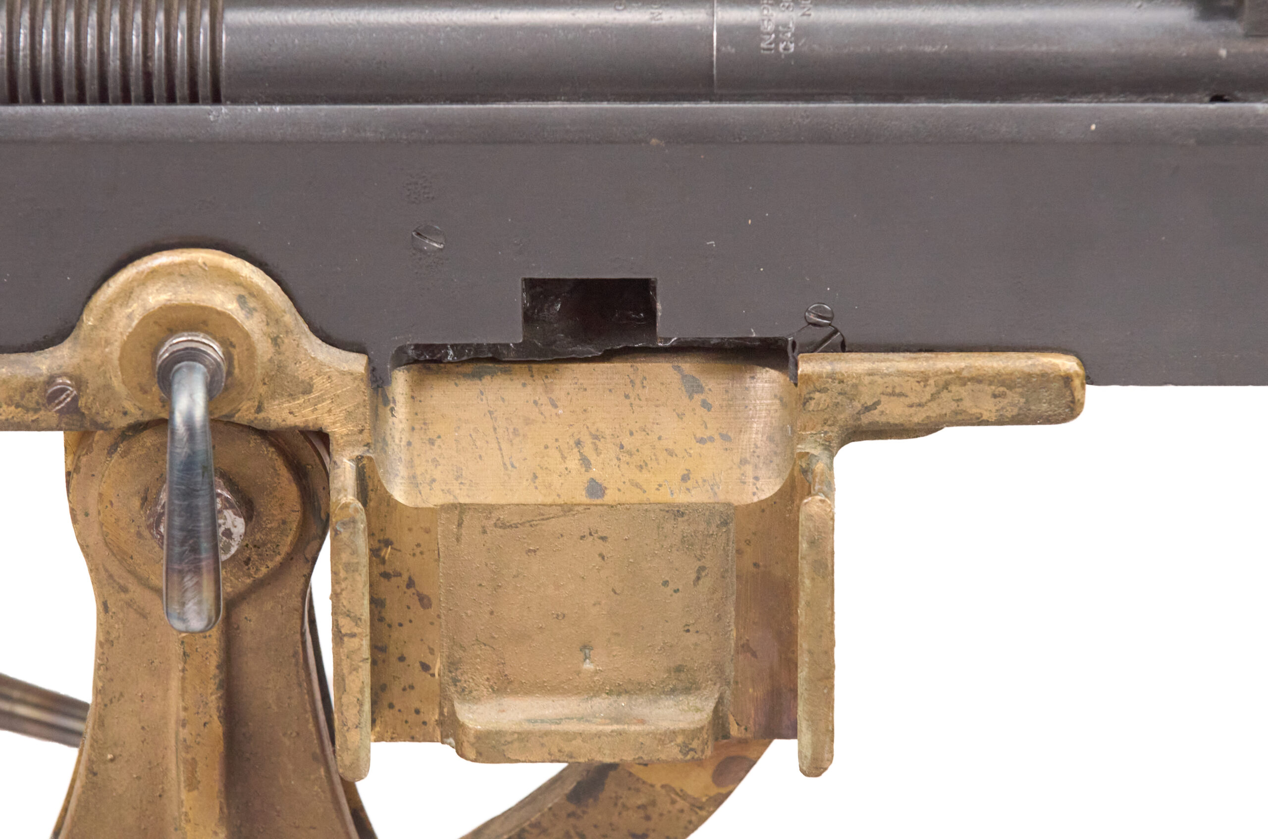 This inert BATF non-firing display example is built on an original re-welded receiver, with a 20 percent section replaced by solid steel bar stock. The finish was redone in gunmetal gray. The gun is serial numbered 2402 on both the receiver and the barrel, and it was manufactured in .30-06 with a 28-inch barrel. It is marked on the top of the receiver and on the matching barrel: