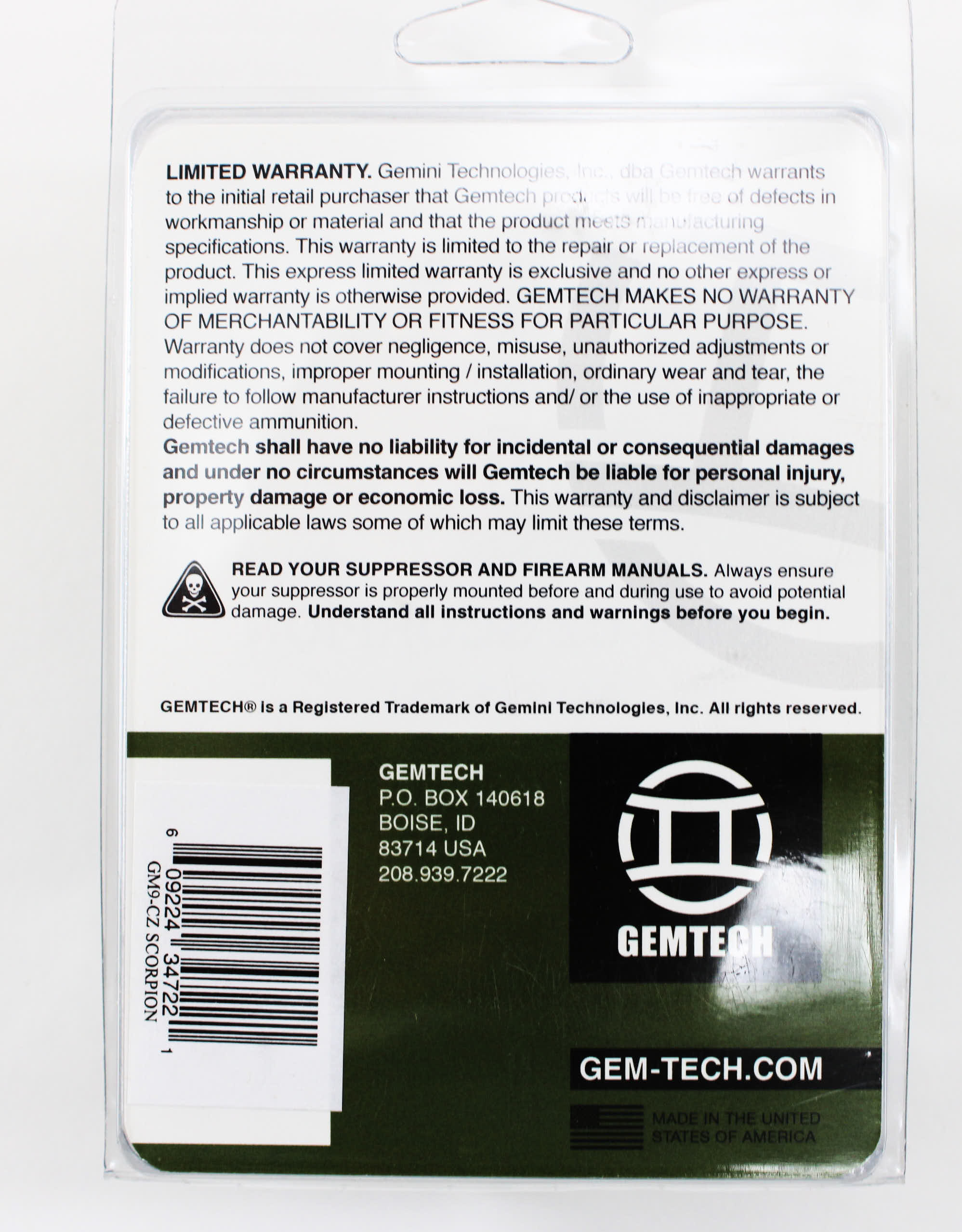 Converts CZ Scorpion’s M18×1 RH thread to Gemtech GM9/MM9 suppressor mounting