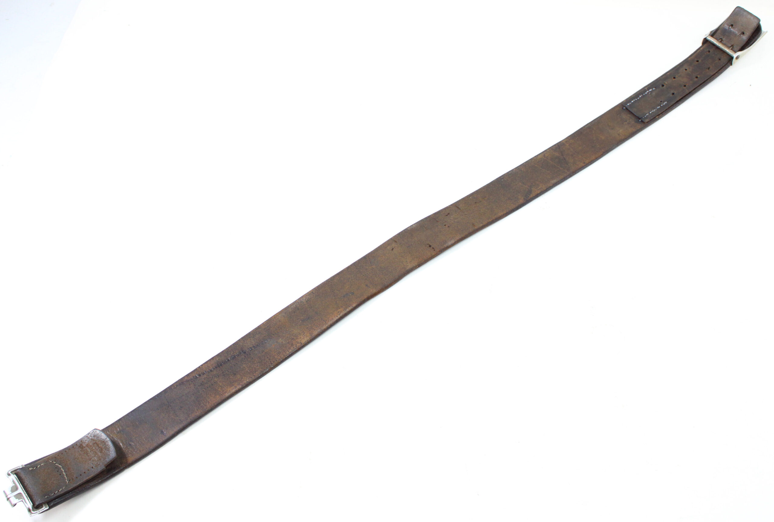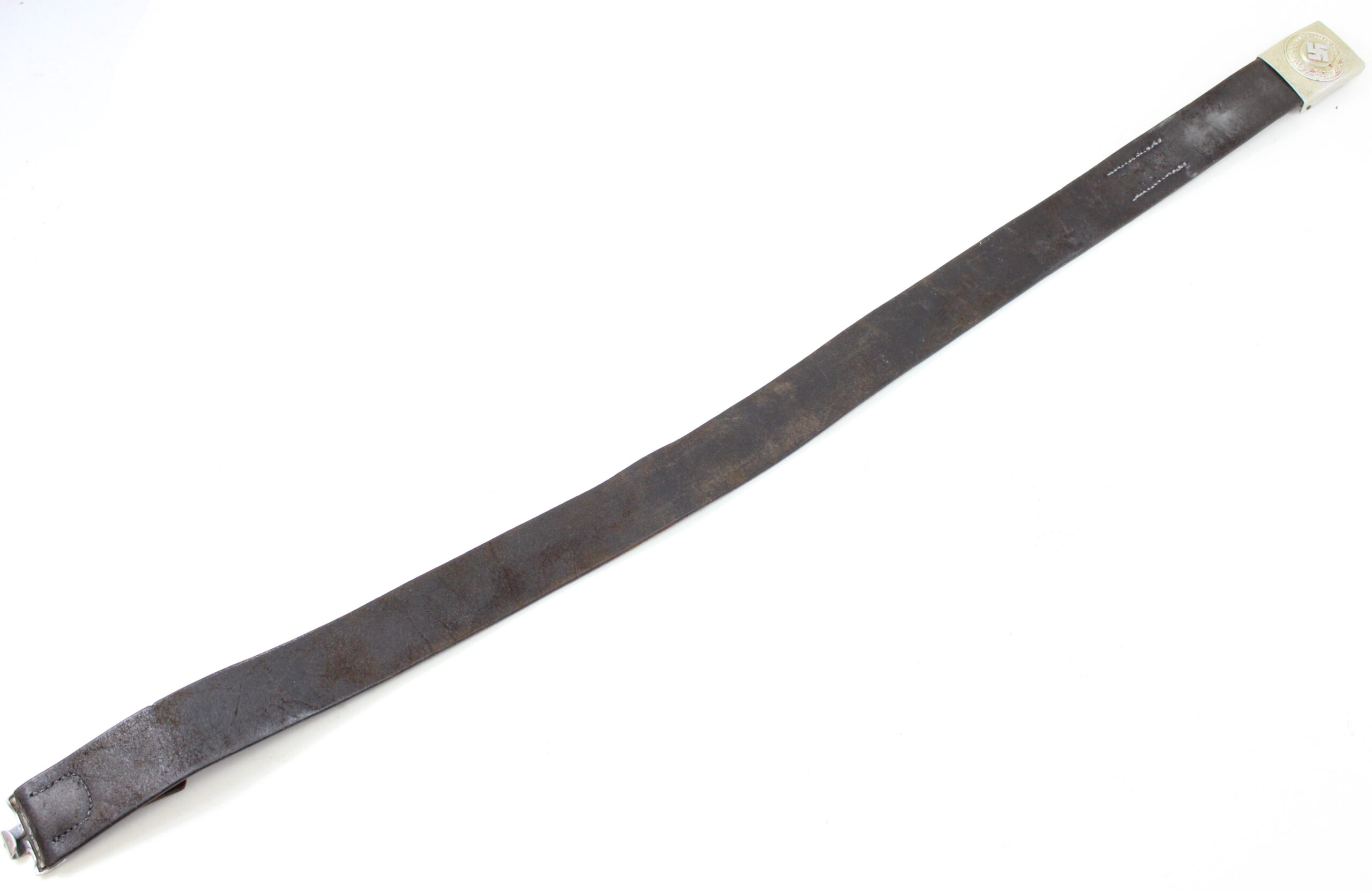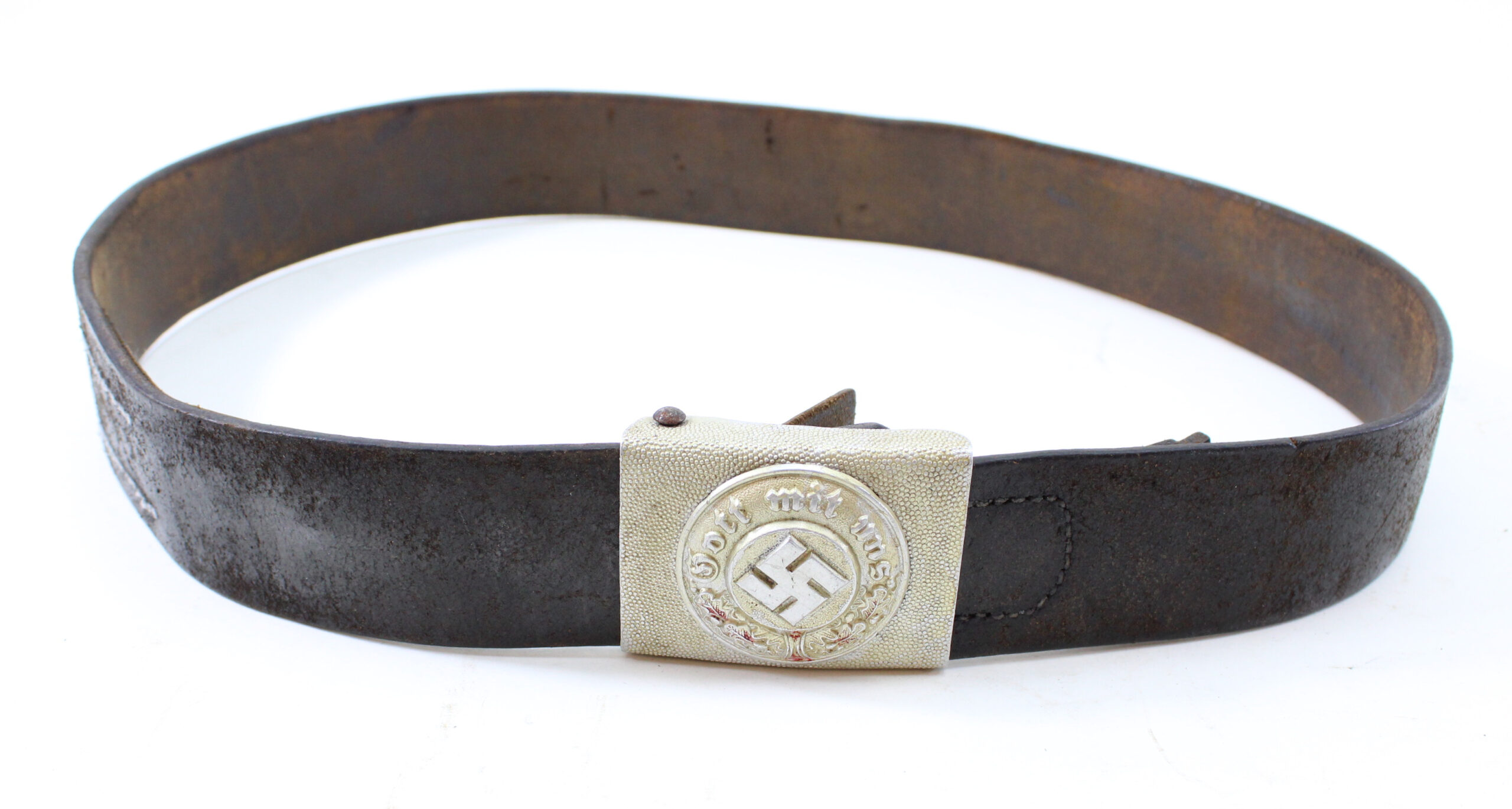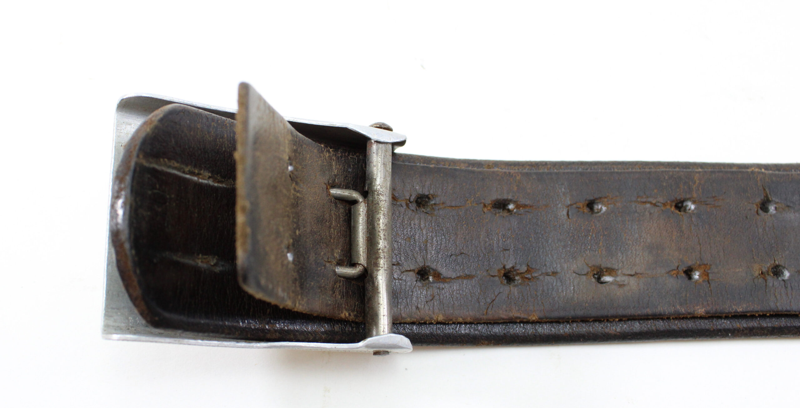 Authentic WWII German Police (Ordnungspolizei) enlisted man’s and NCO’s belt and buckle set, consisting of a black leather belt and its original aluminum buckle.