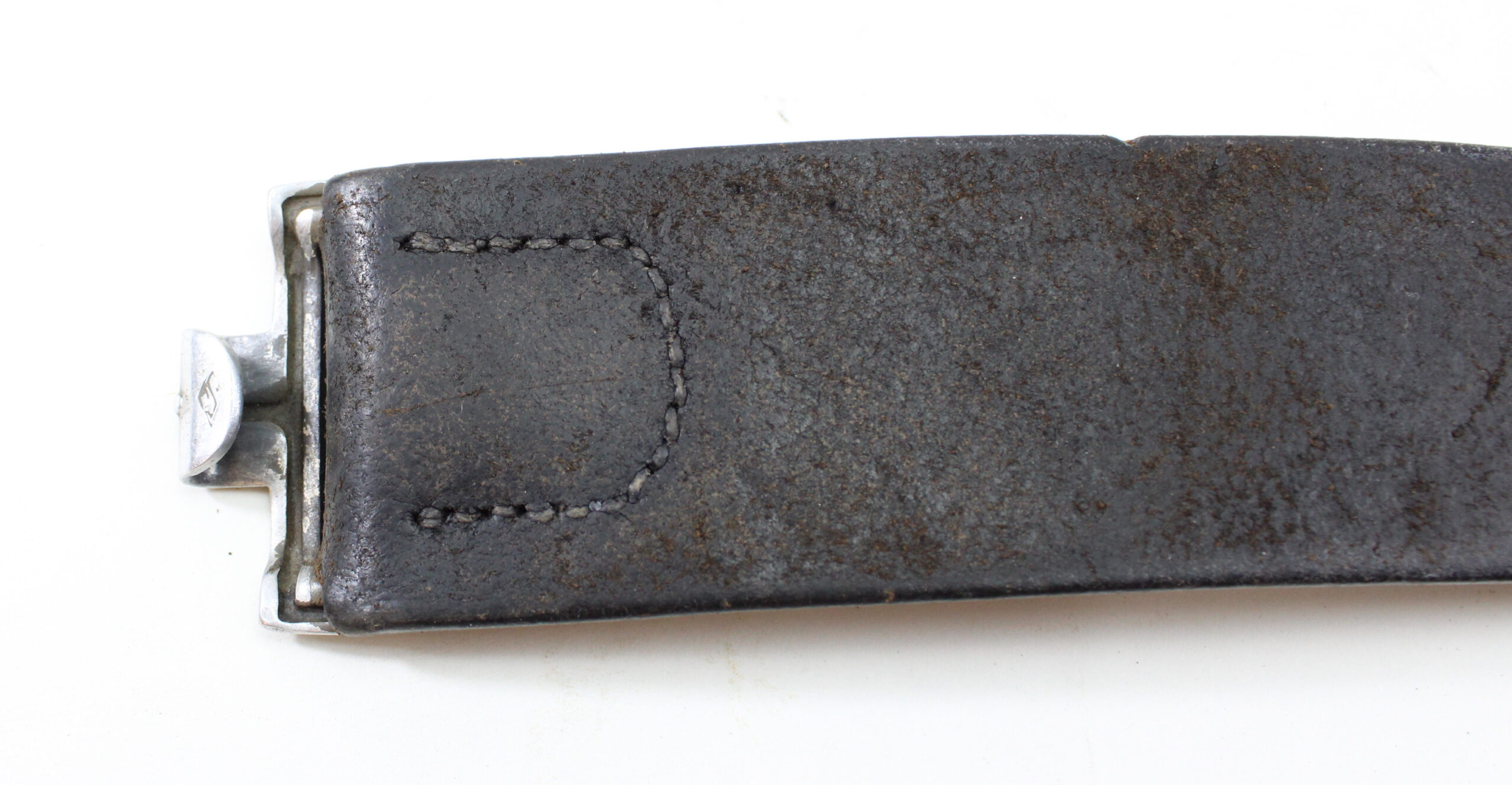 The belt is made of black leather, regulation width, with fastening hook and adjustment holes. The combination of lightweight aluminum and police-specific insignia places this set in the early- to mid-war period before late-war steel variants became more common.