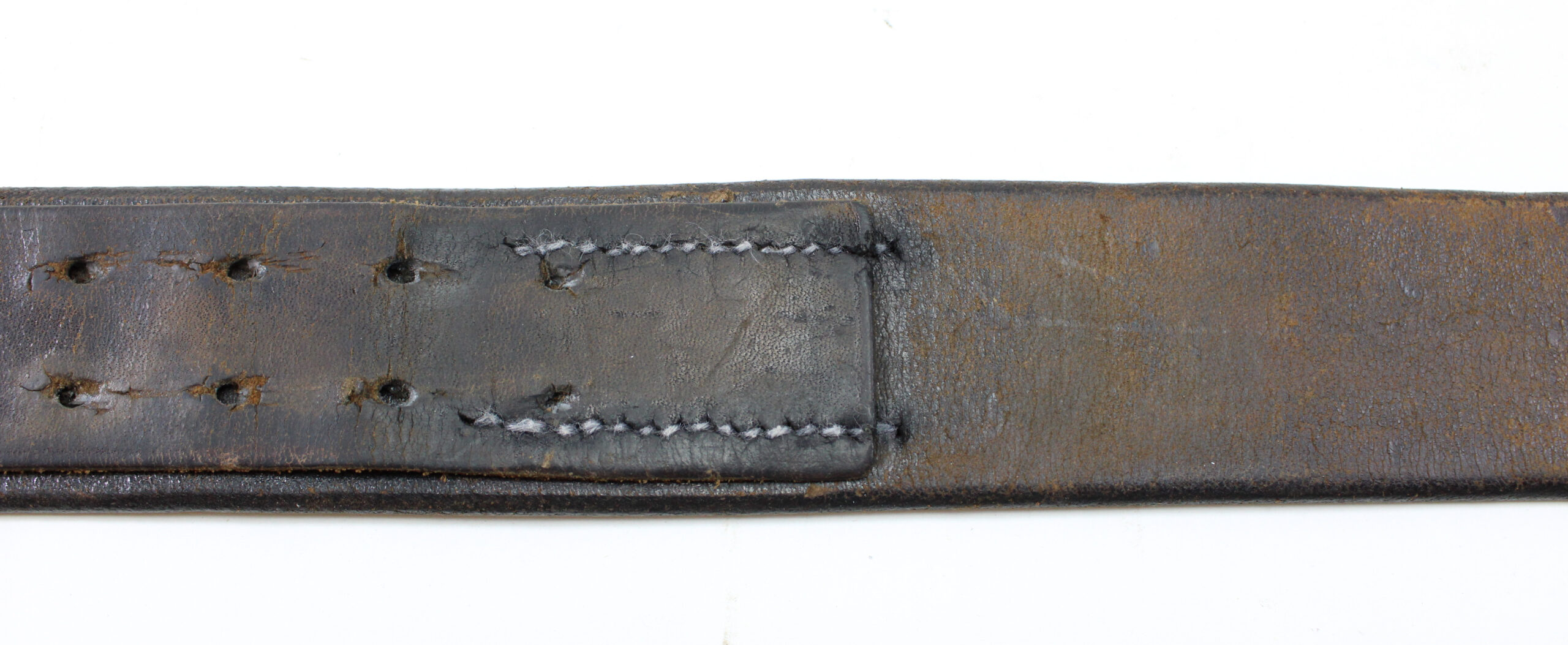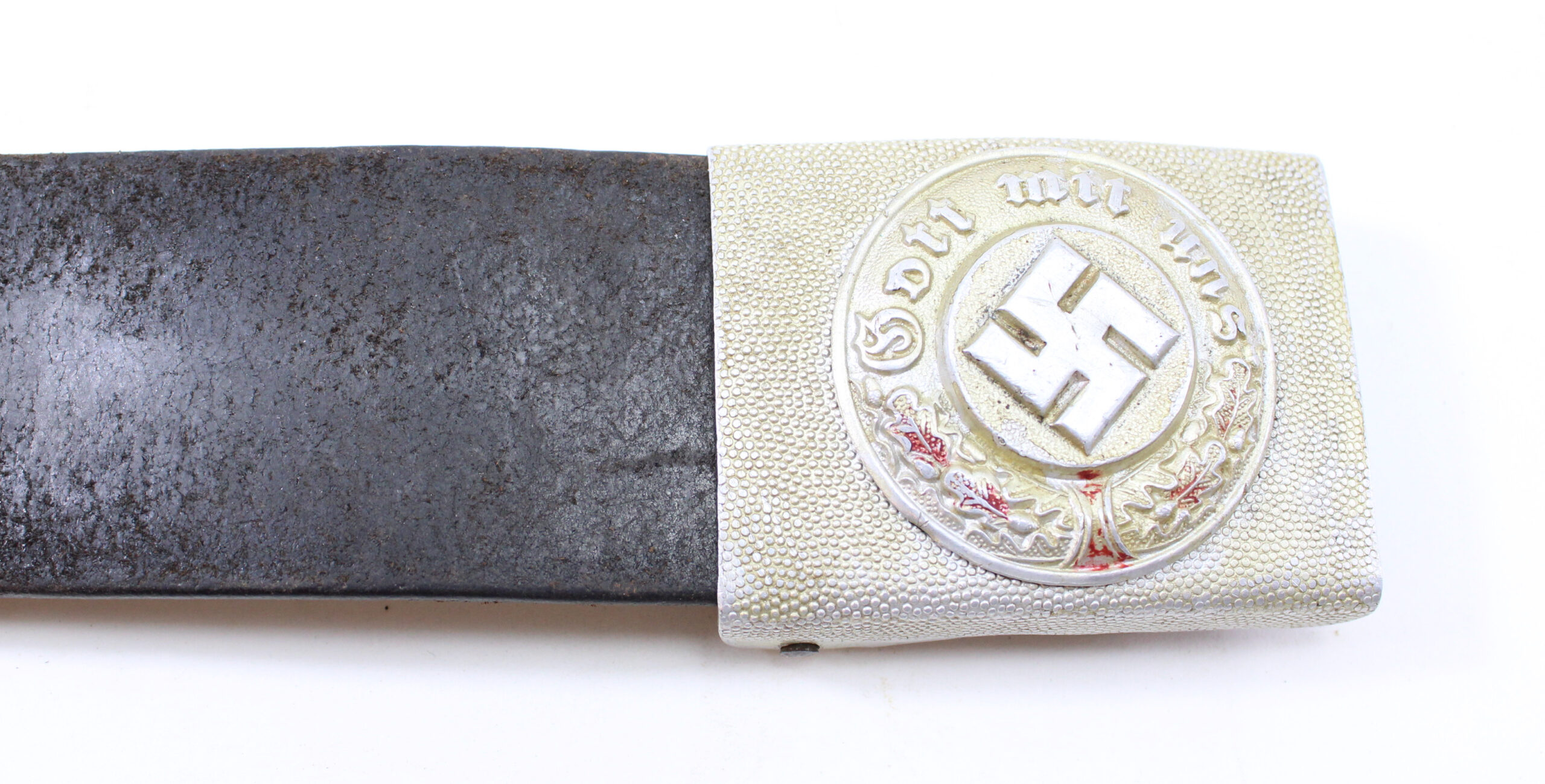 The buckle is die-struck aluminum, featuring the Police eagle with swastika, surrounded by an oak leaf wreath and the motto “Gott Mit Uns.” This was the regulation pattern issued to Ordnungspolizei personnel throughout the Third Reich, worn both on service and dress uniforms.