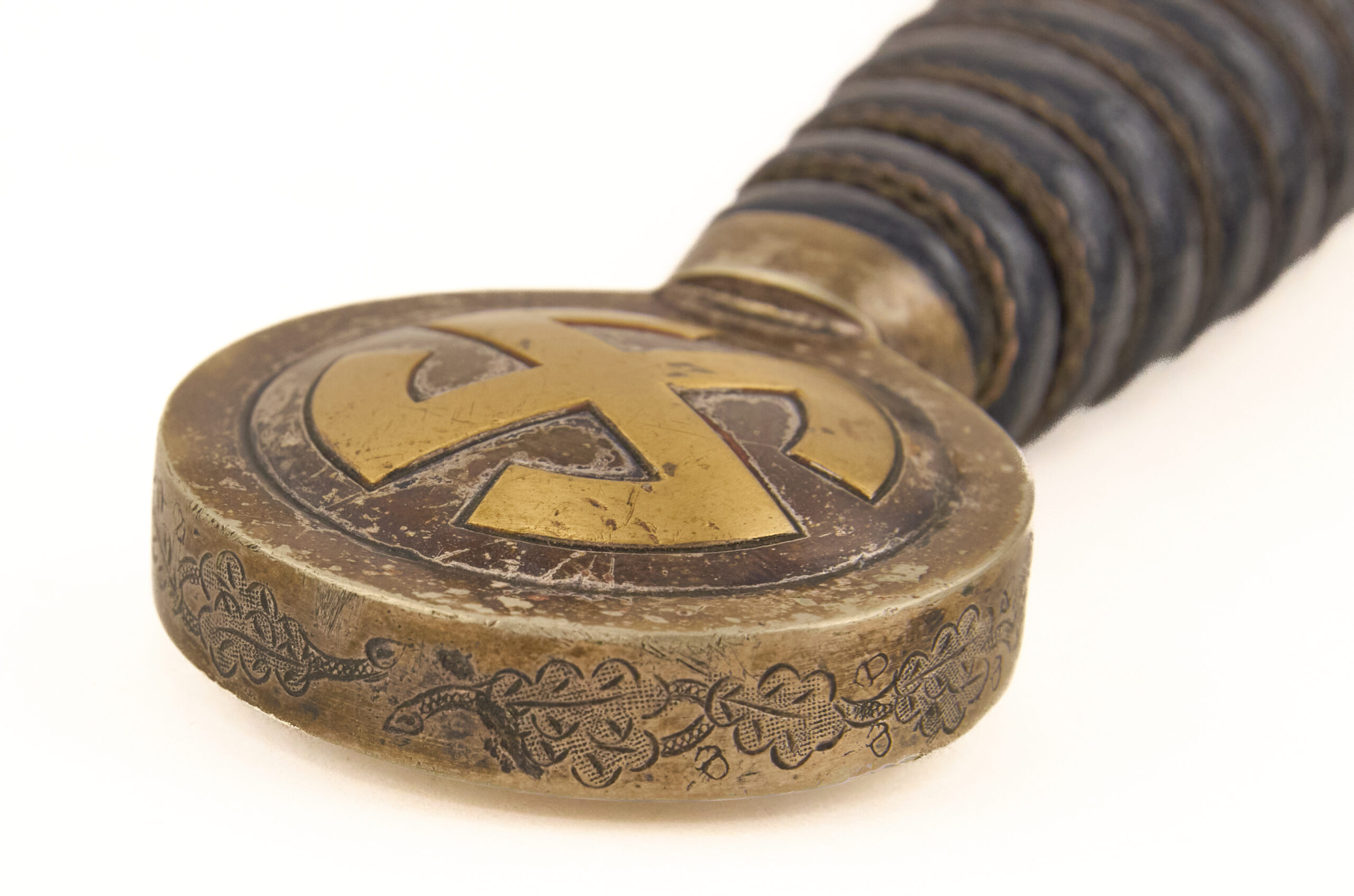 The pommel and crossguard are fitted with Brass “Sunwheel” style swastika emblems, now patinaed to an attractive golden tone. The pommel retains crisp definition to the oak leaf and acorn border, with only minor dents and handling marks. The cross guard remains sharp and well defined, with excellent detail to the feathered, downward-swept quillons, still retaining a significant amount of original plating with light oxidation consistent with age.