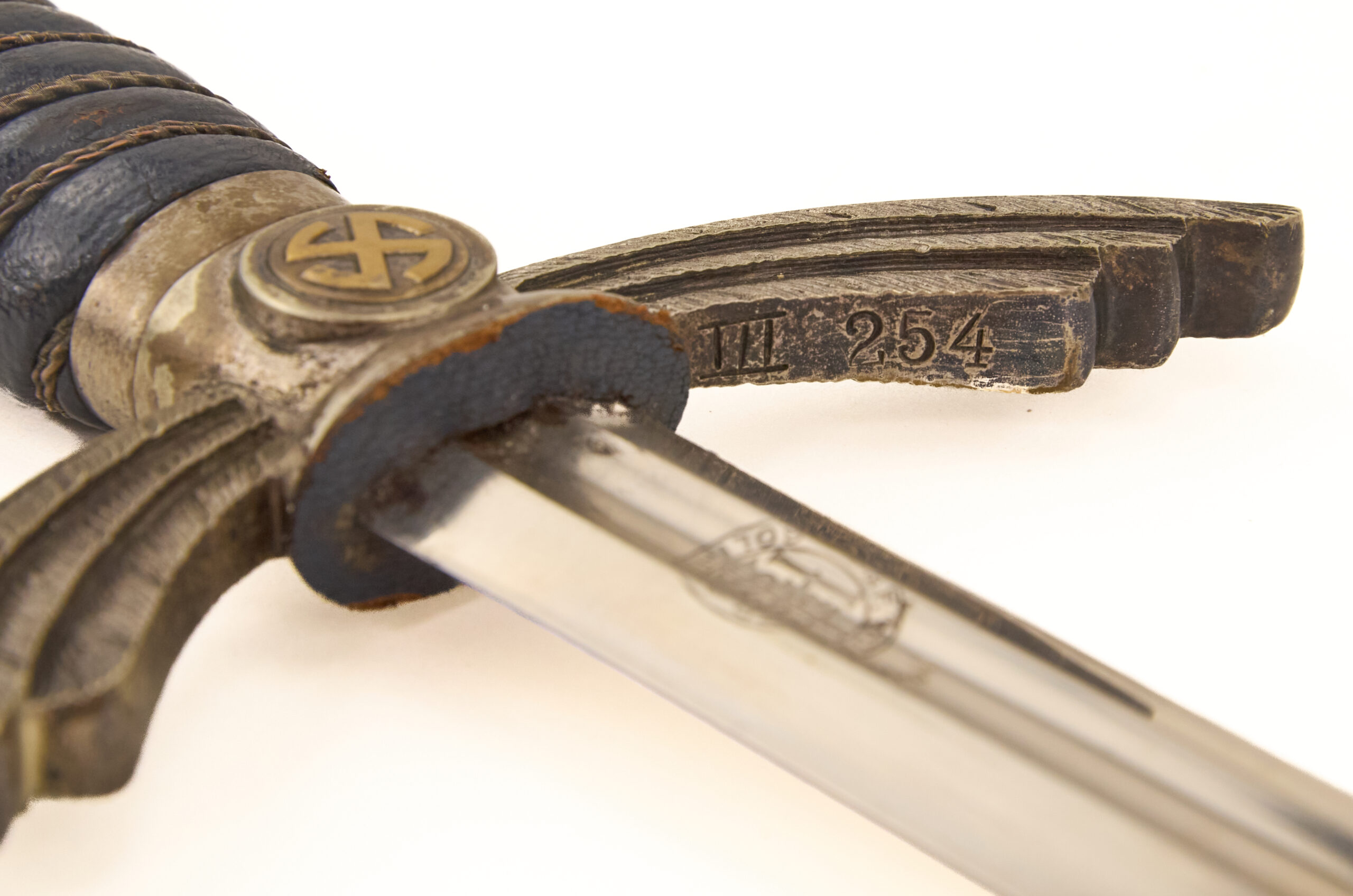 An important and desirable feature of this sword is that both the sword and scabbard are unit marked. The marking “III 254” is clearly stamped on the scabbard mouth and repeated on the inside of the cross guard, indicating they have remained together as an original matched set since period service. Such matching unit marks add significant historical interest, as they allow the piece to be directly associated with a specific Luftwaffe unit formation, and they strongly support the originality and authenticity of the pairing of sword and scabbard.