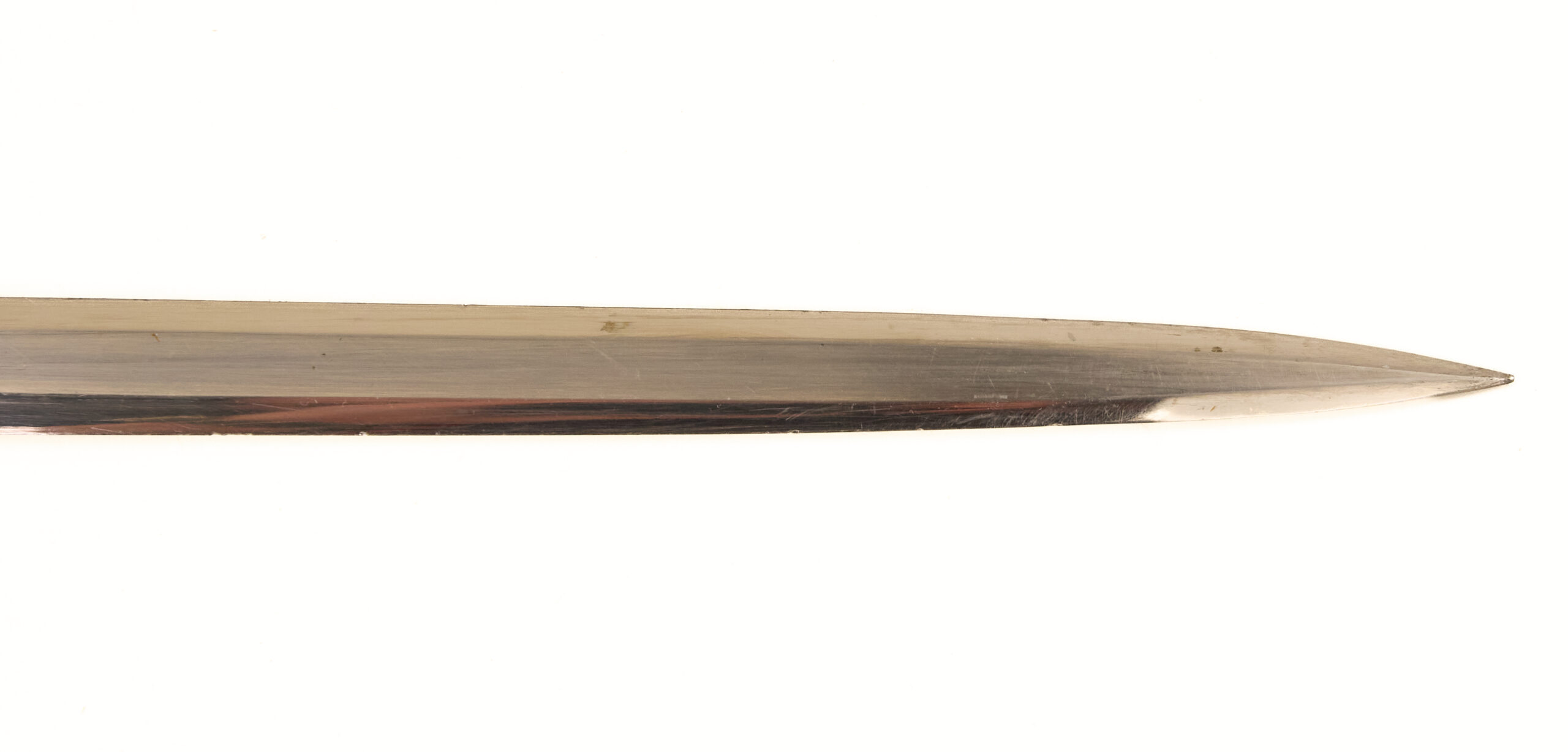 The blade measures 27¼ inches and retains a striking nickel-plated finish, with only light runner wear on the flats. A few small edge nicks are present, but the needle point remains intact. The reverse ricasso is crisply marked “E. & F. HÖRSTER / SOLINGEN” within the firm’s oval lozenge, enclosing the distinctive downward-pointing sword piercing the interlocked HHS initials.