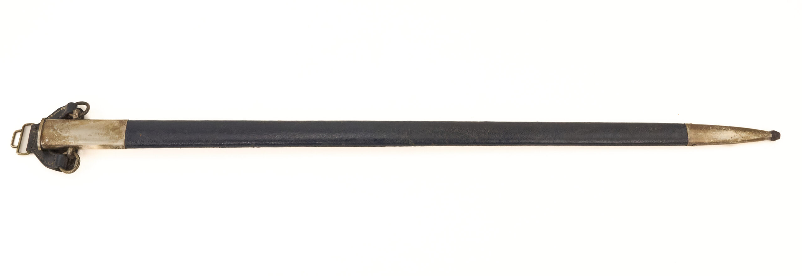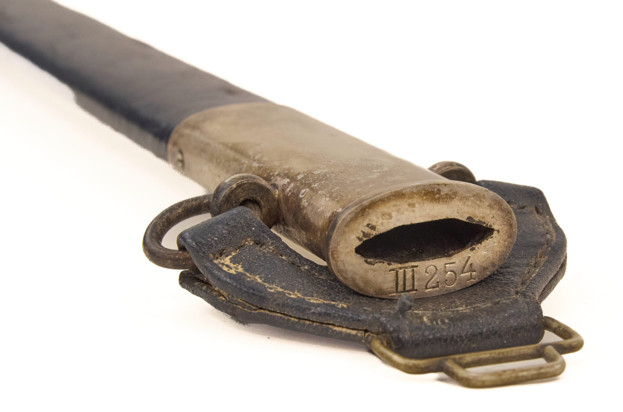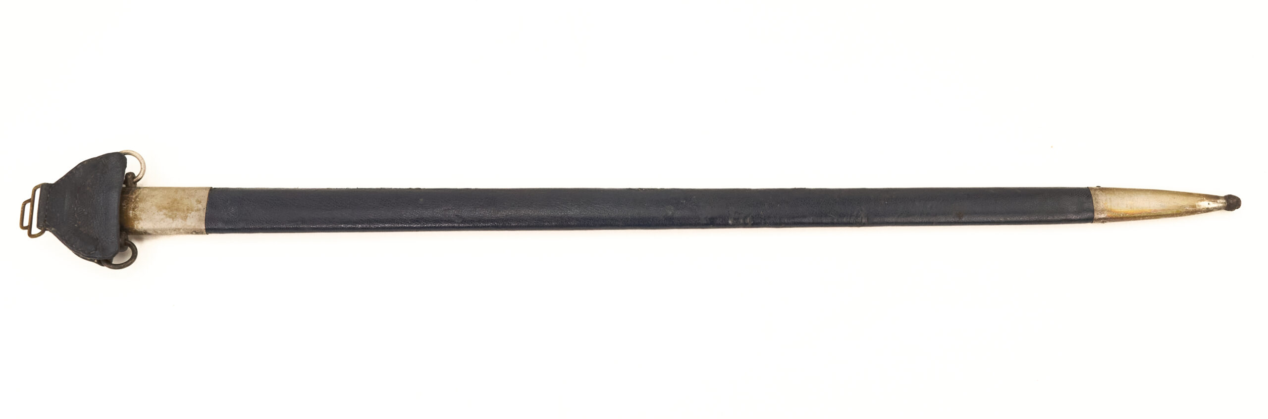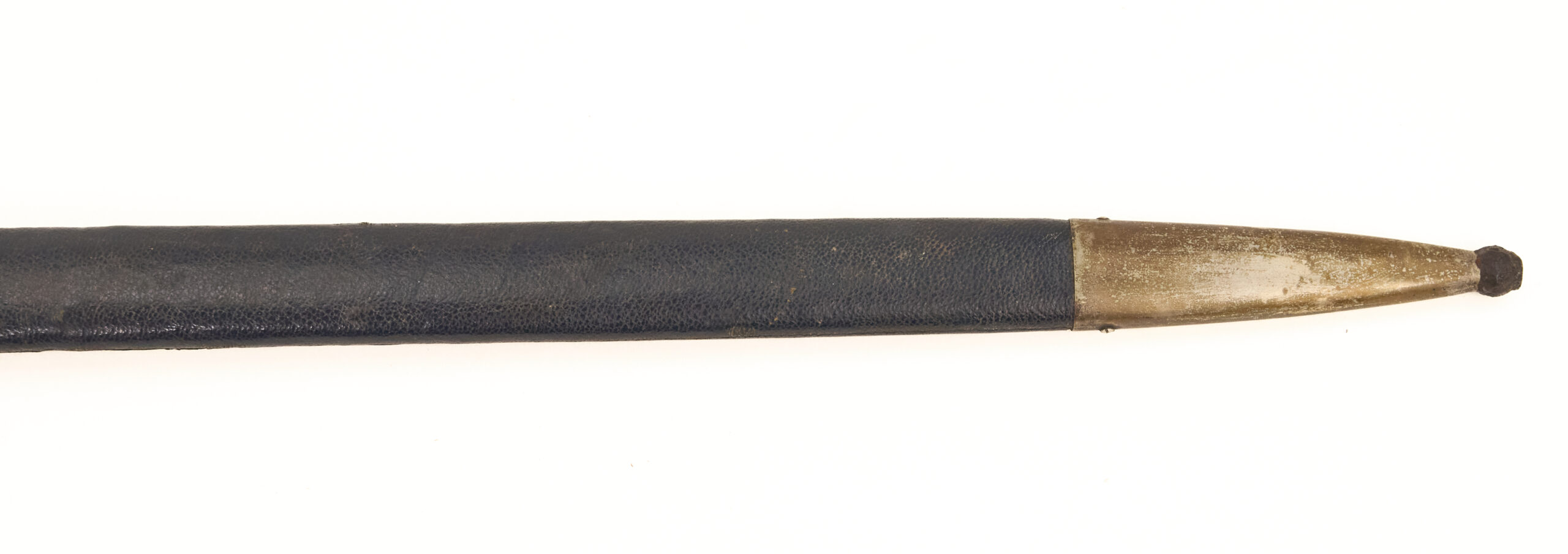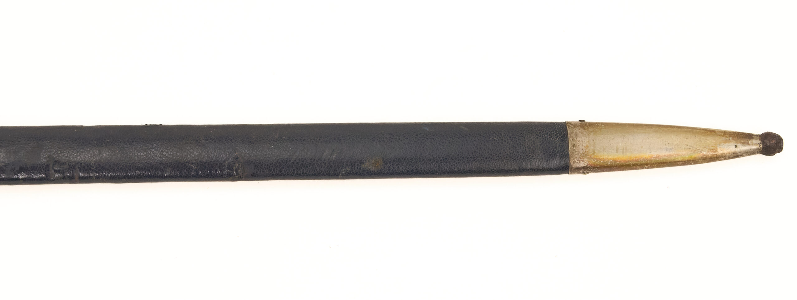 This example is notable for including the original leather frog for affixing the scabbard to a belt. These are often cracked and decaying if not outright missing. This example remains intact, with tight stitching and all hardware.