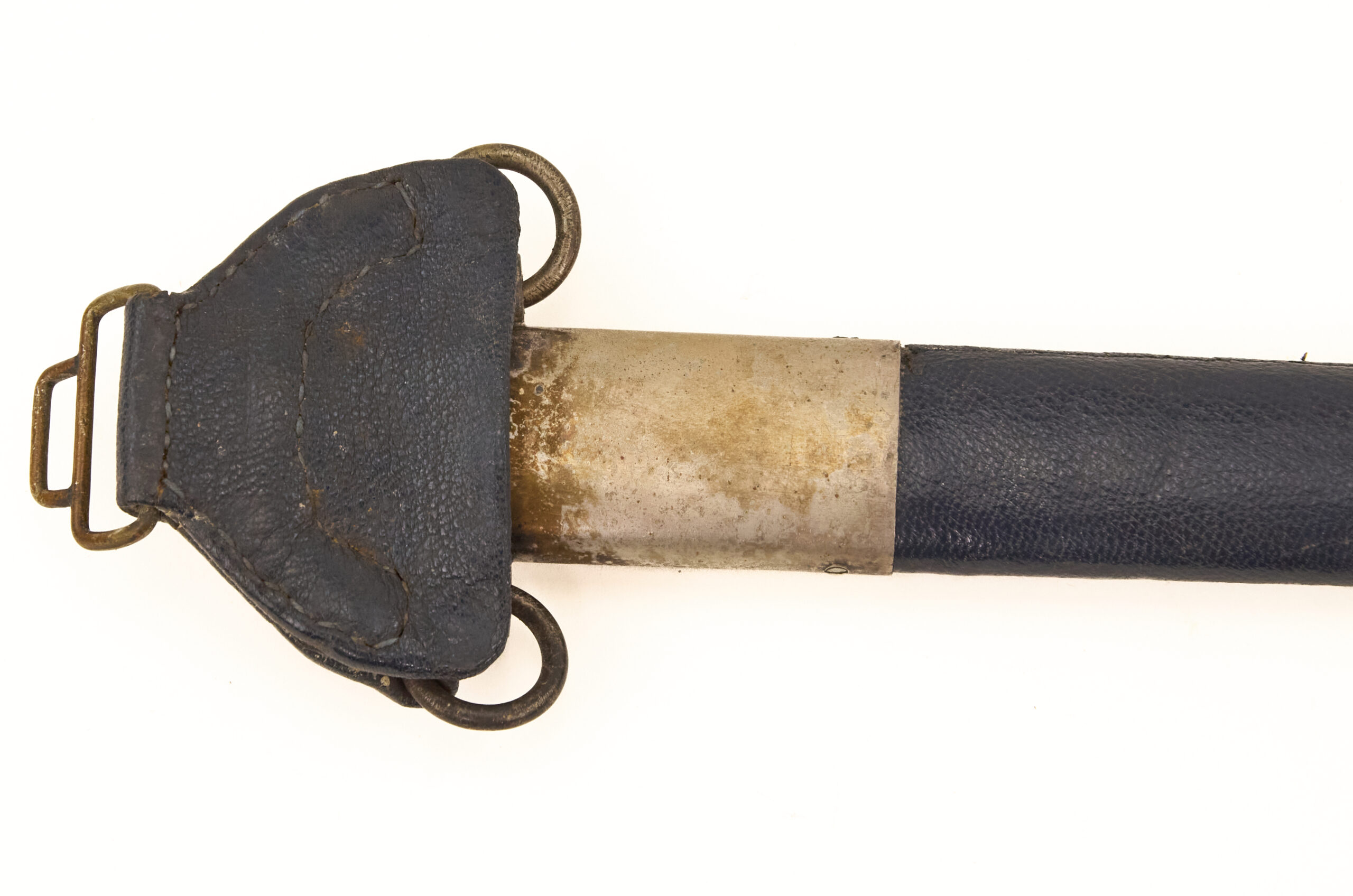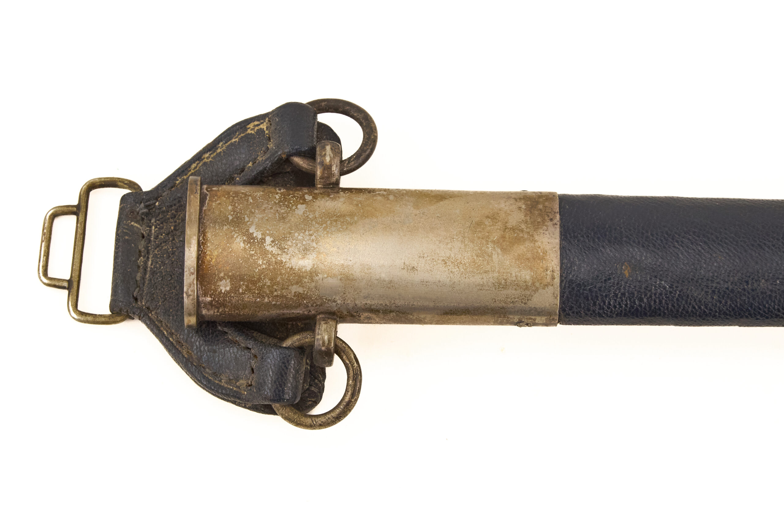 The scabbard is straight and undented, constructed of non-magnetic metal and covered in matching Moroccan blue leather. While there are scuffs, minor dents, and one area of leather loss exposing the aluminum body beneath, the seam remains firmly glued with no separation. The scabbard mounts match the sword’s nickel alloy fittings and retain much of their plating with attractive patination. The original leather sword hanger with box ring is present and complete.