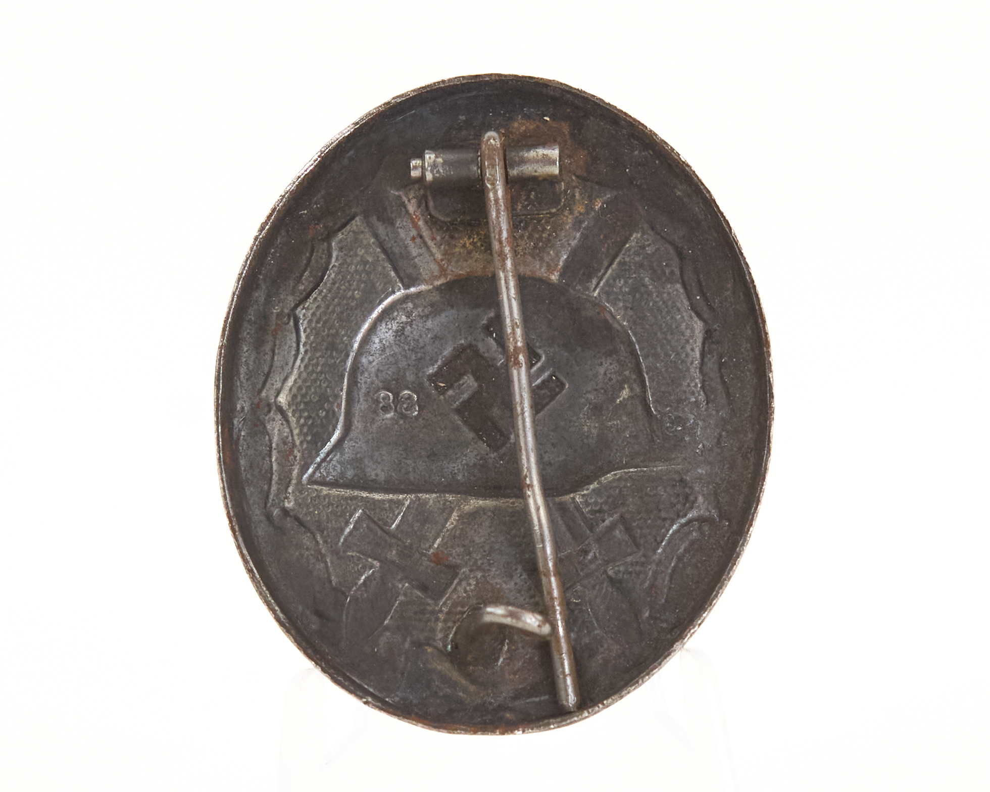 The reverse is maker marked “88”, identifying production by Werner Redo of Saarlautern, an established and well-documented manufacturer of Wound Badges. Badges by Werner Redo are characteristically marked with the “88” stamp, typically located on the reverse near the helmet, and are widely recognized by collectors for their correct early-war form and quality.