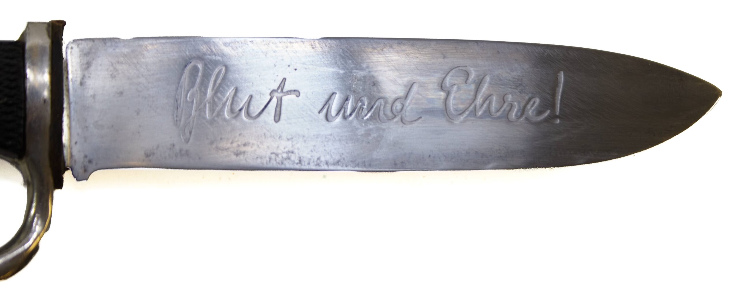 The blade bears its original motto engraving, and the grip panels and emblem remain intact. The steel scabbard shows honest field wear, adding to the piece’s historical character. Items like this were issued to members of the Hitlerjugend as symbols of loyalty and discipline, making them highly sought after by collectors of WWII German militaria.