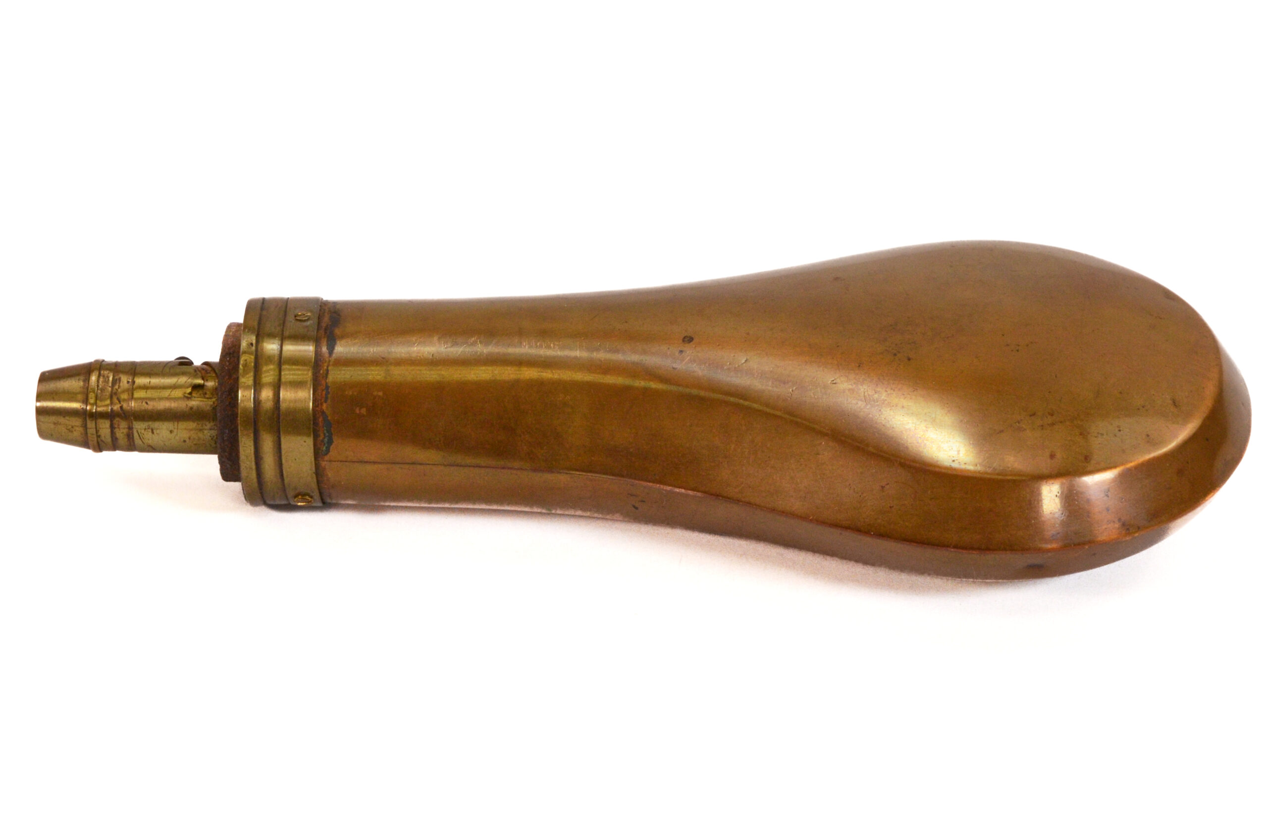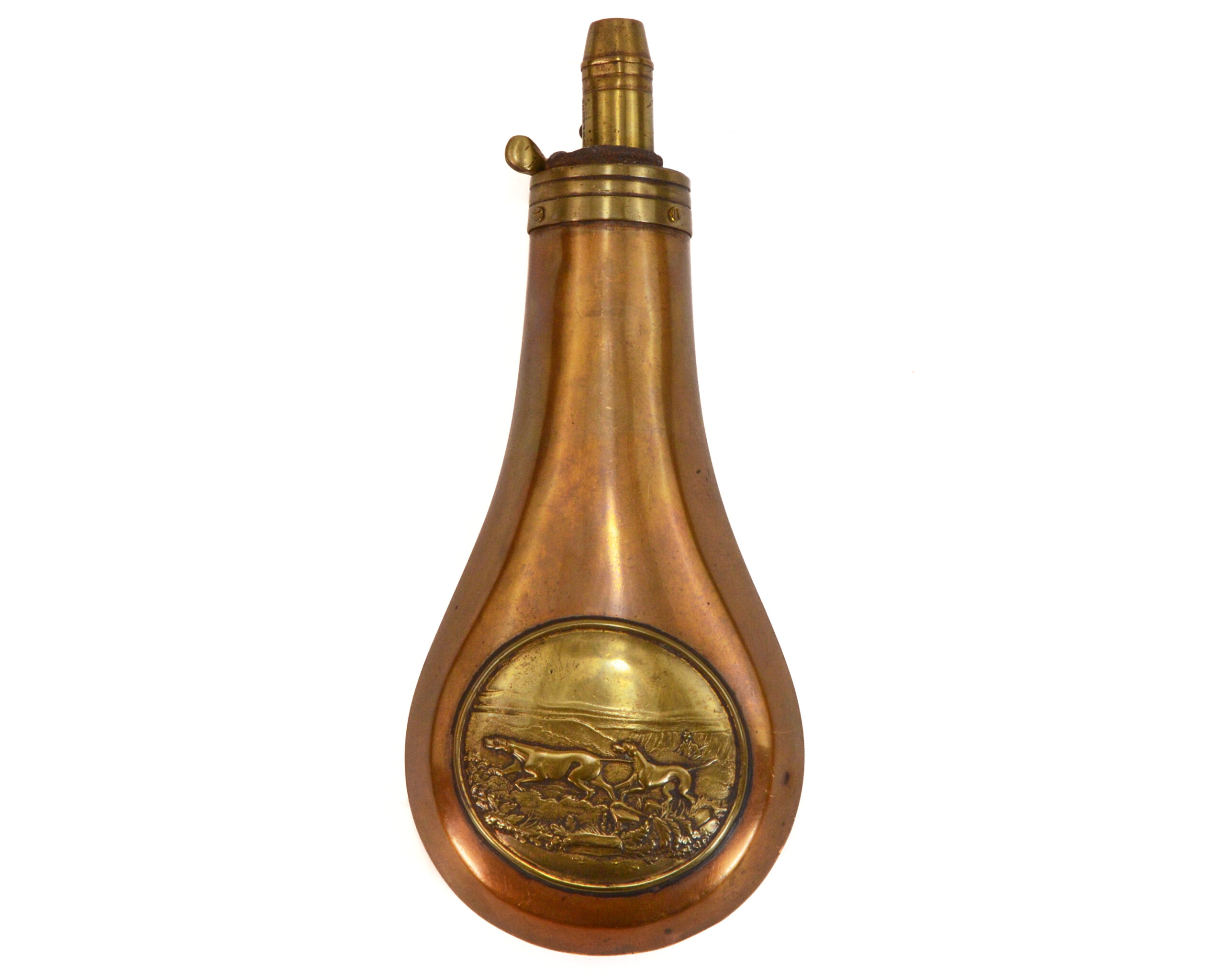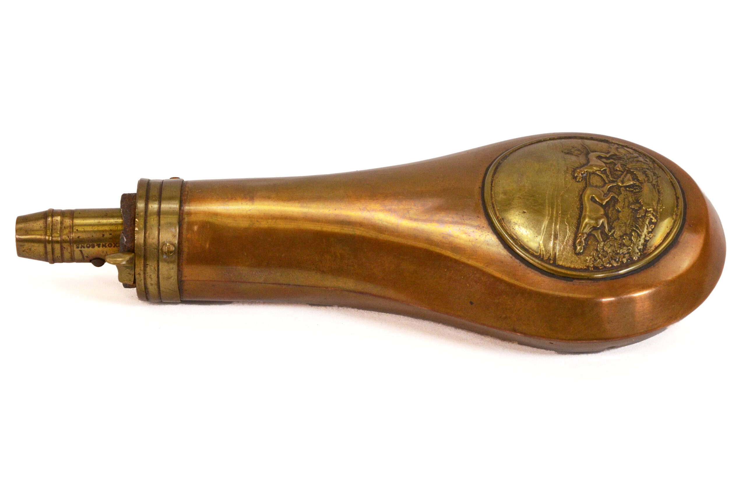 James Dixon & Sons Engraved Brass Game Scene Powder Flask – Copper Body with Brass Fittings