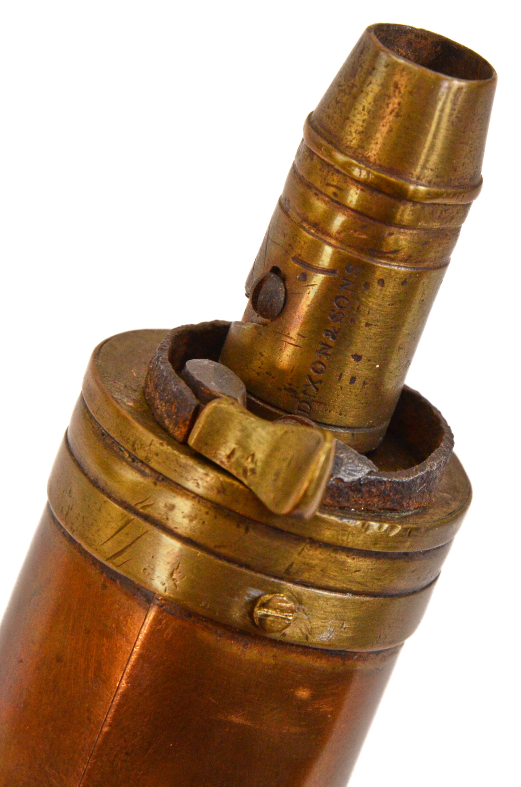 Own a piece of history with this James Dixon & Sons powder flask, featuring a copper body and brass fittings. The flask showcases an engraved brass plate depicting a classic game scene, highlighting the exceptional craftsmanship of this renowned 19th-century British maker. Its intricate detailing and durable construction make it a sought-after item for firearms collectors, historical reenactors, and antique enthusiasts. This flask is not only a functional powder container but also a stunning display piece, perfect for enhancing a Victorian-era or antique firearms collection. The combination of engraved brass artistry, rich copper patina, and sturdy brass fittings embodies both beauty and historical authenticity. Rare and collectible, this James Dixon & Sons powder flask is an ideal addition for anyone seeking high-quality antique firearm accessories or unique decorative collectibles. Add a touch of history and craftsmanship to your collection today.