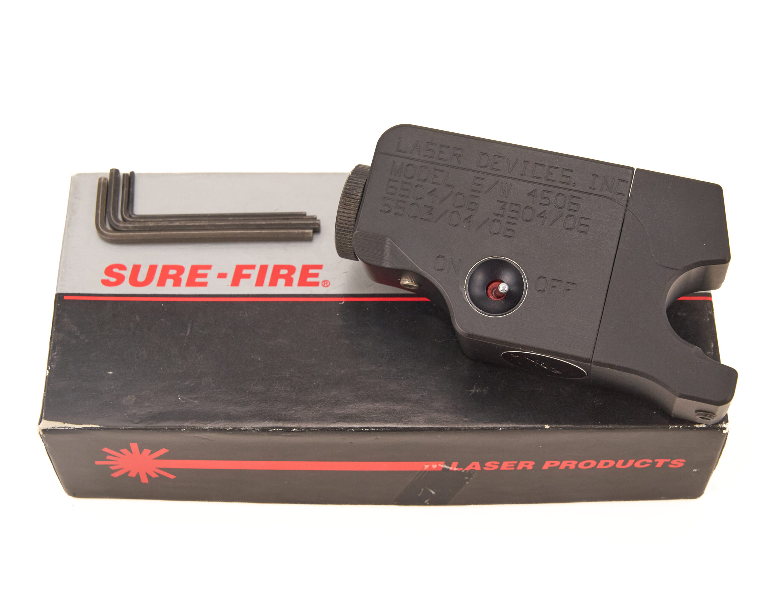This Laser Devices, Inc. Model 5/W frame-mounted laser sight is an early pistol laser unit made for the Smith & Wesson 4506, 3904-3906, and 5903-5906 series pistols, dated October 1, 1992. It remains in very good condition and includes its tools. As a result, it stands as a strong example of the first serious generation of handgun-mounted aiming lasers adopted during the early 1990s.
