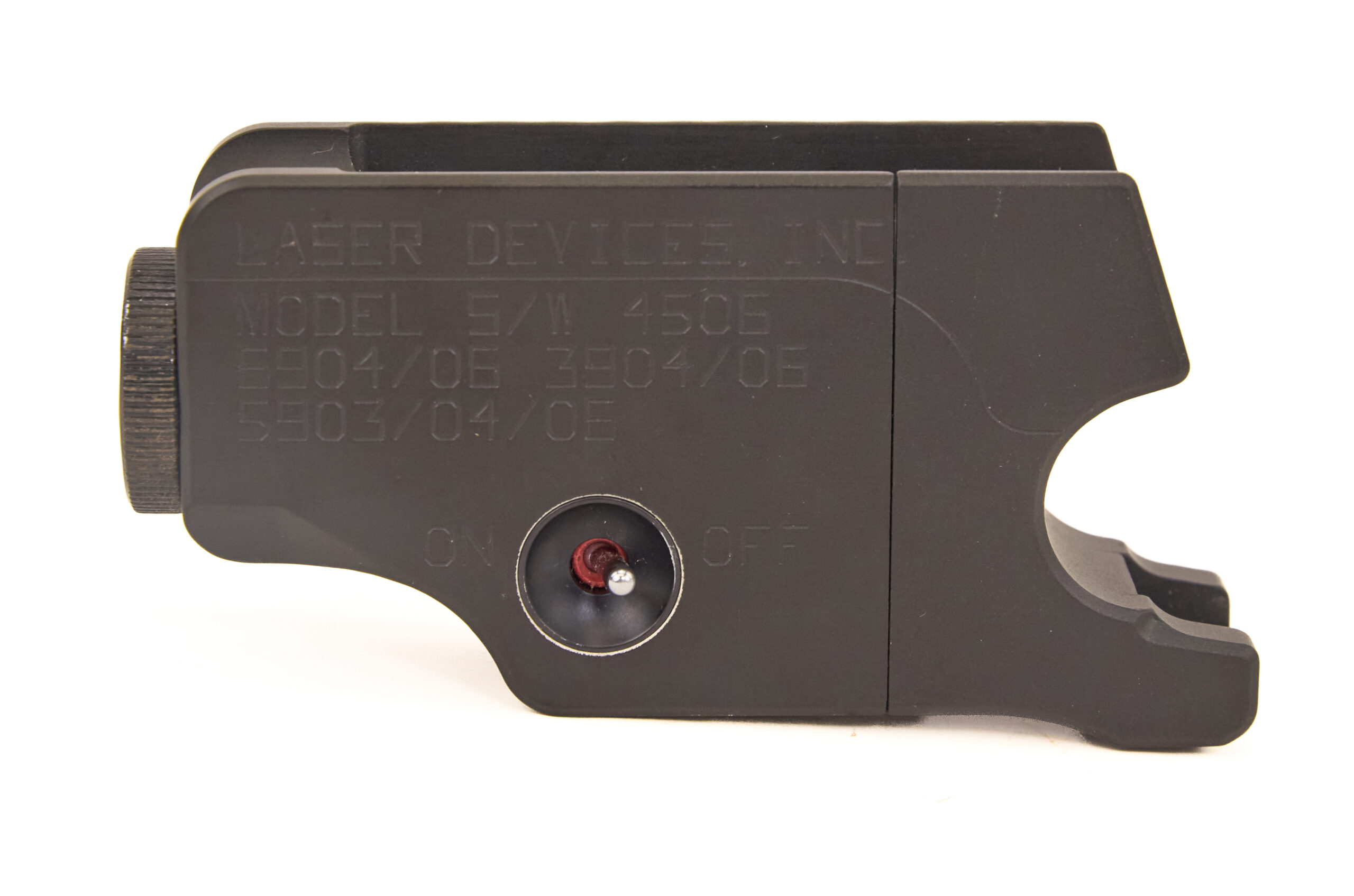 This unit is a frame-mounted laser sight made by Laser Devices, Inc. for the Smith & Wesson 4506 / 3904-3906 / 5903-5906 series pistols. It is dated October 1, 1992, which places it squarely in the early years of practical handgun laser use. The sight was designed as a dedicated fitment rather than a generic clamp-on accessory. That model-specific approach is one of its most important features, because it reflects how pistol lasers were engineered before rail systems became dominant.