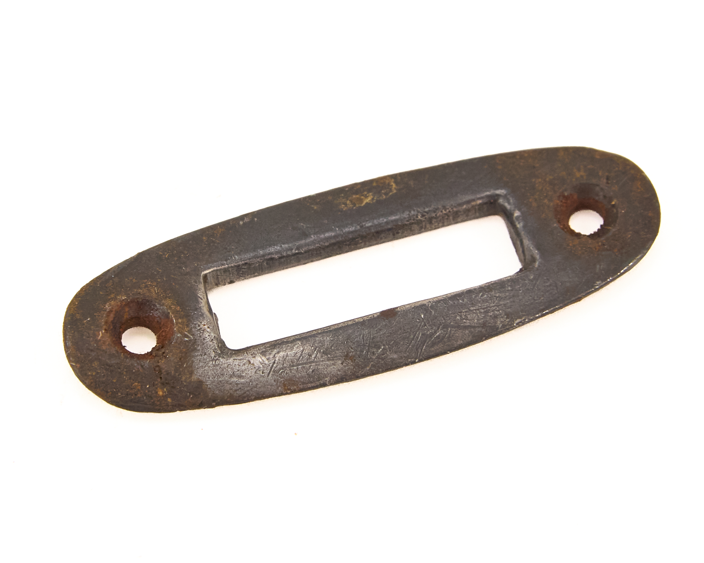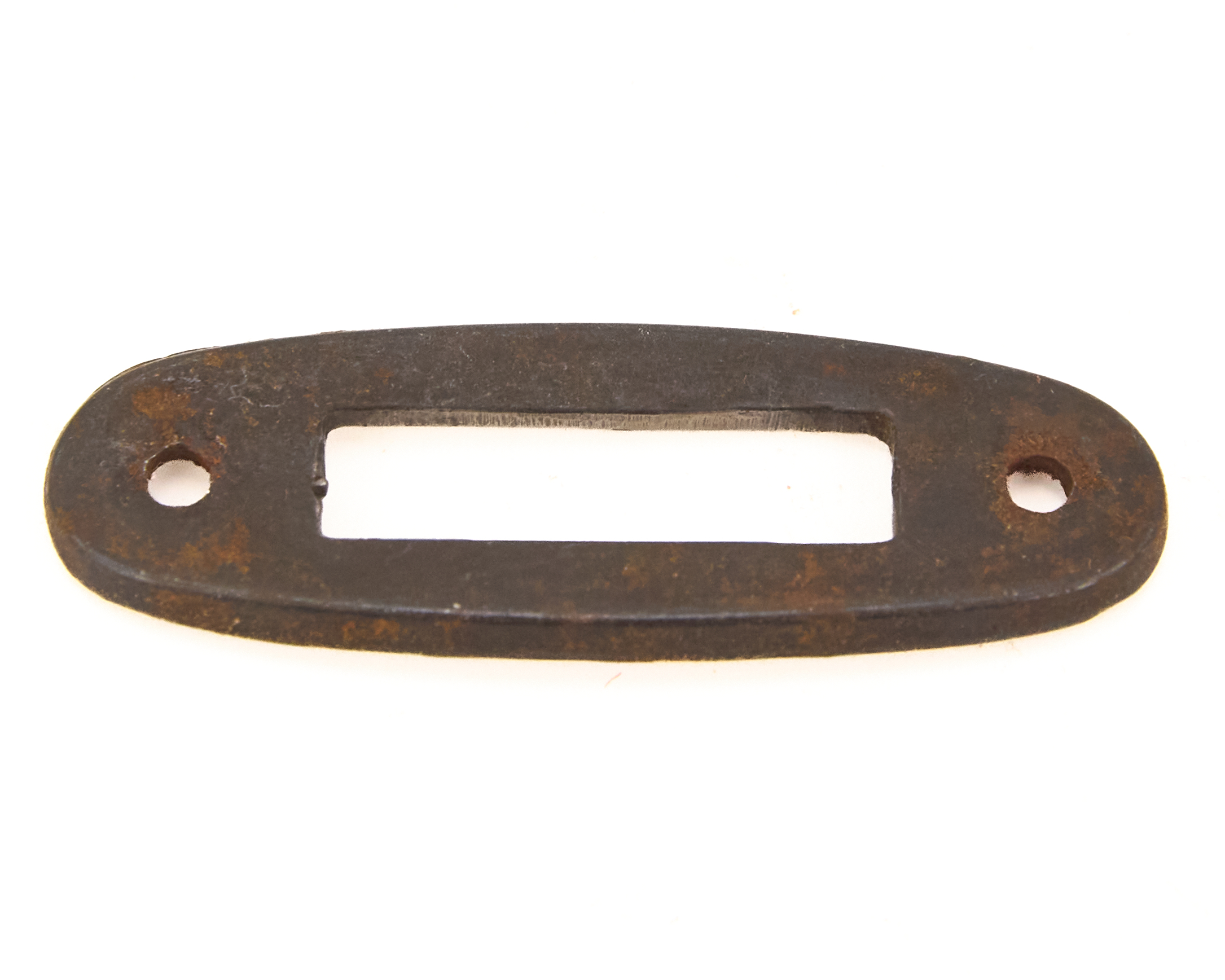 This Mosin Nagant 91/30 sling escutcheon listing covers original surplus stock hardware used around the sling slots on Mosin-Nagant rifles. The group includes a mix of Russian rectangular sling slot liners and Finnish round-hole sling swivel escutcheons. Because Soviet and Finnish service rifles used different sling arrangements, these parts show two distinct solutions to the same area of the stock.