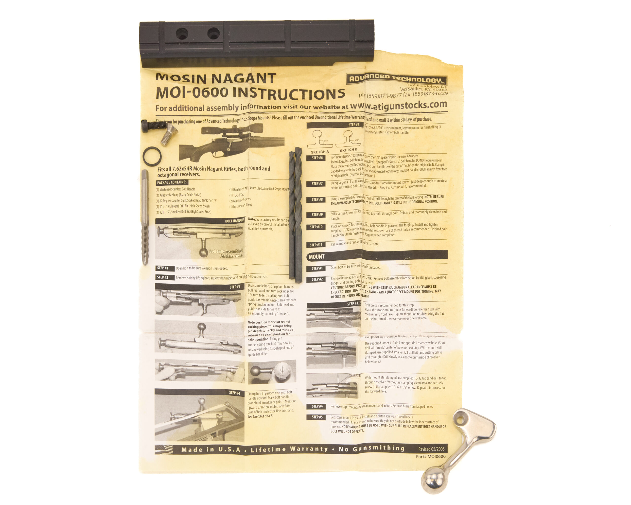 This is a commercial aftermarket conversion set rather than a military issue accessory. The presence of the original packaging and paperwork helps identify the kit and confirms the maker and model reference. Overall, this is a complete Advanced Technology scope mounting kit for the Mosin Nagant platform, offered as a packaged accessory set with its original components and documentation.