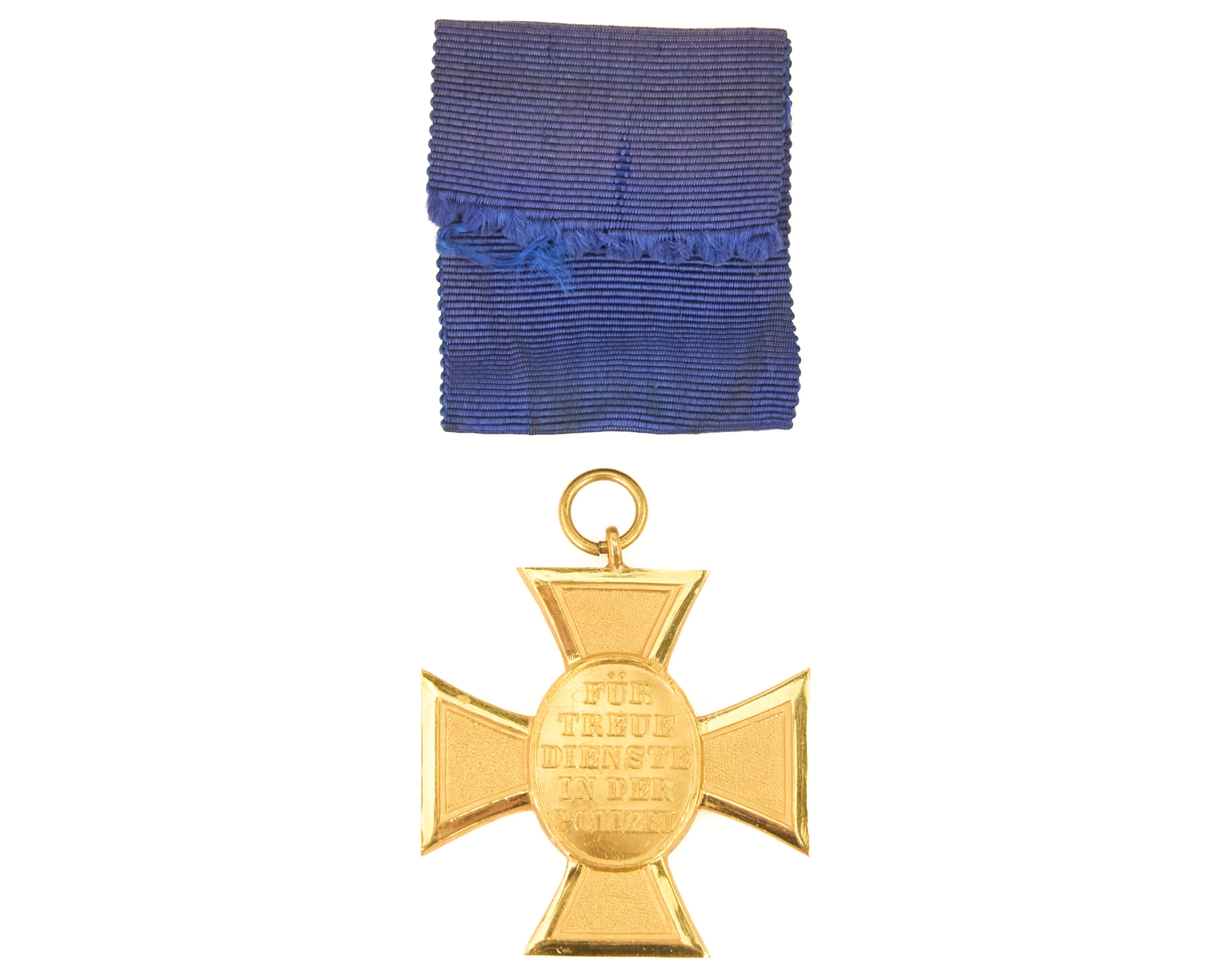 This is an original Ordnungspolizei (Order Police) Long Service Award, 1st Class, instituted to recognize 25 years of faithful and honorable service within Germany’s uniformed police organizations during the Third Reich period. Long service awards for the Ordnungspolizei were distinct from Wehrmacht decorations and were intended to reward sustained commitment to police service rather than combat activity.