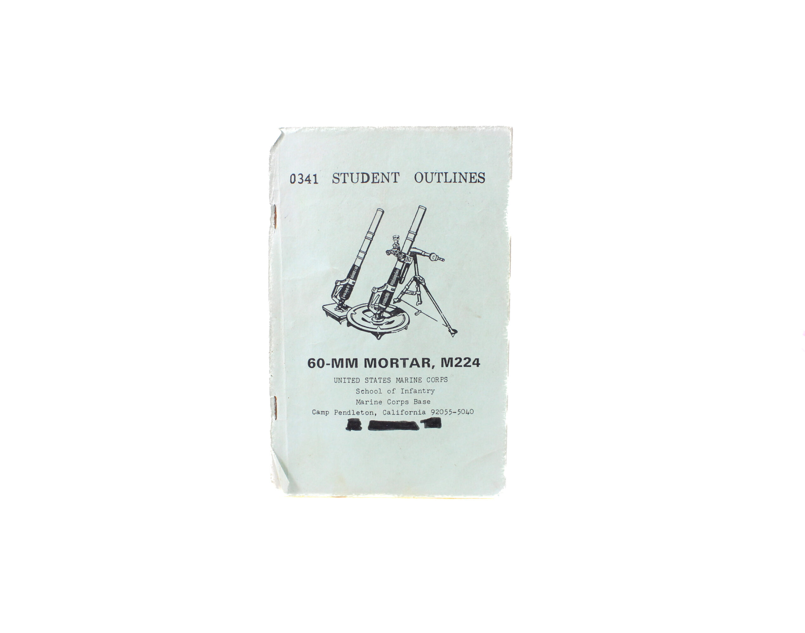 This is an authentic U.S. Marine Corps training manual titled “0341 Student Outlines – 60 mm Mortar M224,” issued by the School of Infantry, Camp Pendleton, California. Designed for Marines training as MOS 0341 Mortarmen, this manual provides detailed instruction in the employment, operation, and maintenance of the M224 60mm mortar system.
