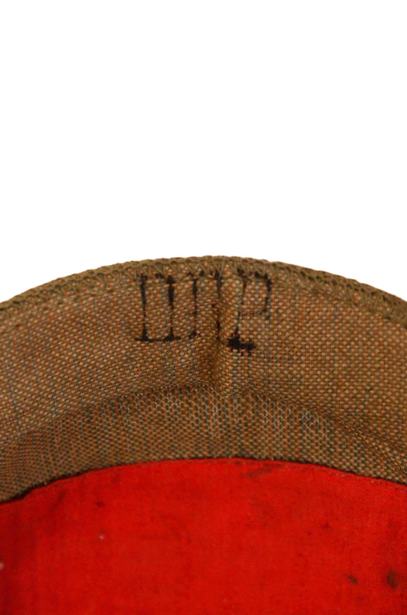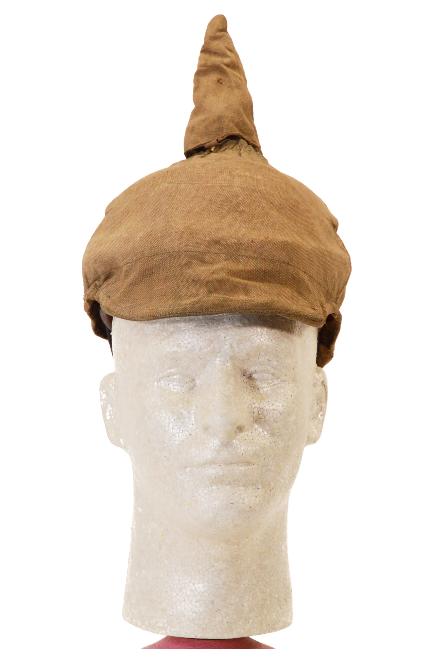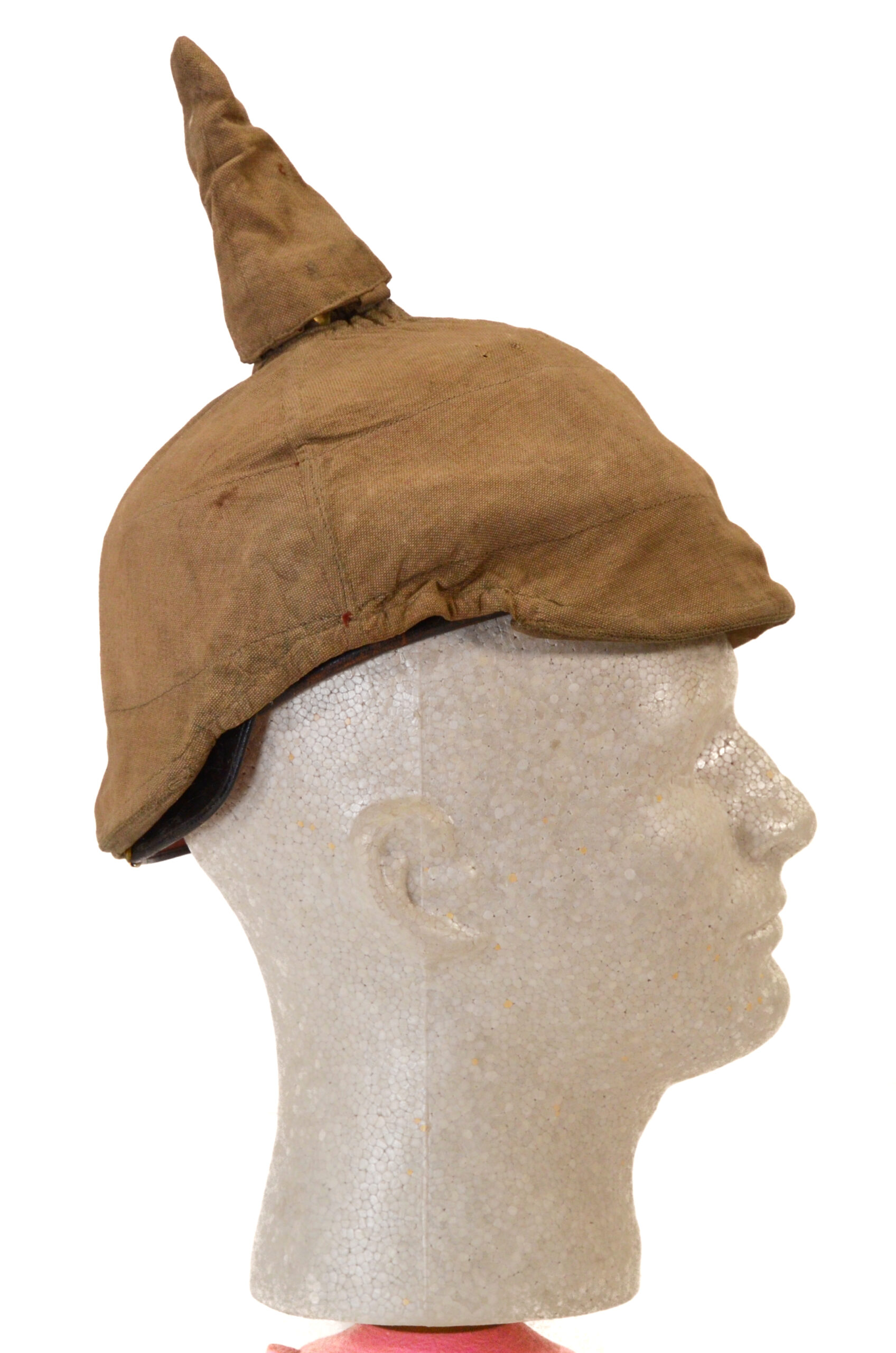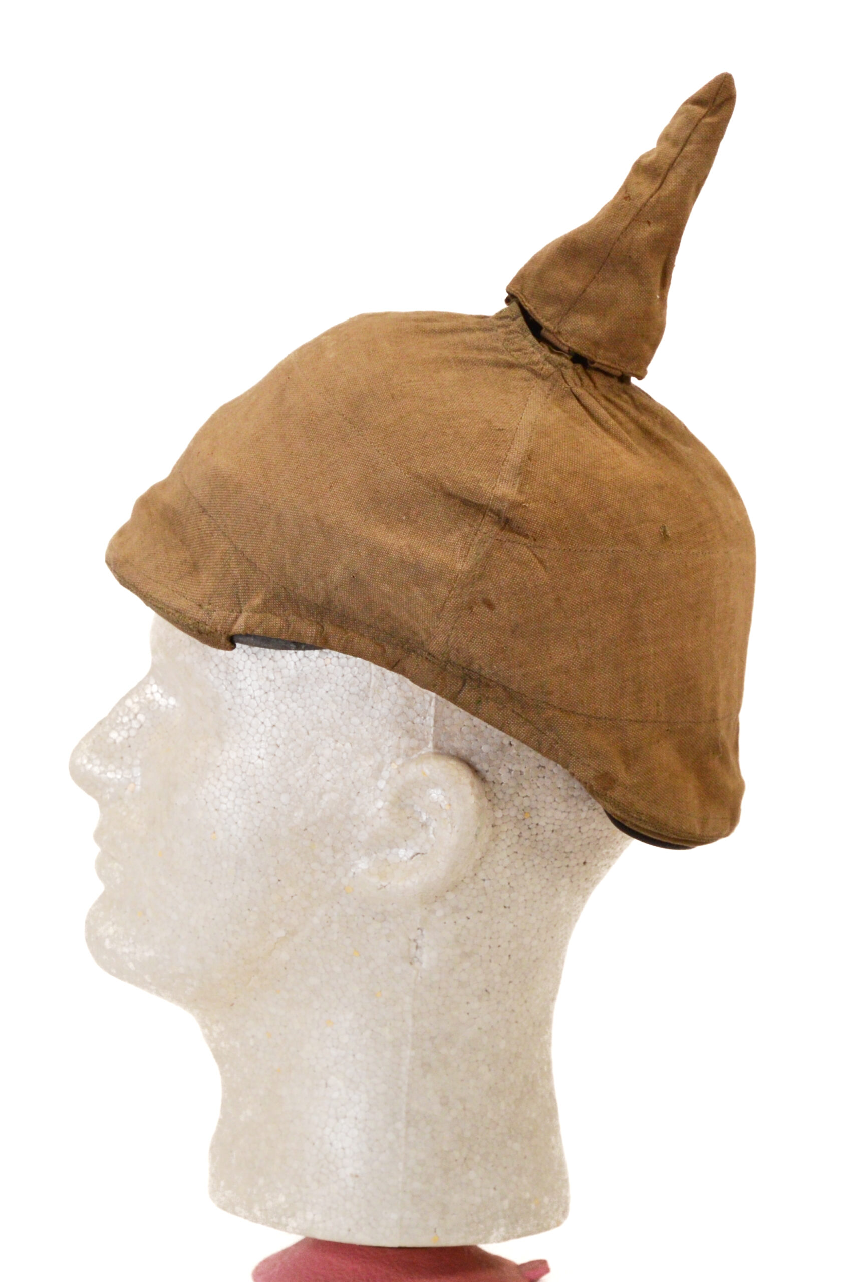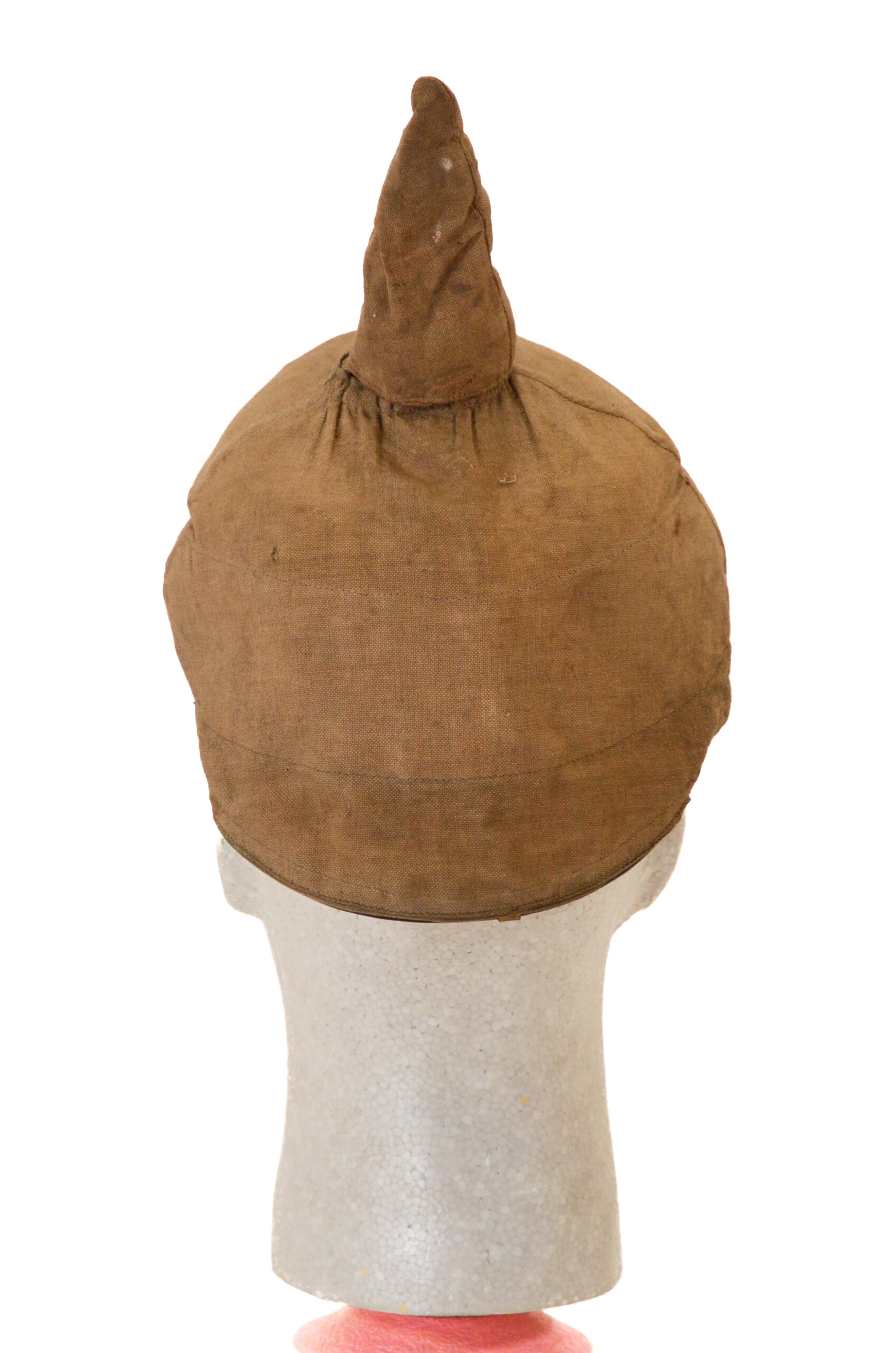 The shell is the correct Brass body typical of officer-grade 1897 patterns and retains the original spike mounting. The helmet wears a period Überzug—a fitted cloth cover that was commonly used in the field to reduce glare, protect the finish, and provide concealment. The cover fits the shell closely and shows authentic wear and age appropriate to a wartime example.