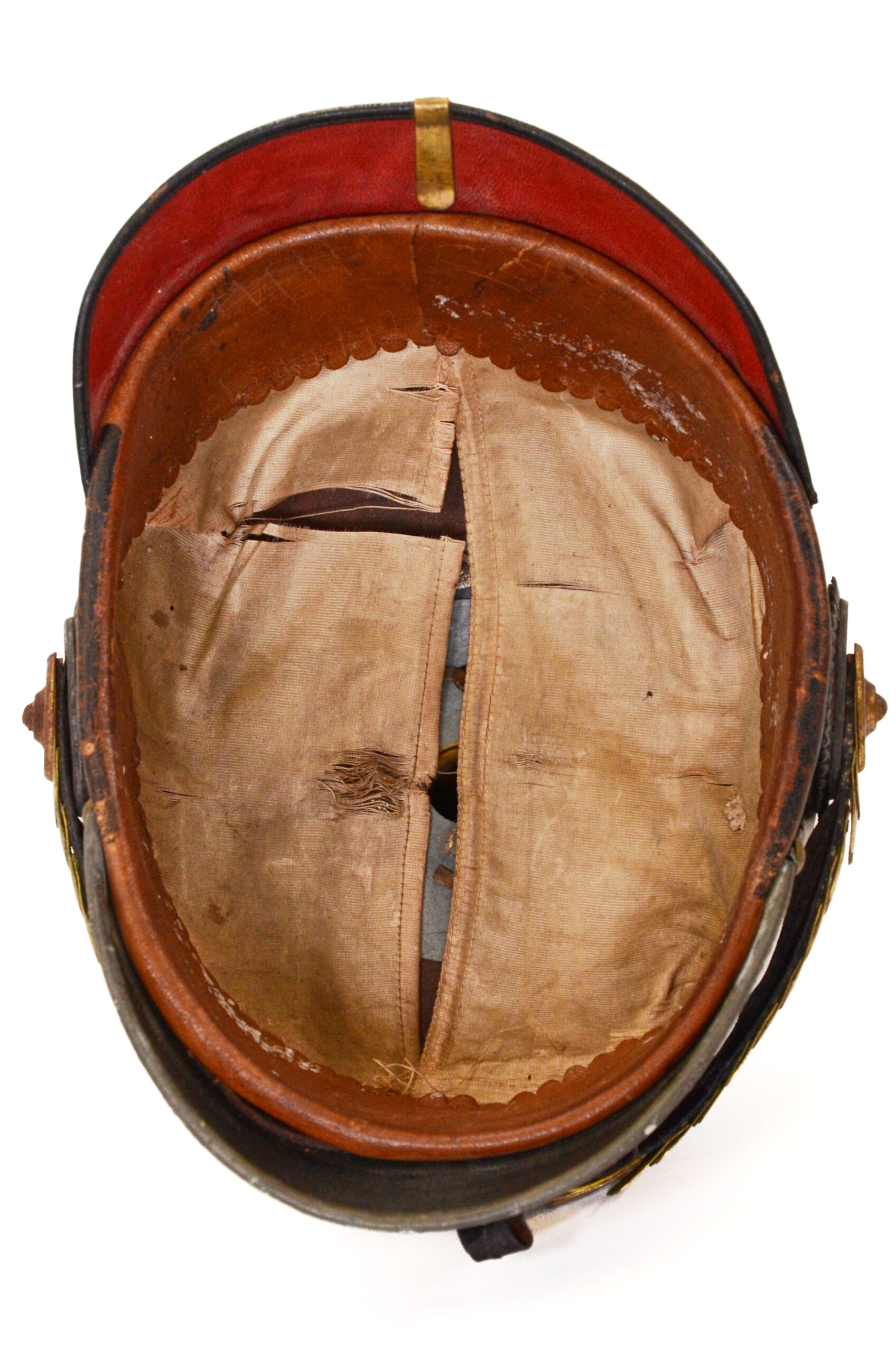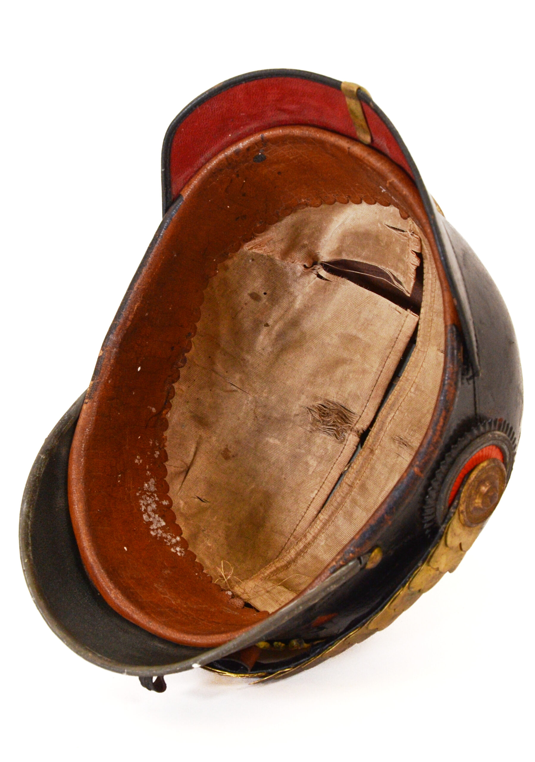 Interior details include the original fabric liner and Leather chinstrap with brass adornments, which show expected age patina and service use. Exterior fittings—spike base, frontplate mount, and trim—present honest surface wear, with areas of finish loss and age toning consistent with frontline service and storage.