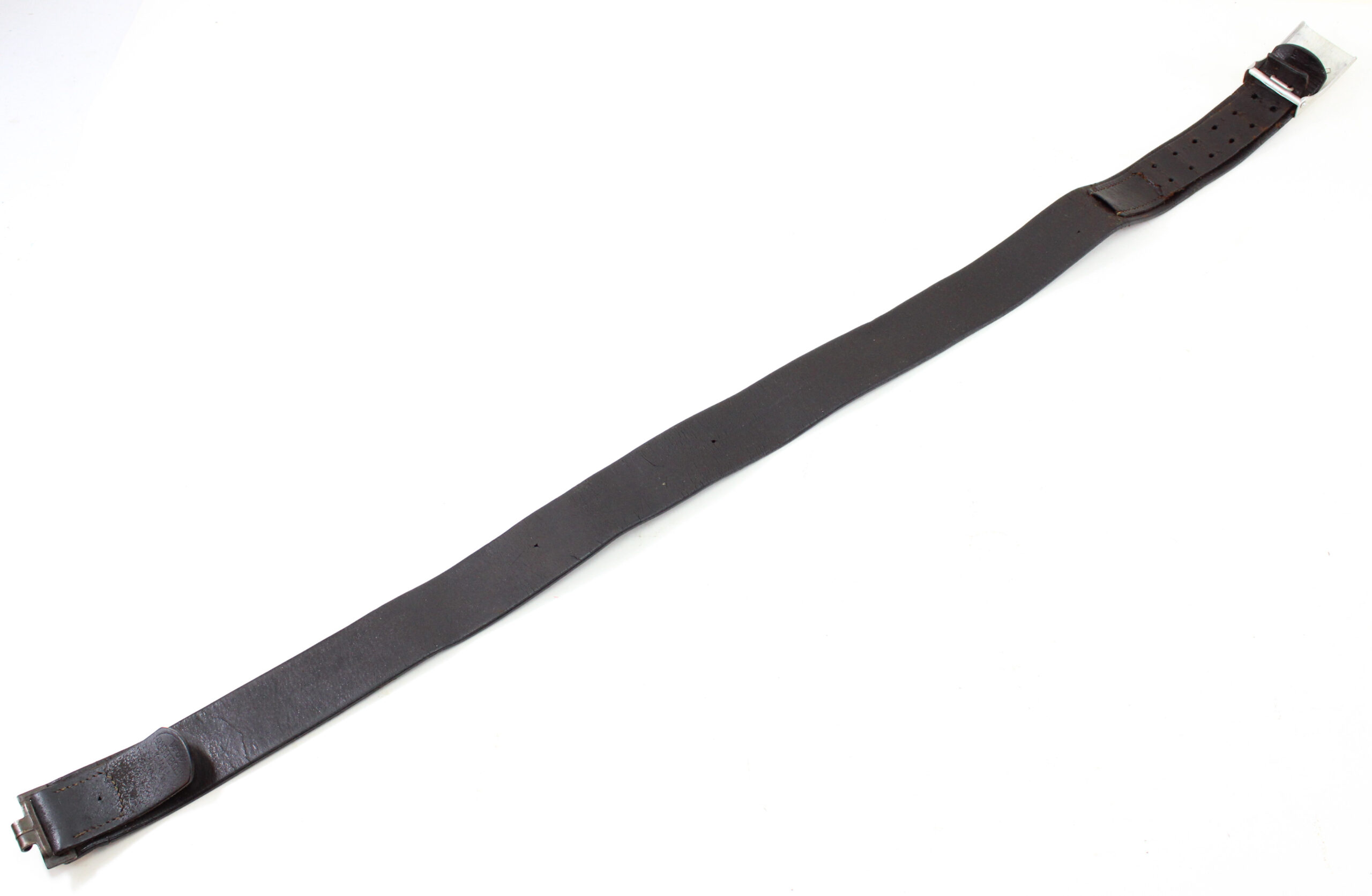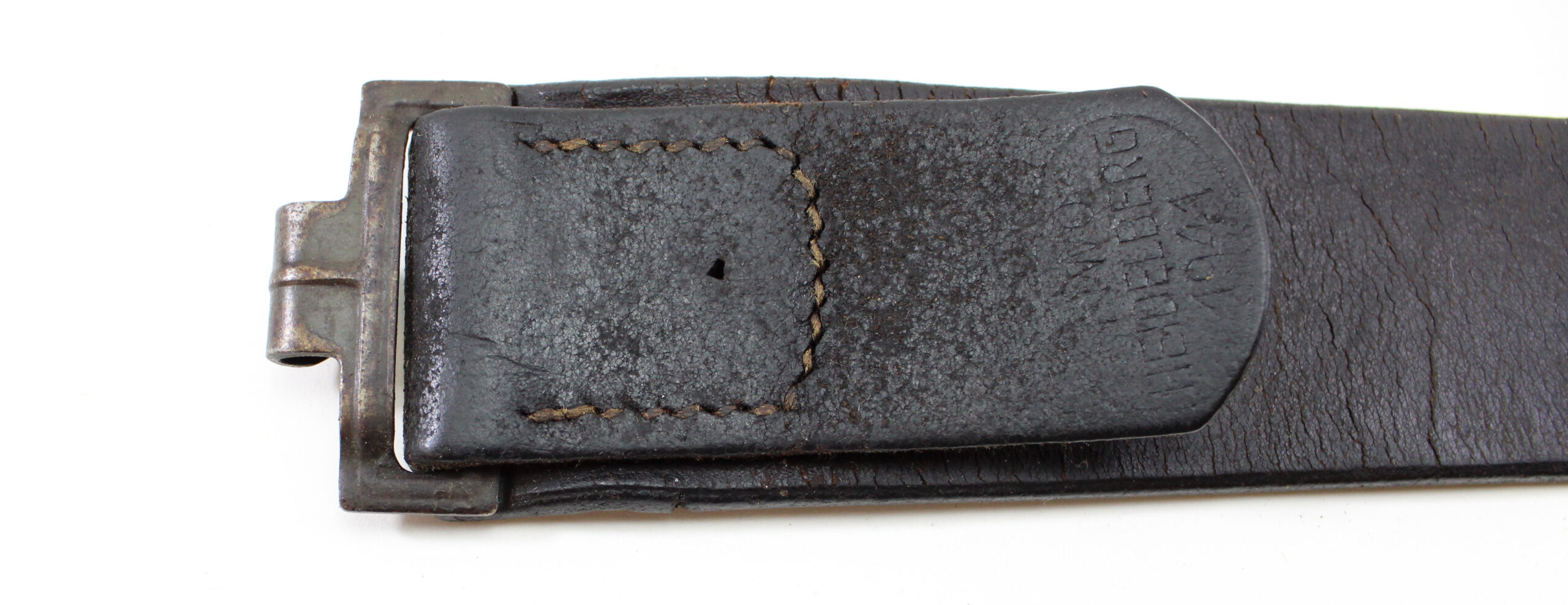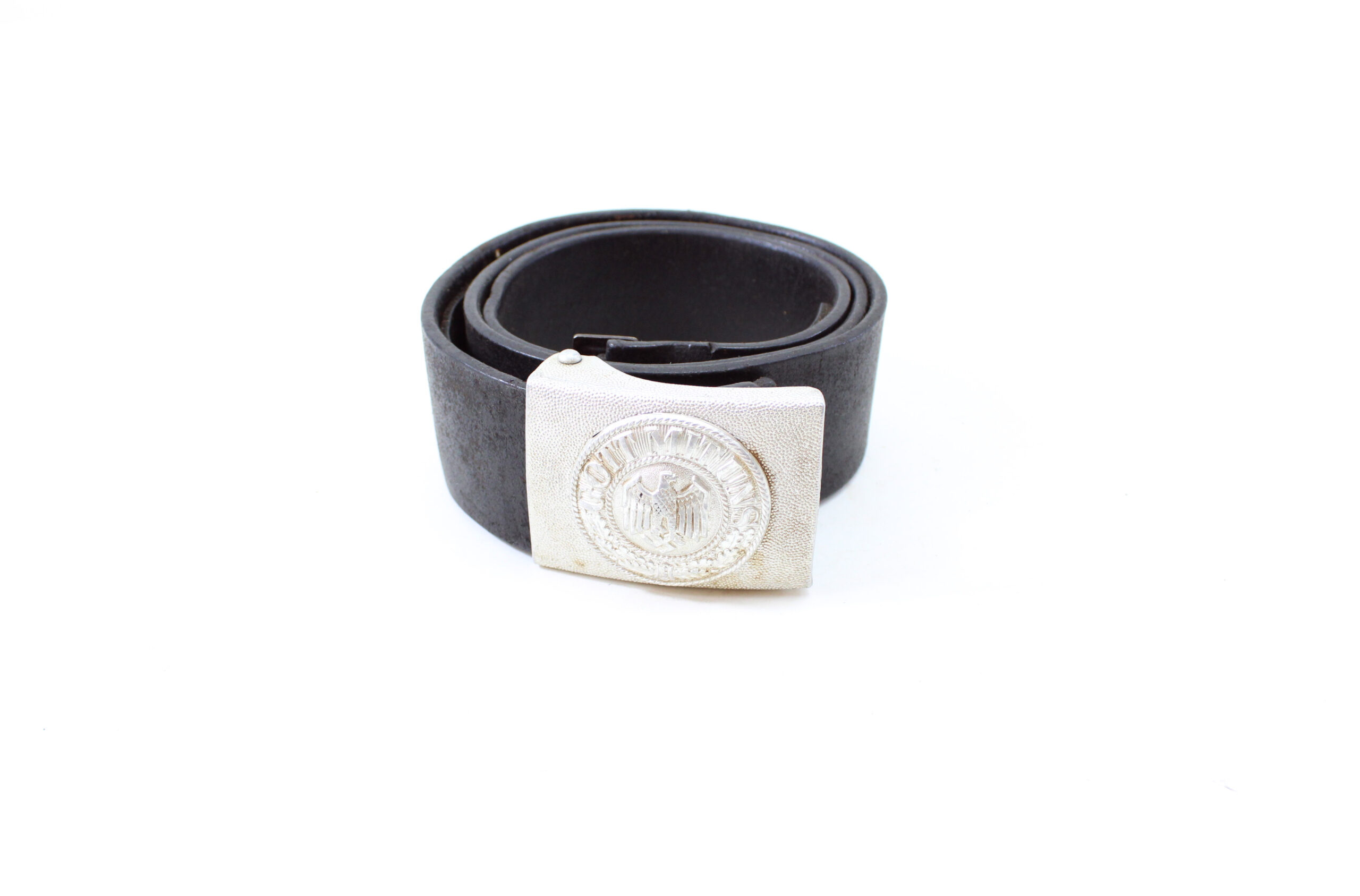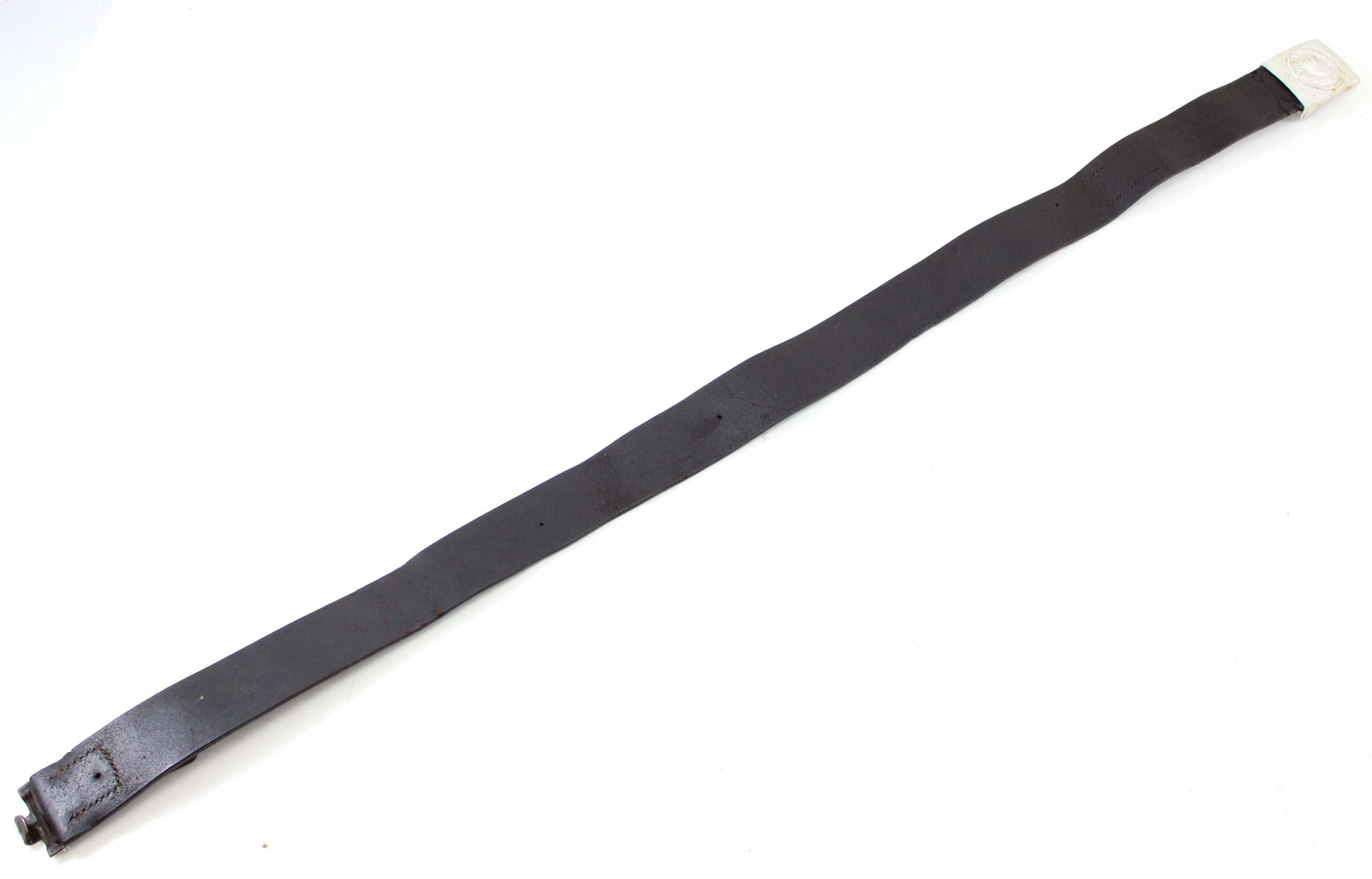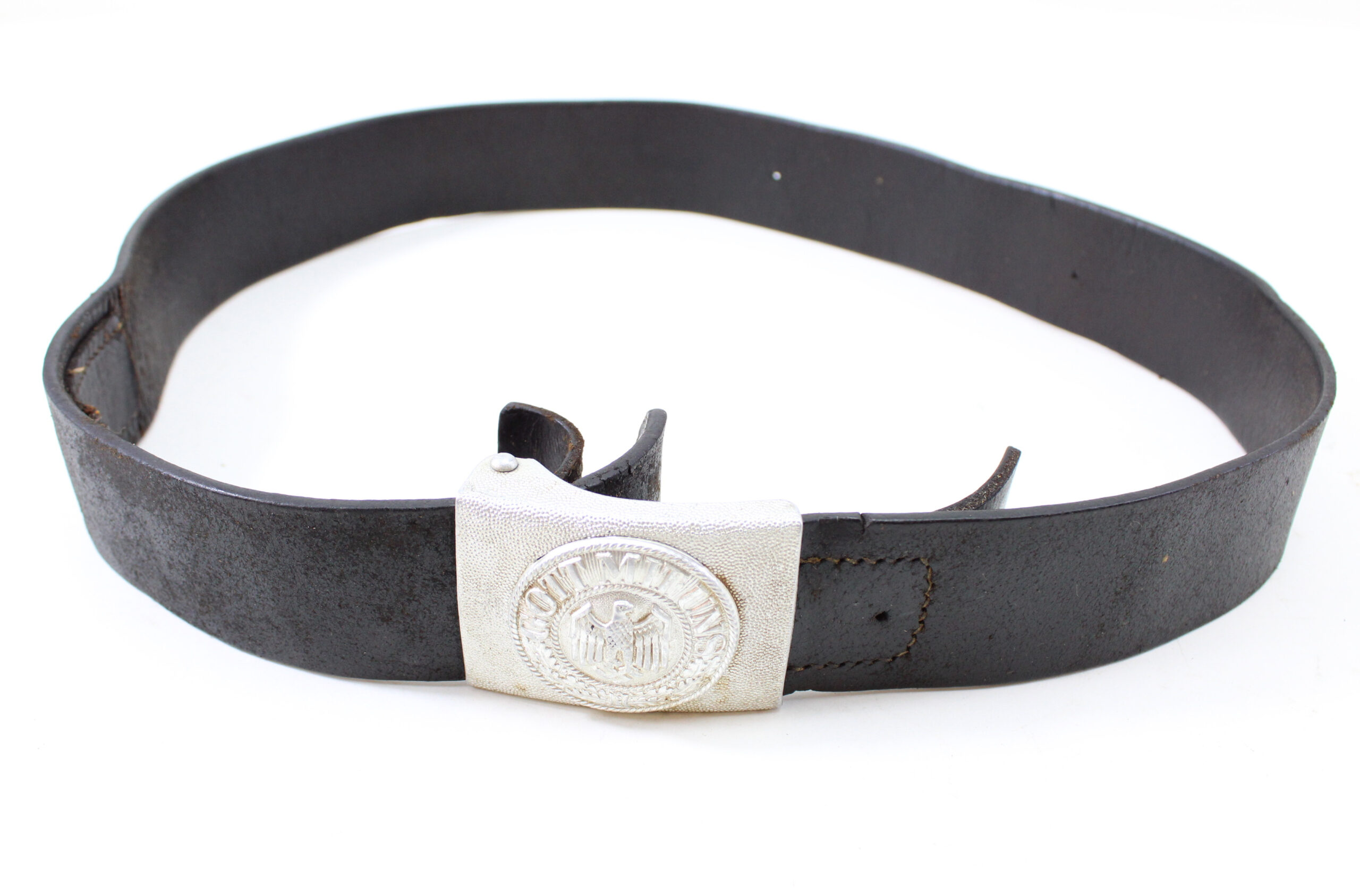 Authentic WWII German Army (Heer) enlisted man’s and NCO’s black leather belt, complete with its original pebbled aluminum dress buckle and clearly stamped “Heidelberg 1941” on the leather.