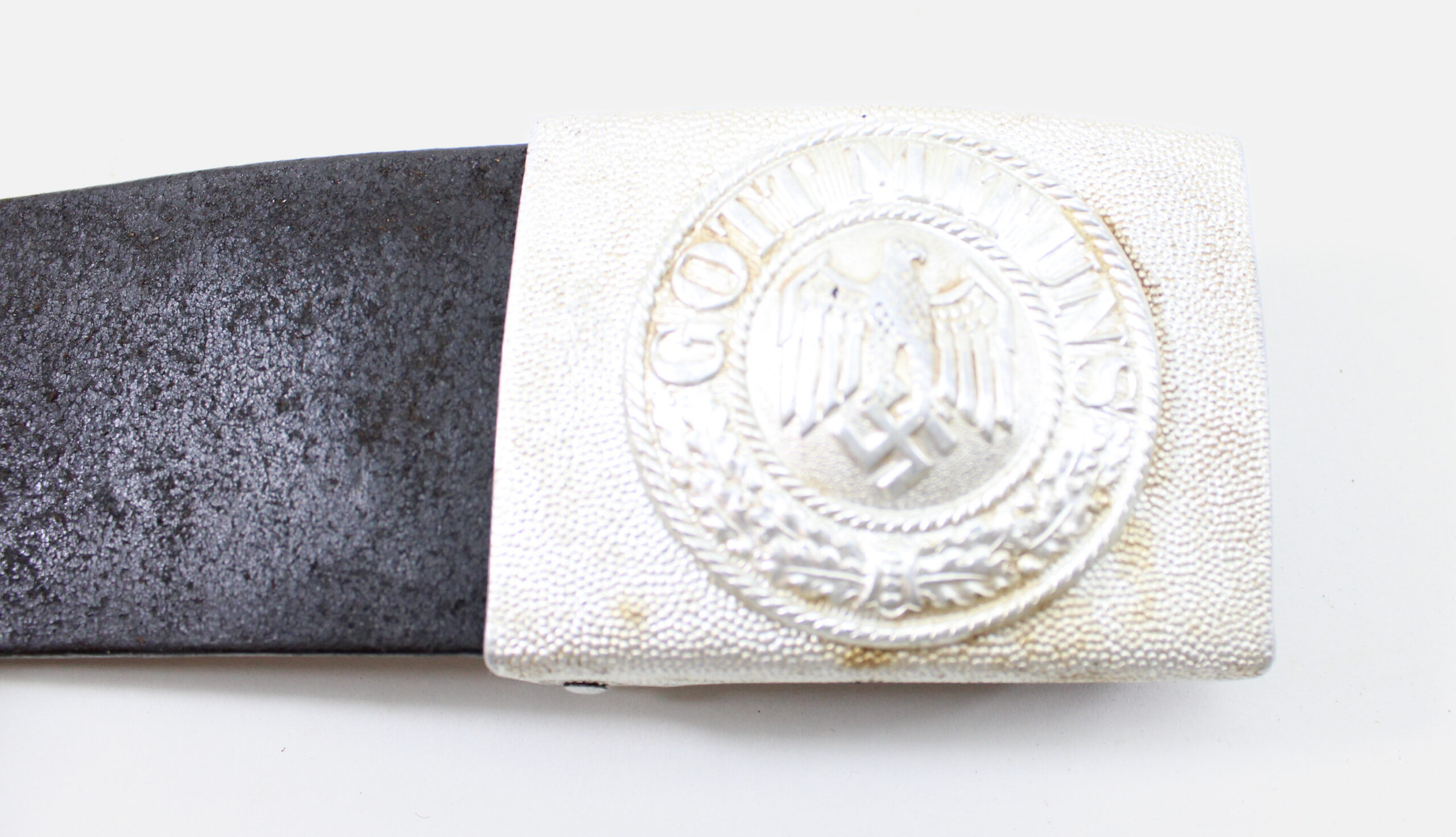 The buckle is the standard Heer issue aluminum type, with a pebbled background and the Wehrmacht eagle clutching a swastika, surrounded by an oak leaf wreath and the “Gott Mit Uns” motto. This style was regulation issue for enlisted men and NCOs, worn both in service and on dress/parade uniforms.