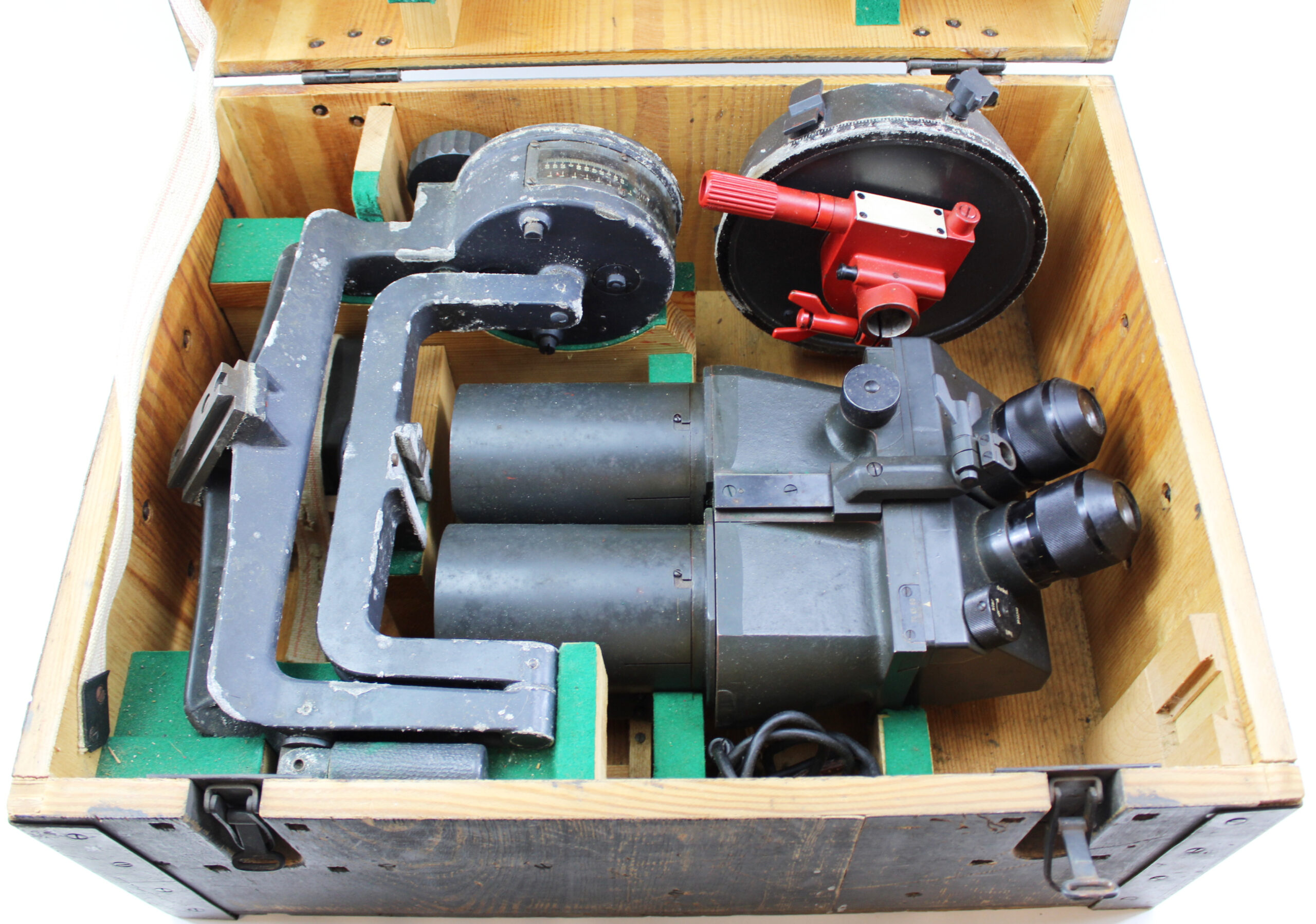 The set features 10x magnification with an 80mm objective lens, offering bright, clear optics in low-light conditions. Designed for rugged field use, the body is constructed of heavy-duty metal with wartime finishes and retains much of its original paint and fittings. Some sets may show wear consistent with age and military service, including scuffs, scratches, or patina — all of which add to its historical character.