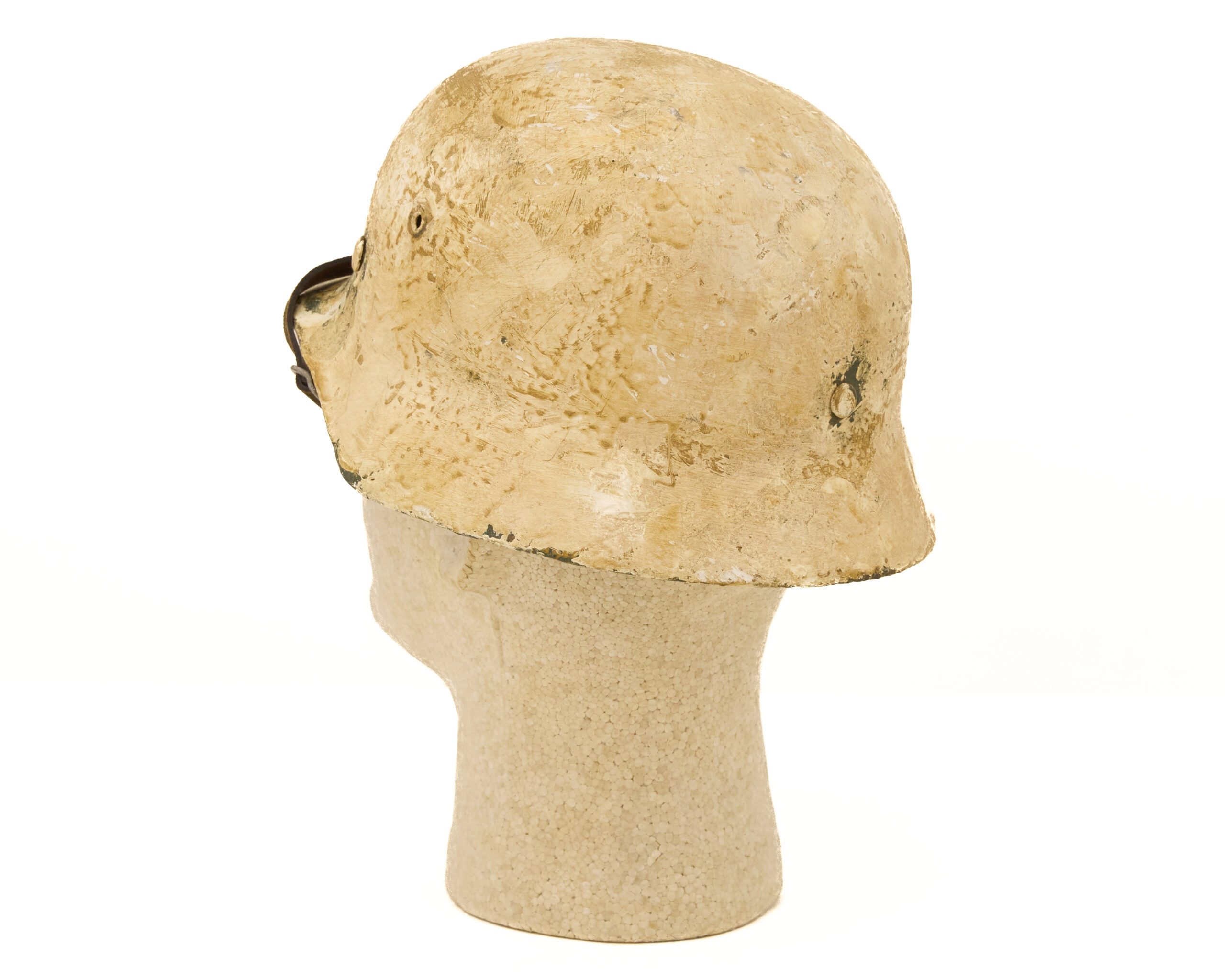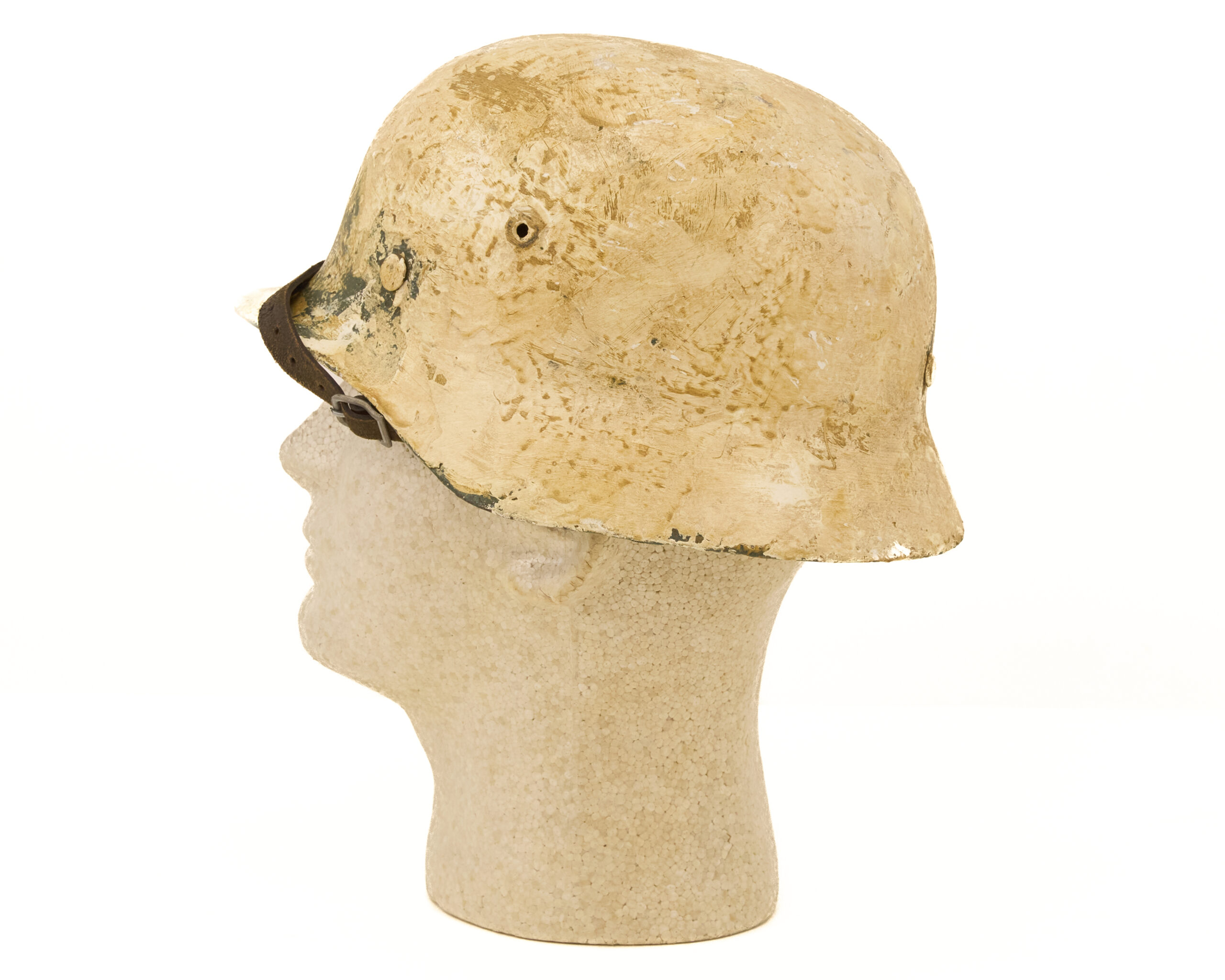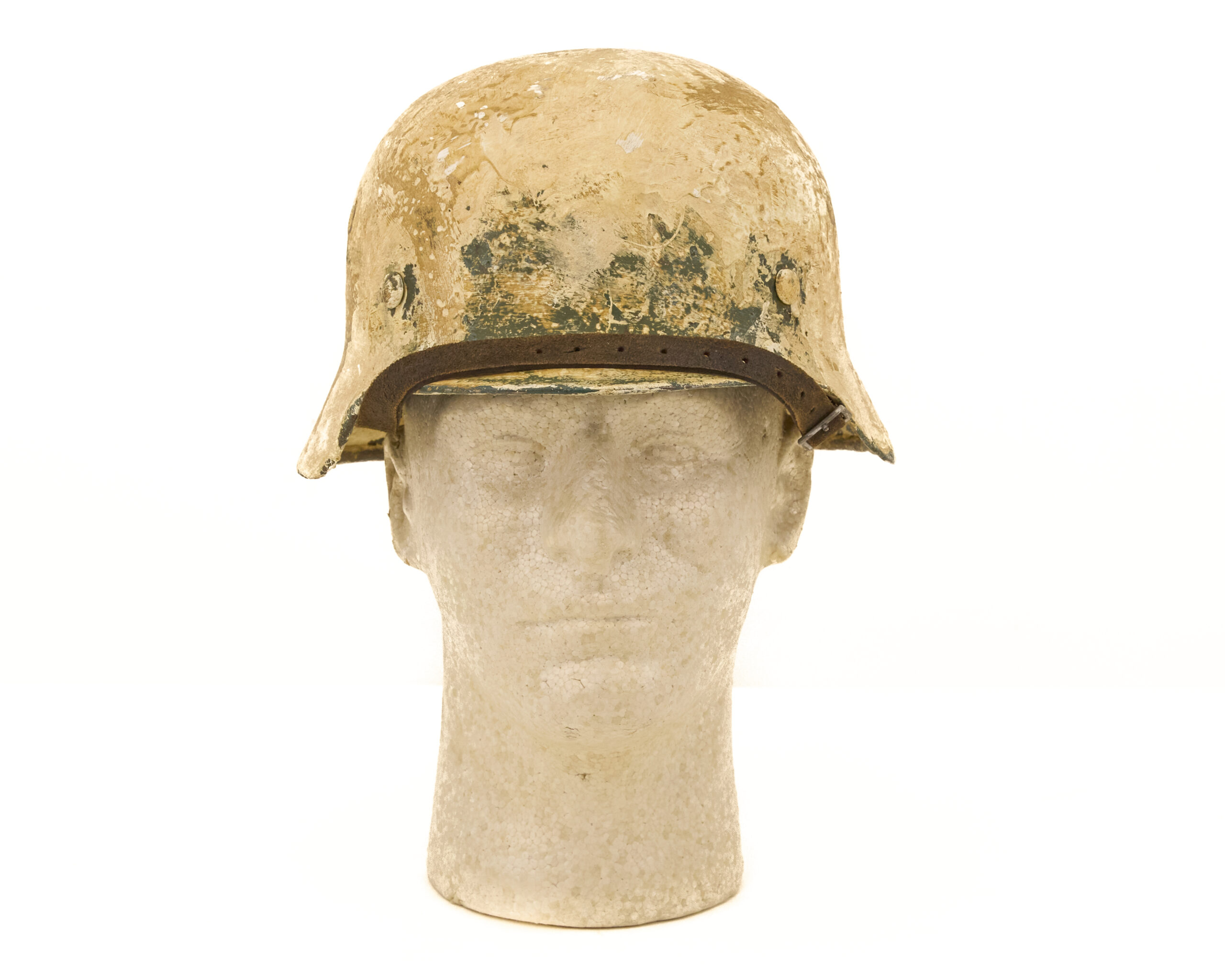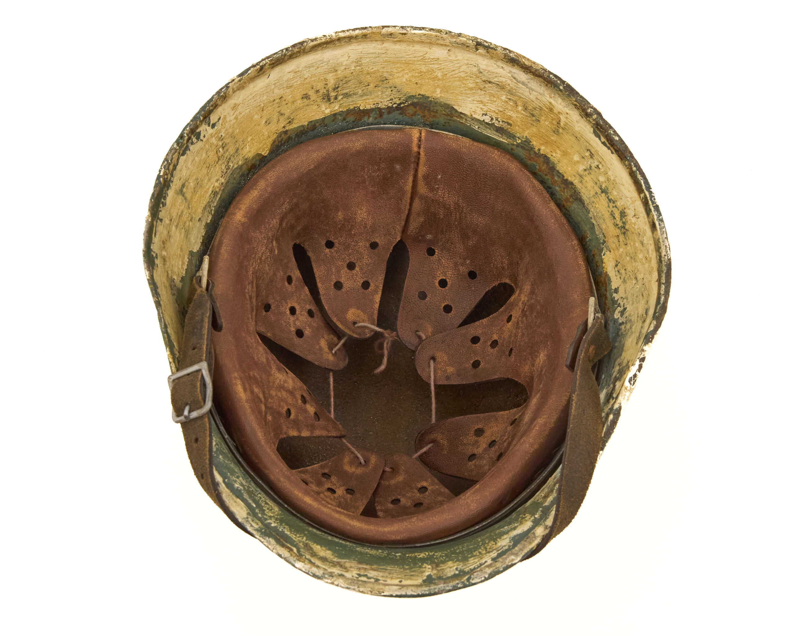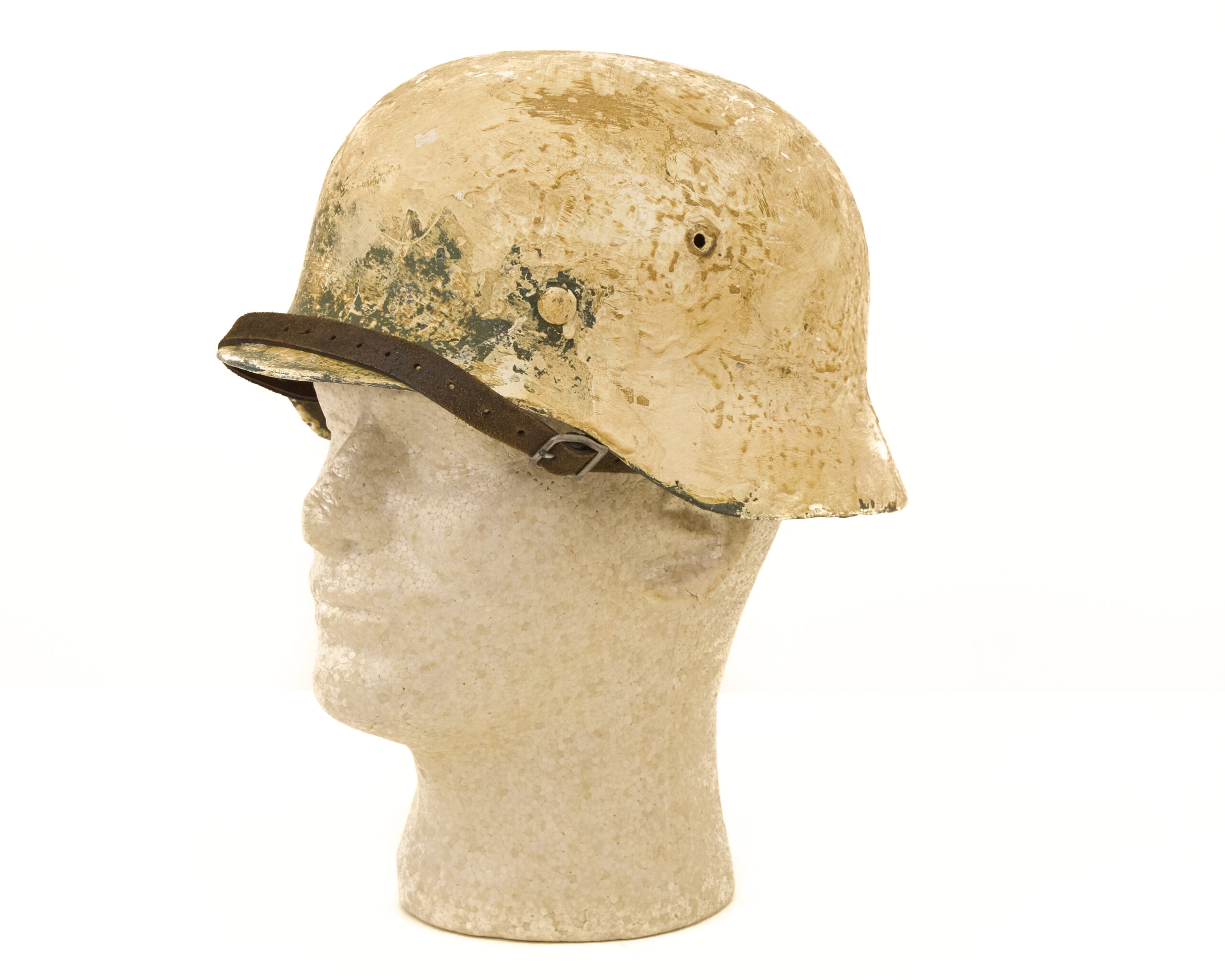 Finish has been carefully executed to resemble period paint schemes. The interior retains a factory-style green finish, consistent with original German production methods, while the exterior features a mottled off white camouflage paint, representative of field-applied finishes commonly seen in certain theaters, particularly where concealment in winter or tundra environments was required. The overall appearance reflects the practical, utilitarian nature of wartime helmet camouflage rather than a factory-applied decorative finish.