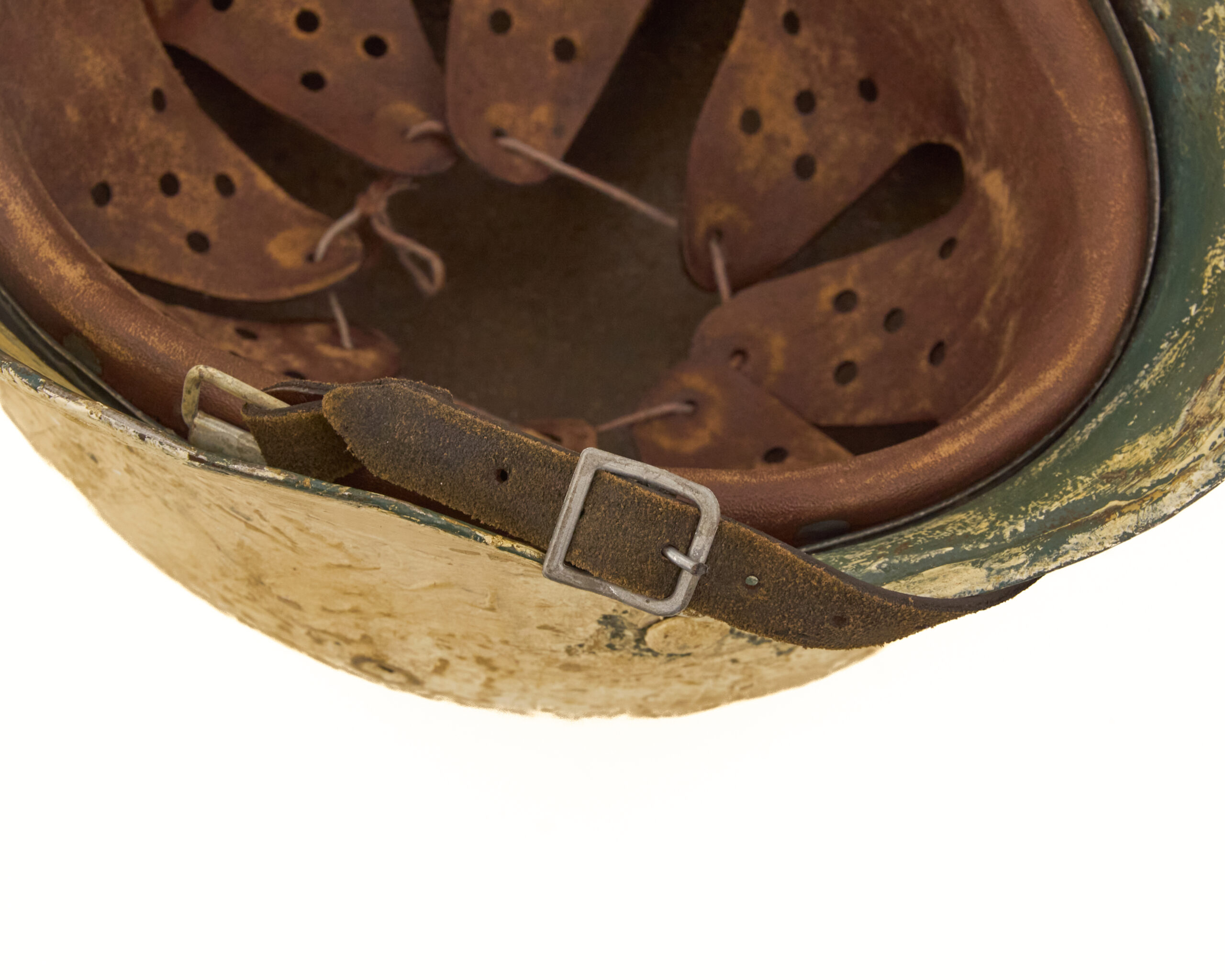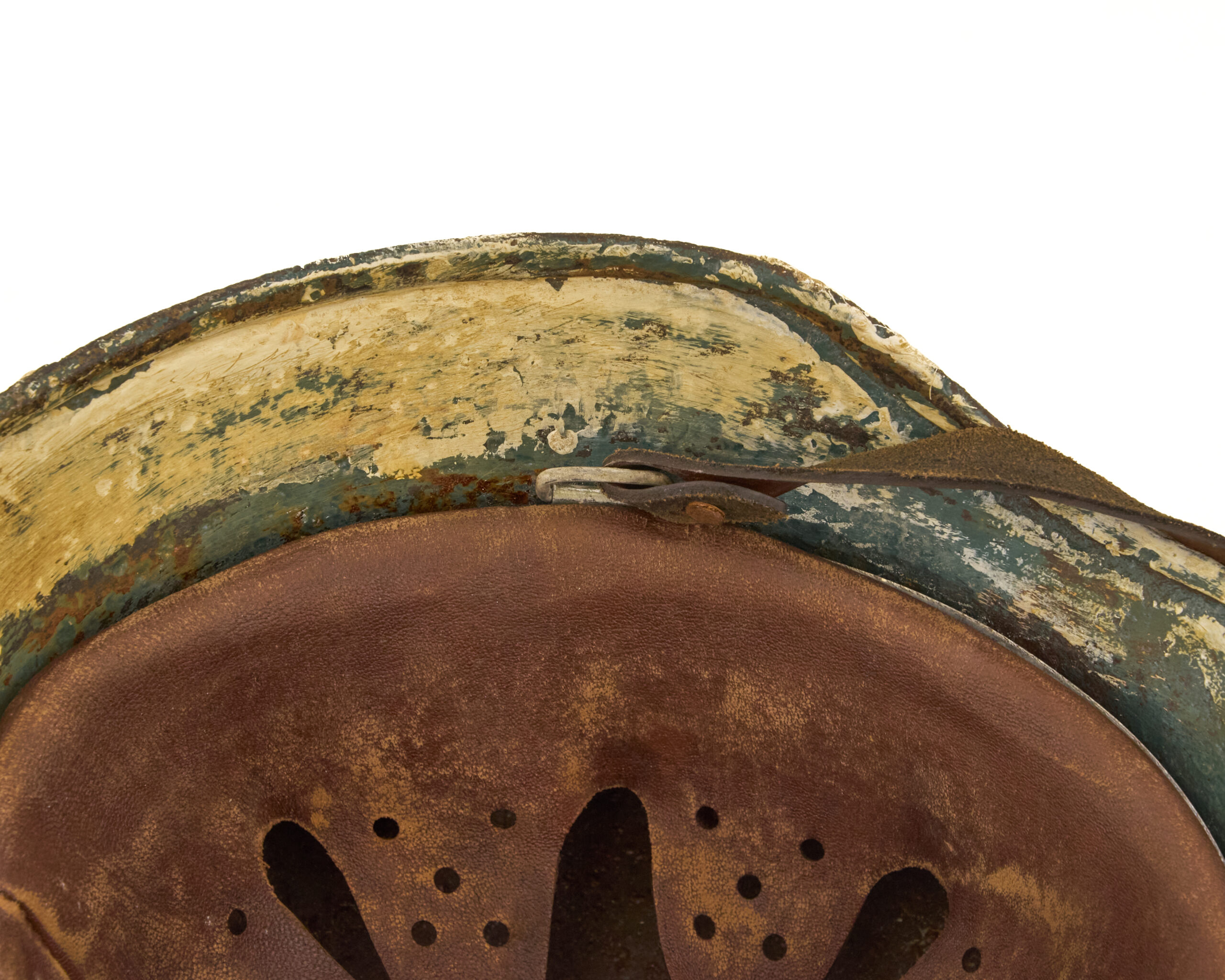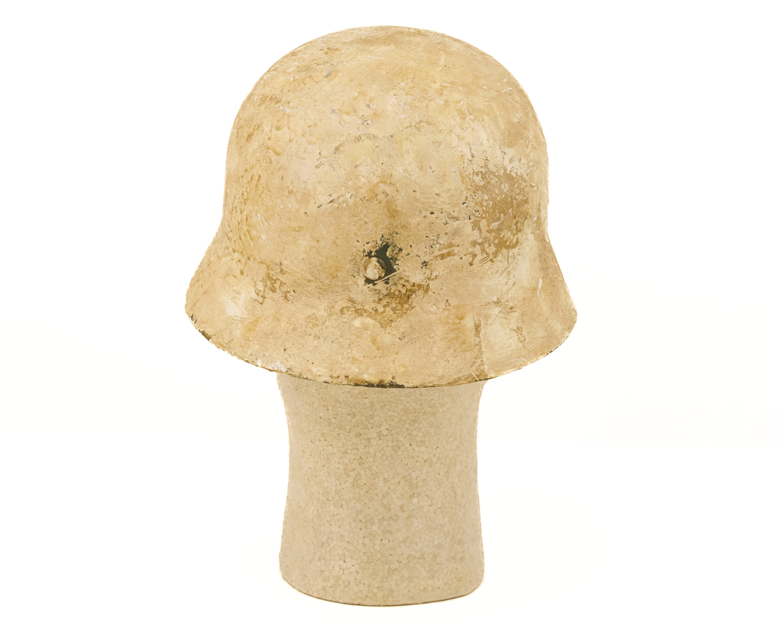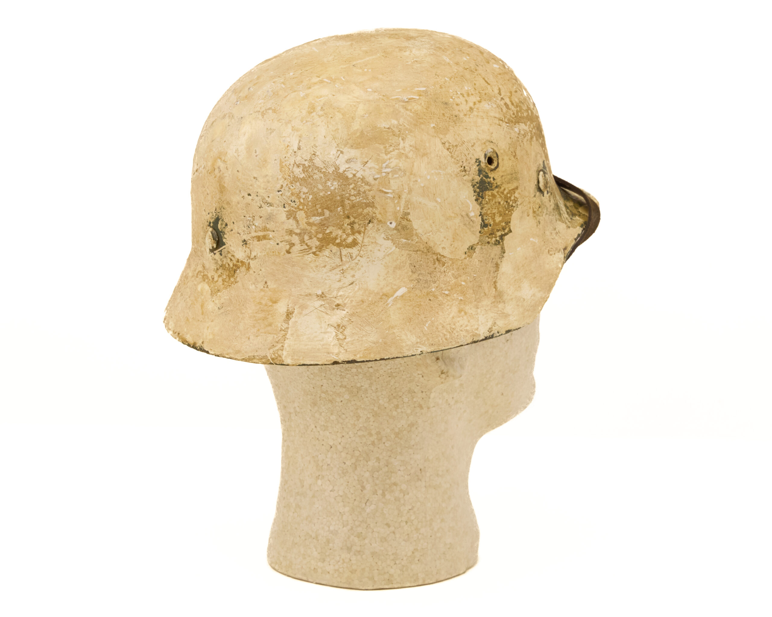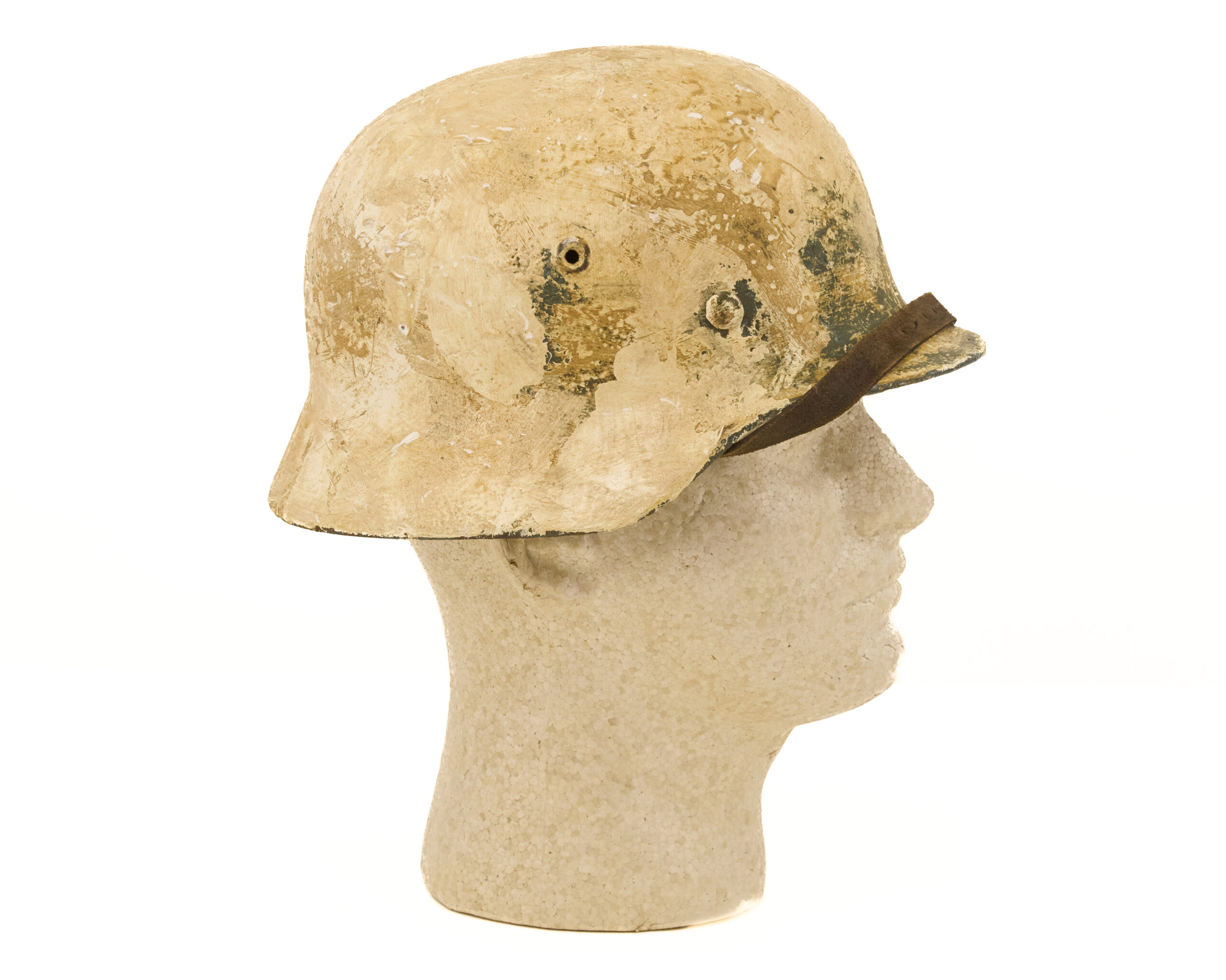 Finish has been carefully executed to resemble period paint schemes. The interior retains a factory-style green finish, consistent with original German production methods, while the exterior features a mottled off white camouflage paint, representative of field-applied finishes commonly seen in certain theaters, particularly where concealment in winter or tundra environments was required. The overall appearance reflects the practical, utilitarian nature of wartime helmet camouflage rather than a factory-applied decorative finish.