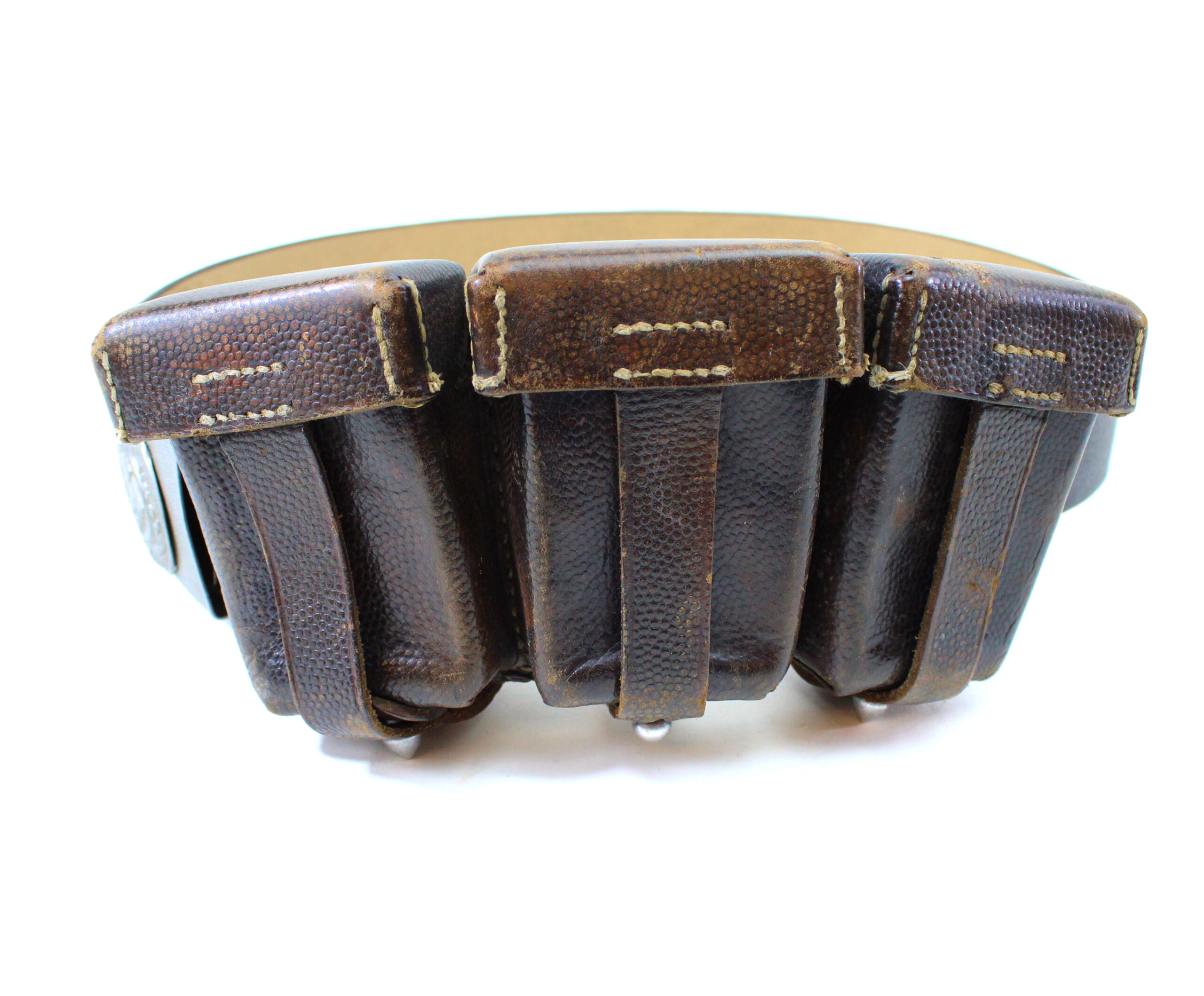 Authentic WWII German Police (Ordnungspolizei) belt set, consisting of a black leather belt with aluminum buckle and a German K98 Mauser ammo pouch, maker-marked Lagesa 1936.