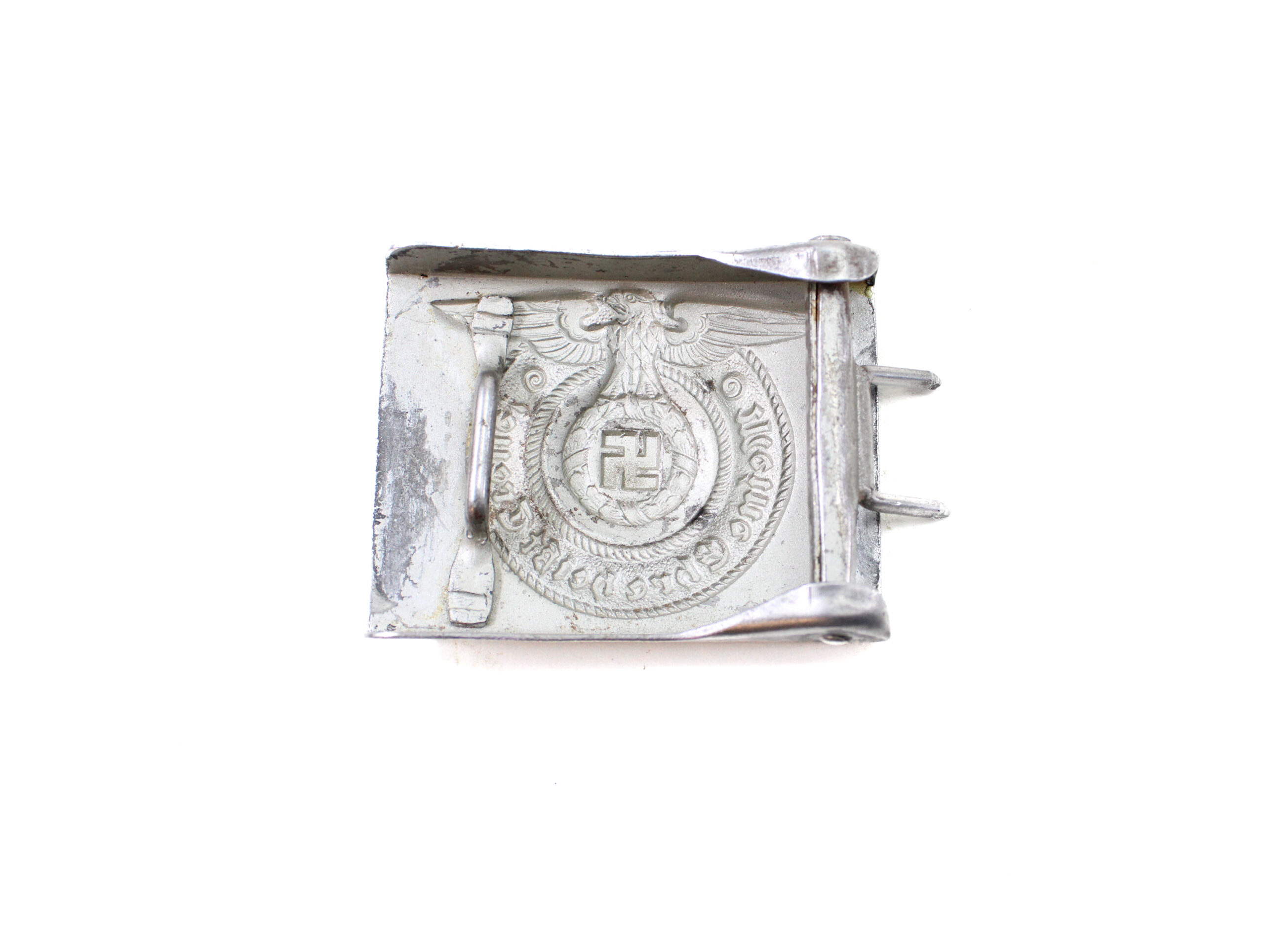 This example is unmarked, which was not uncommon during the war, as several manufacturers supplied buckles without maker codes. The steel construction with painted finish was a later-war adaptation, replacing earlier nickel and aluminum types, to save on strategic materials and streamline production.