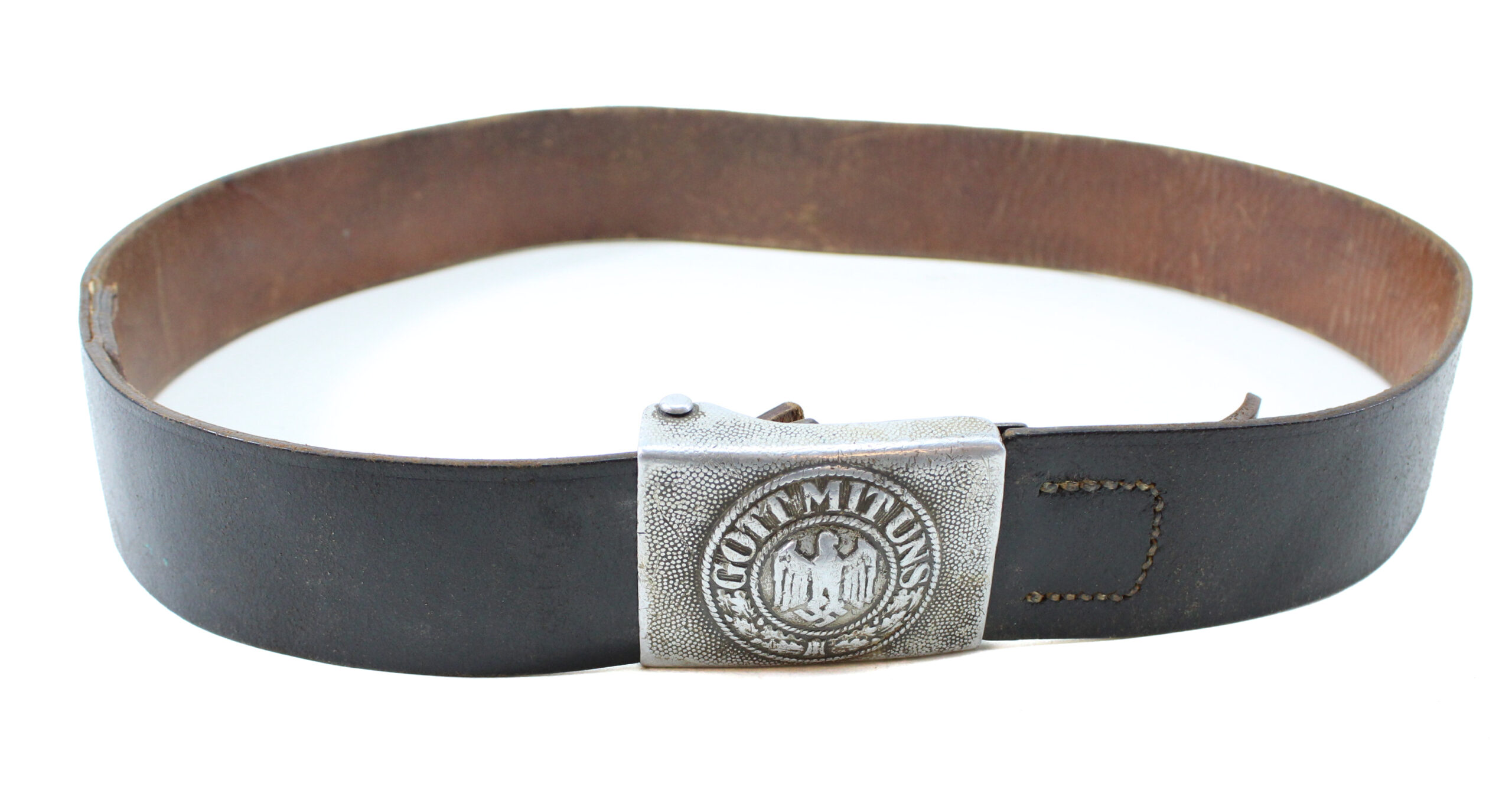 Authentic WWII German Army (Heer) enlisted man’s and NCO’s black leather belt, complete with its regulation pebbled aluminum buckle, manufactured by Richard Sieper & Söhne, Lüdenscheid.