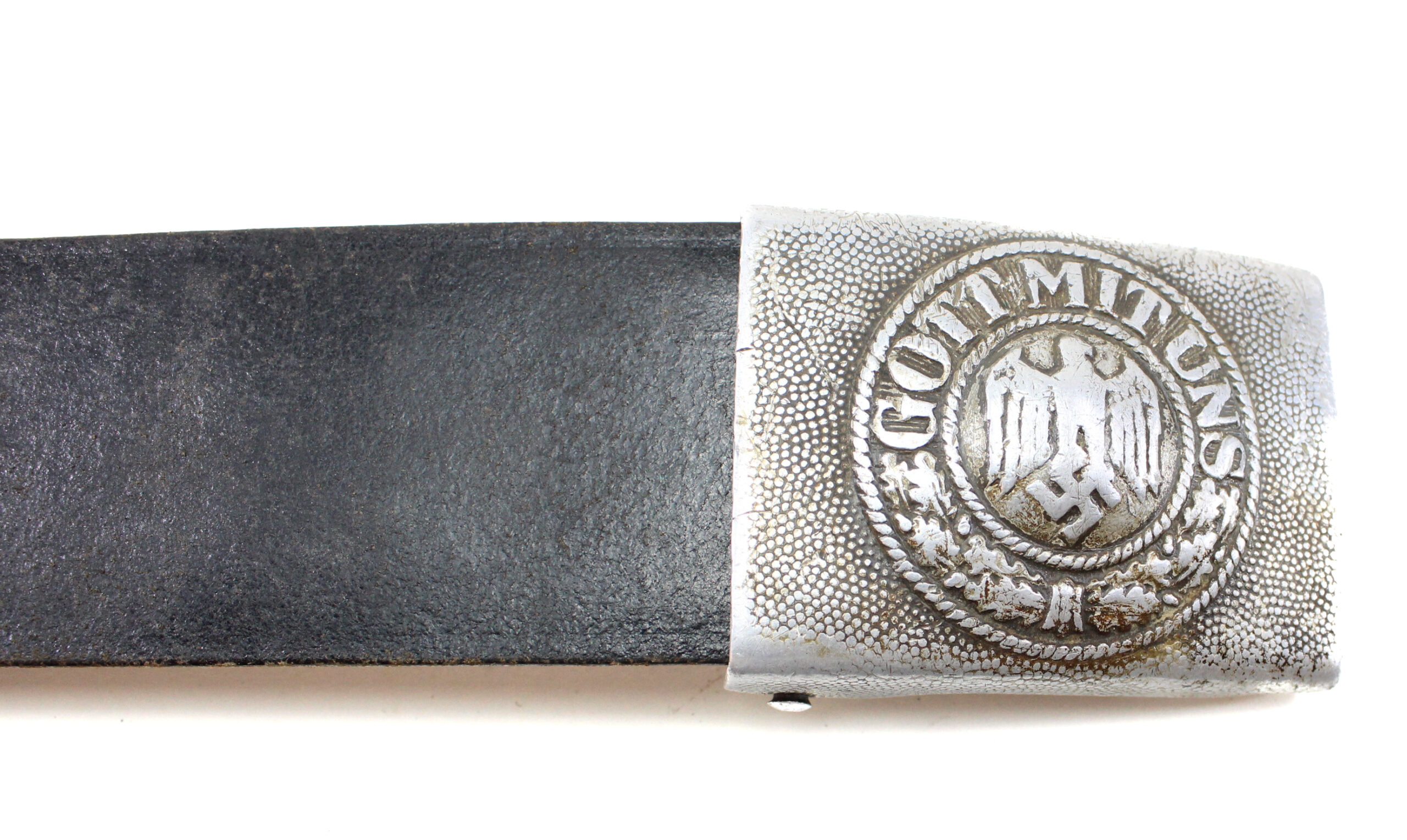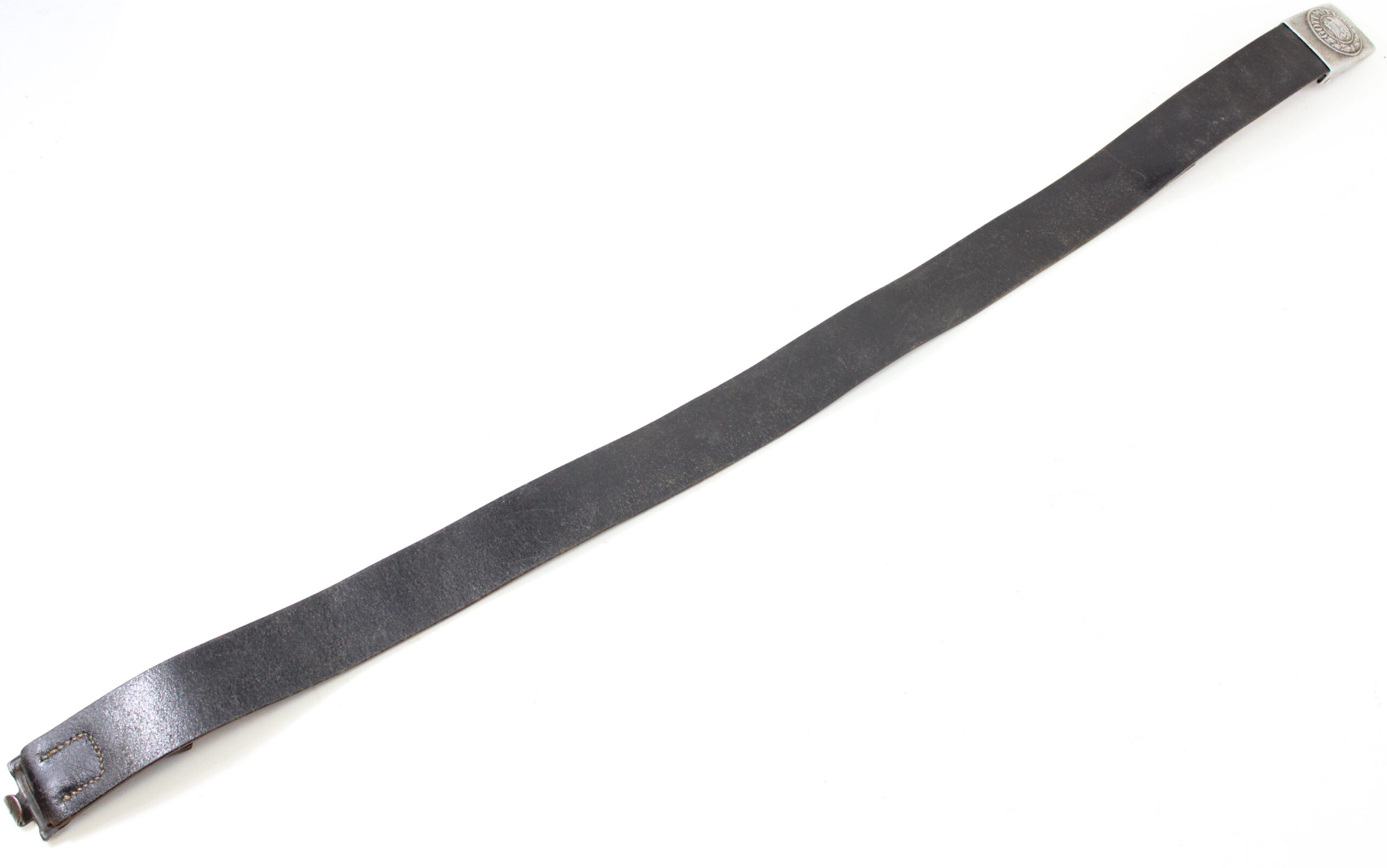The belt is constructed of black leather, regulation width, with fastening clip and adjustment holes. The use of aluminum construction places this buckle in the early- to mid-war period, prior to the later-war switch to steel buckles.