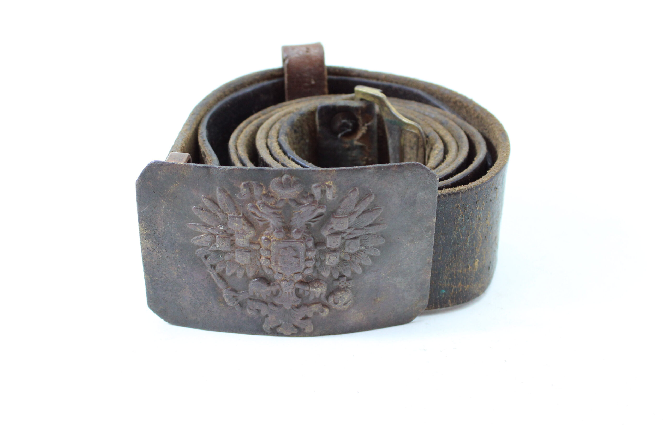 A fine piece of militaria from the late Tsarist era, this buckle and belt combination would have been worn by Imperial Russian enlisted men during the First World War. Its rugged construction and historical symbolism make it an exceptional addition for collectors of WWI or Imperial Russian militaria.