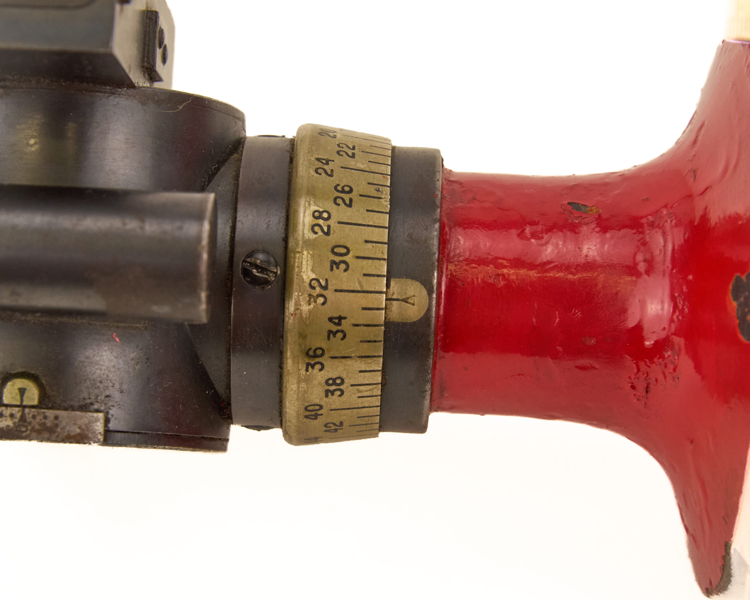 The instrument is a panoramic telescopic gun sight, designed for indirect artillery fire and precision laying. Rundblickfernrohre allowed gunners to engage targets outside the direct line of sight by referencing calibrated bearings and elevation settings. This example features dual adjustment knobs for both traverse and elevation, enabling precise “dialing in” of artillery fire. A slit collimator mounted on the upper right aids in alignment and verification of the sight’s orientation, a critical feature for accurate battery-level fire control.