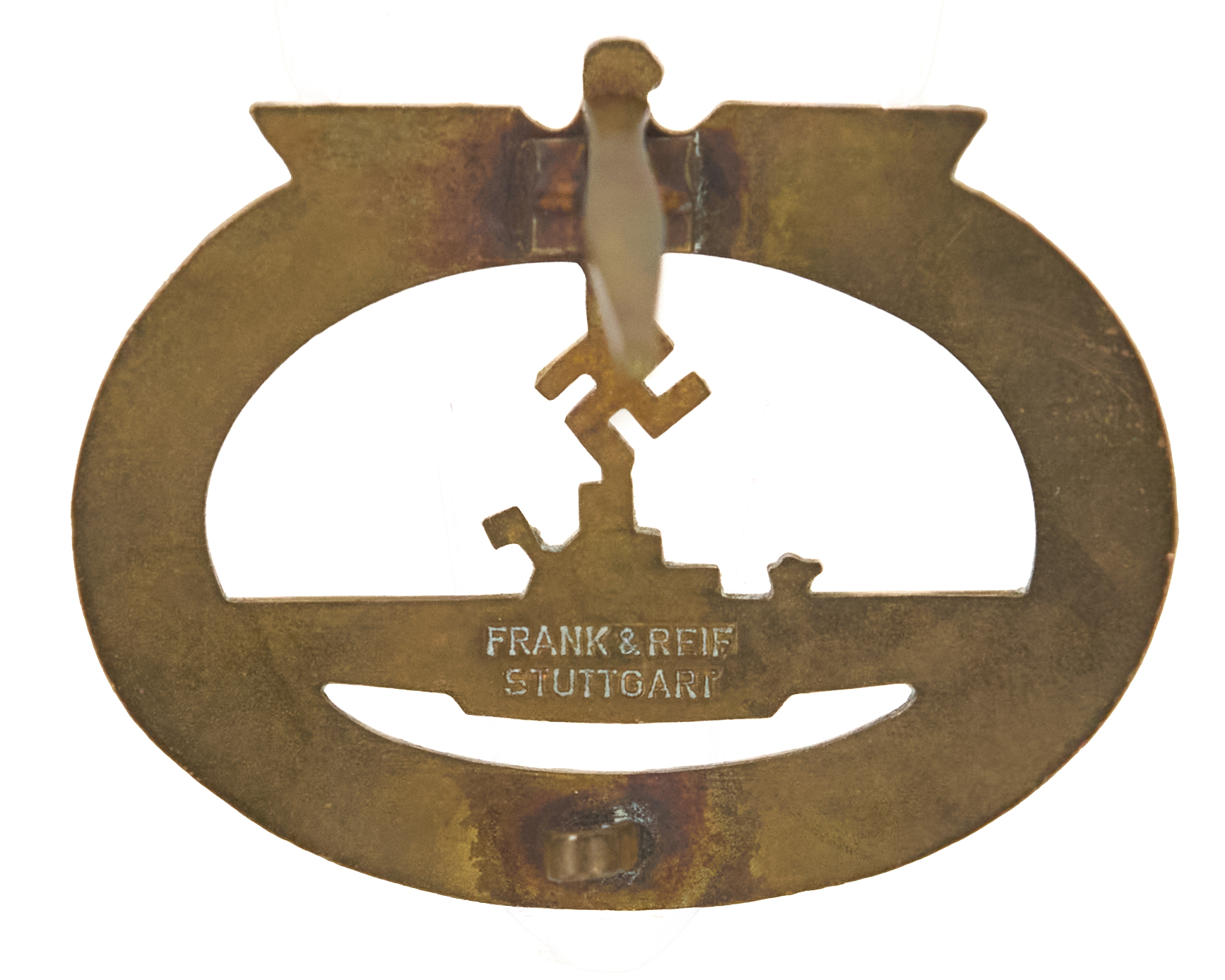 Construction and detailing are consistent with authentic wartime manufacture, with strong definition visible in the wreath, eagle, and hull contours. The reverse is correctly marked “Frank & Reif, Stuttgart”, confirming originality and maker attribution.