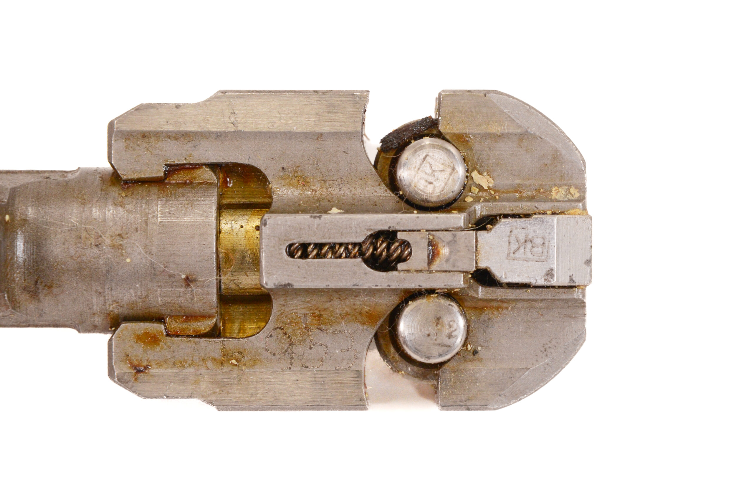 The assembly is complete with bolt body, locking lugs, firing pin, extractor, and associated small parts as shown. Metal surfaces display service-appropriate wear, handling marks, and patina consistent with genuine military use; critical bearing and locking faces remain straight and without bending. Heat-treated surfaces and hardening on contact areas are intact. Any proof, part, or inspector markings present will be photographed and documented on request.