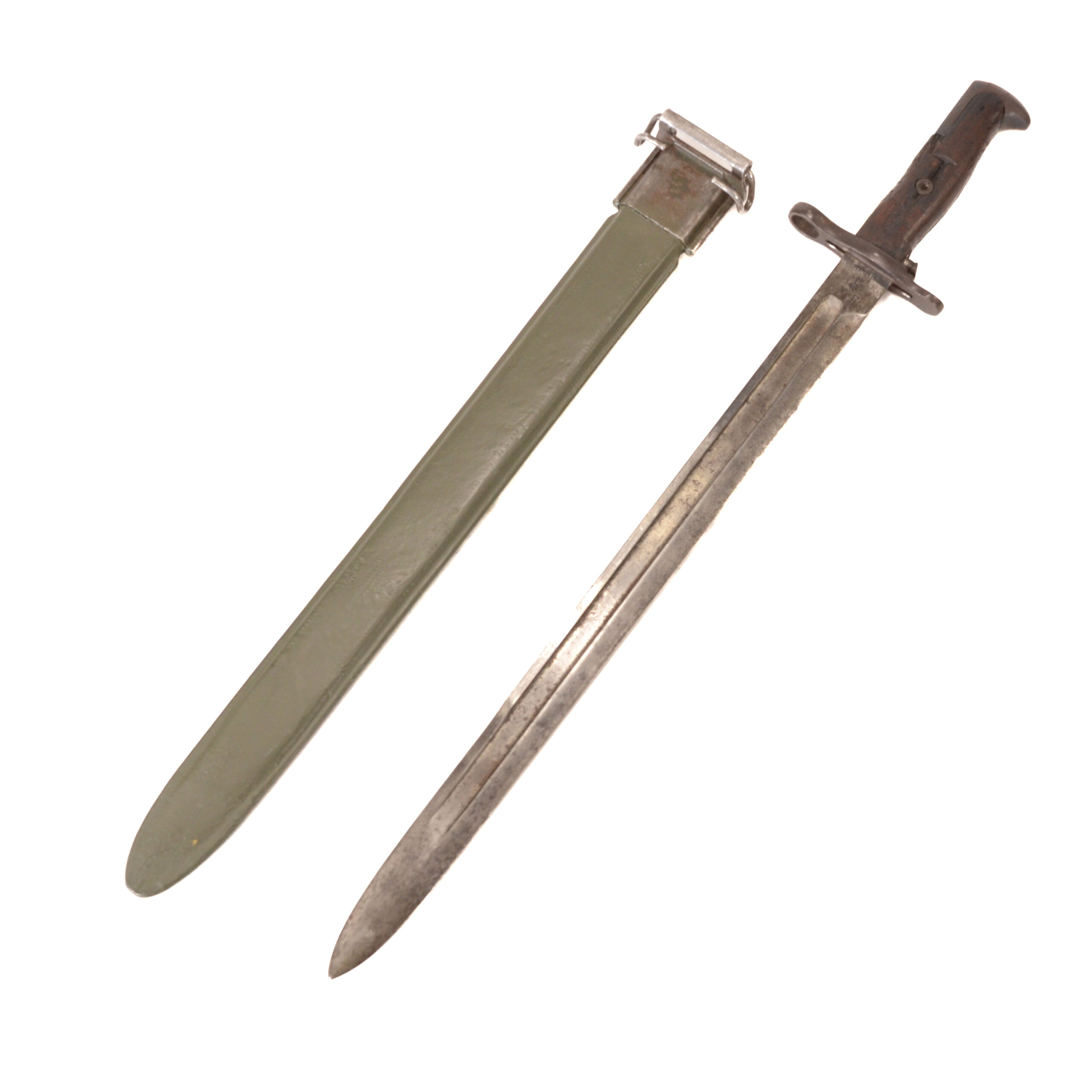 Keywords: US M1905 bayonet, M3 bayonet scabbard, Springfield rifle bayonet, collectible U.S. military weapon, historical WWI WWII bayonet.
