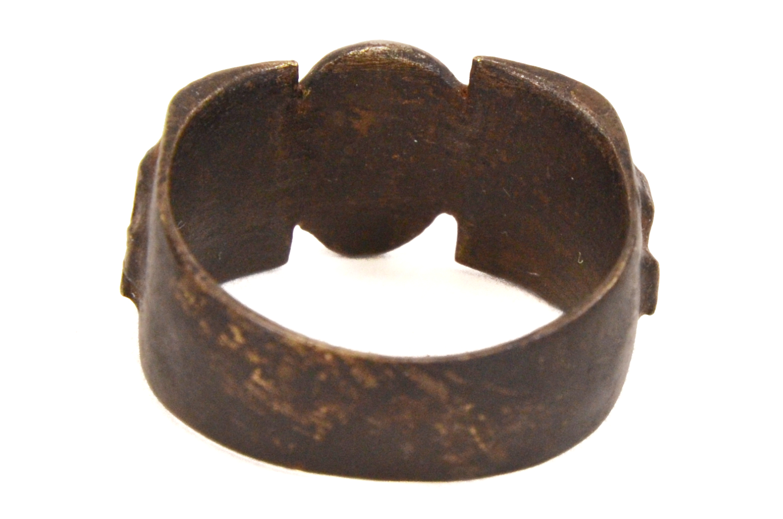 This example is a private purchase ring patterned after the SS Totenkopf (death’s head) honor ring, featuring the iconic skull motif at the front flanked by engraved Iron Cross and rune-style details. The ring shows authentic period wear and patina, with age-appropriate oxidation visible across the band and recesses.